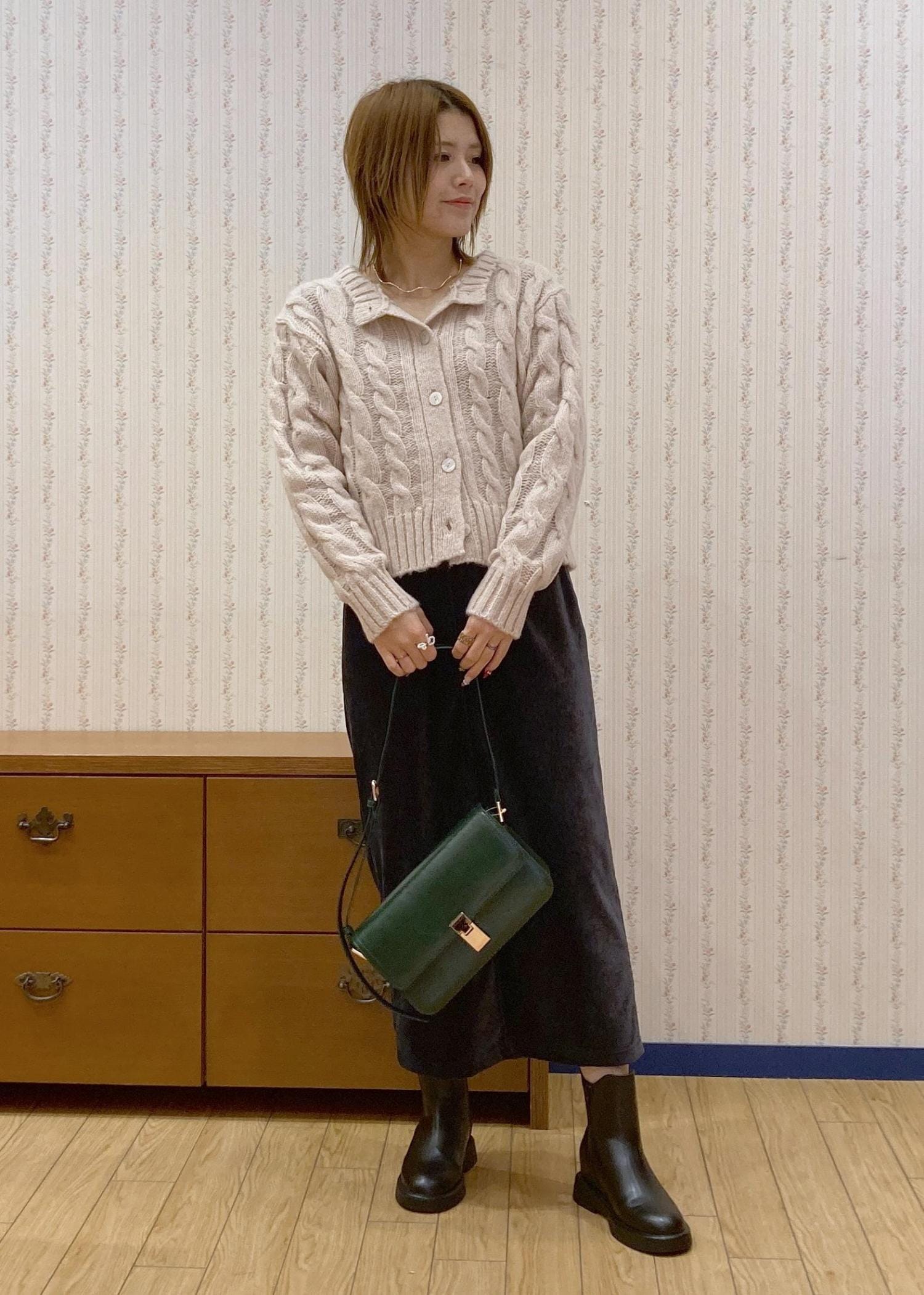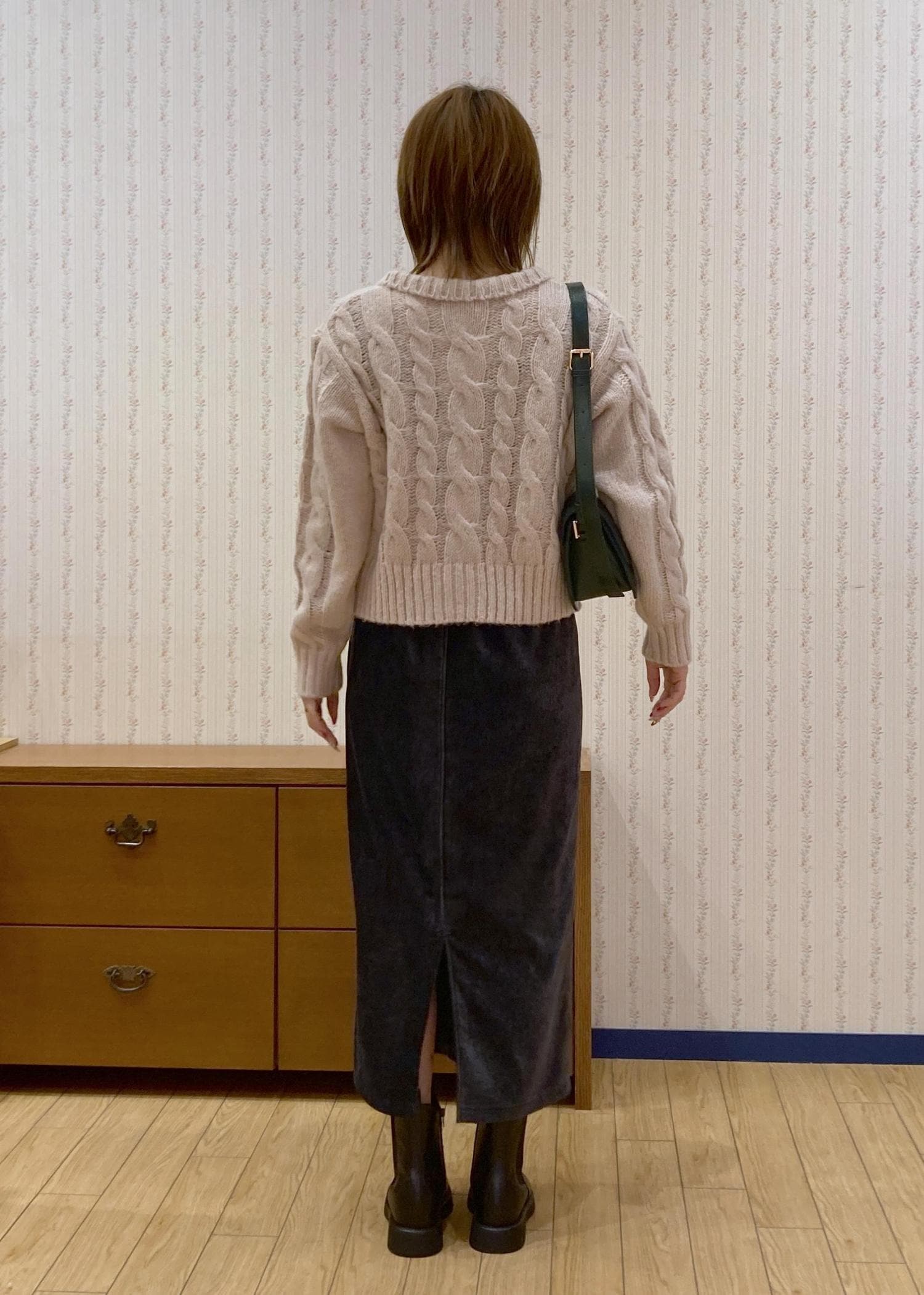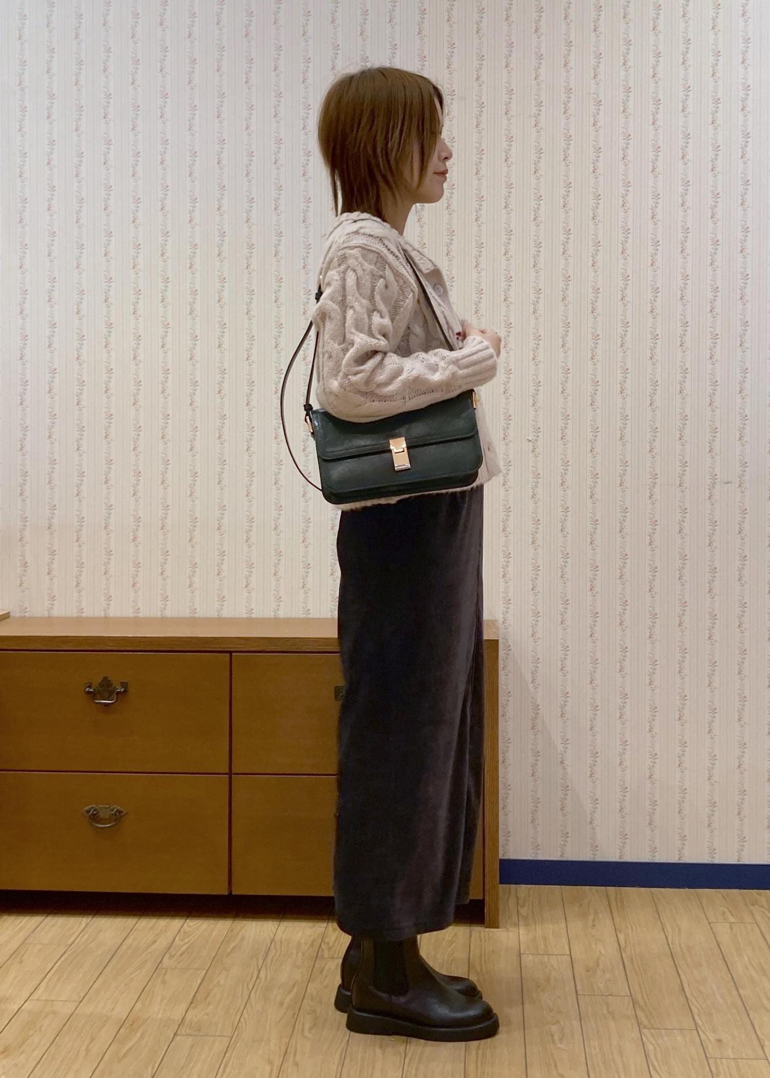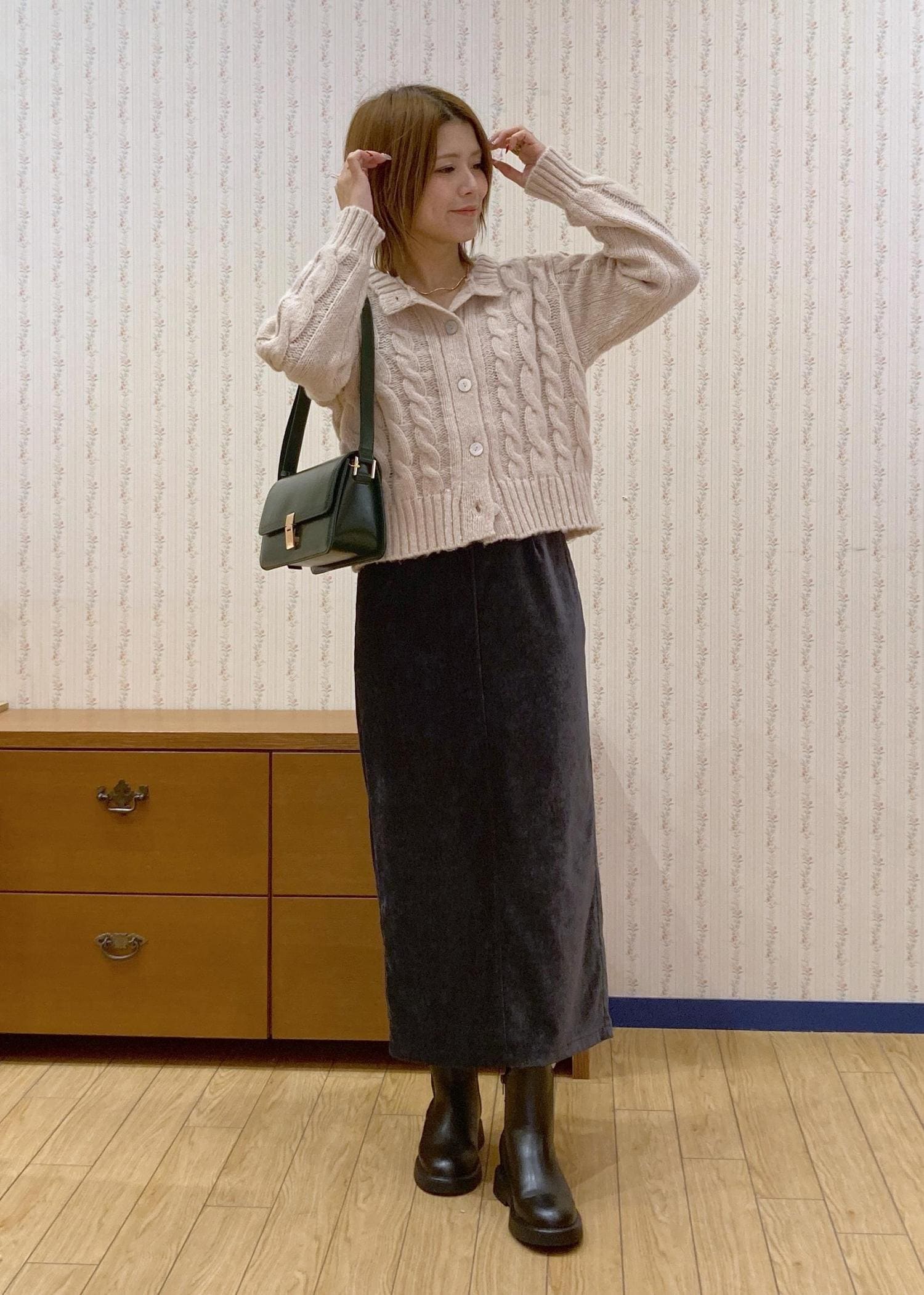 縦のラインを意識したスッキリ見えするコーディネートですがスカートは後ろゴムで履き心地楽ちんなので年末年始のお出かけにもおすすめです!