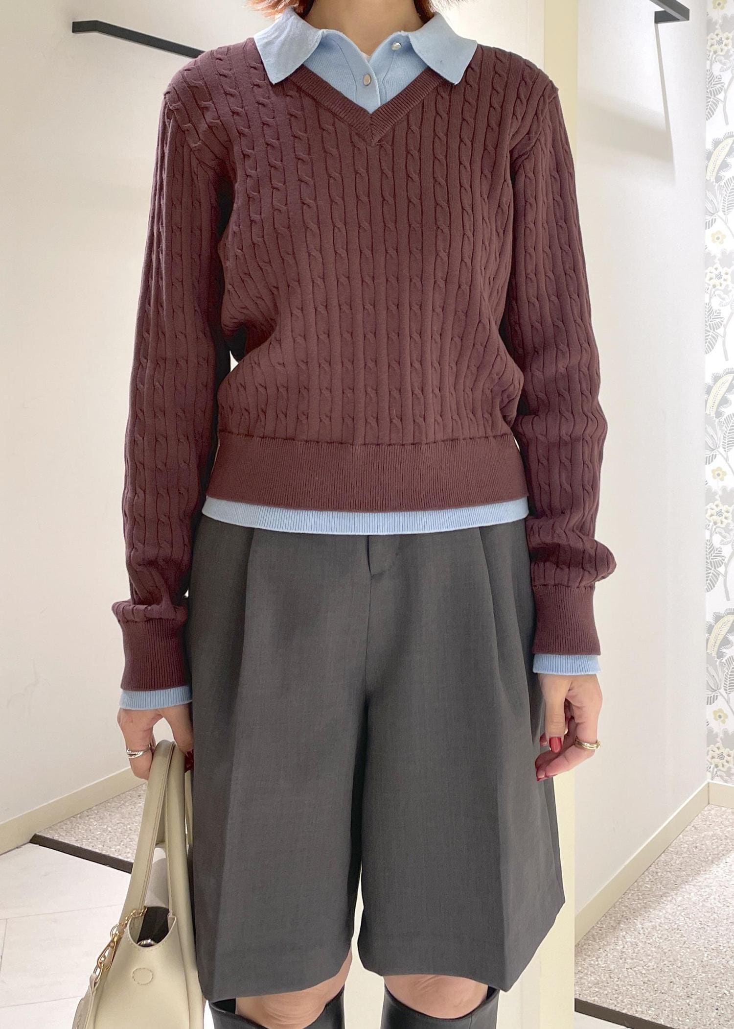 着るだけで着映えする配色ニットにハーフパンツを合わせたトレンド感のあるコーディネート