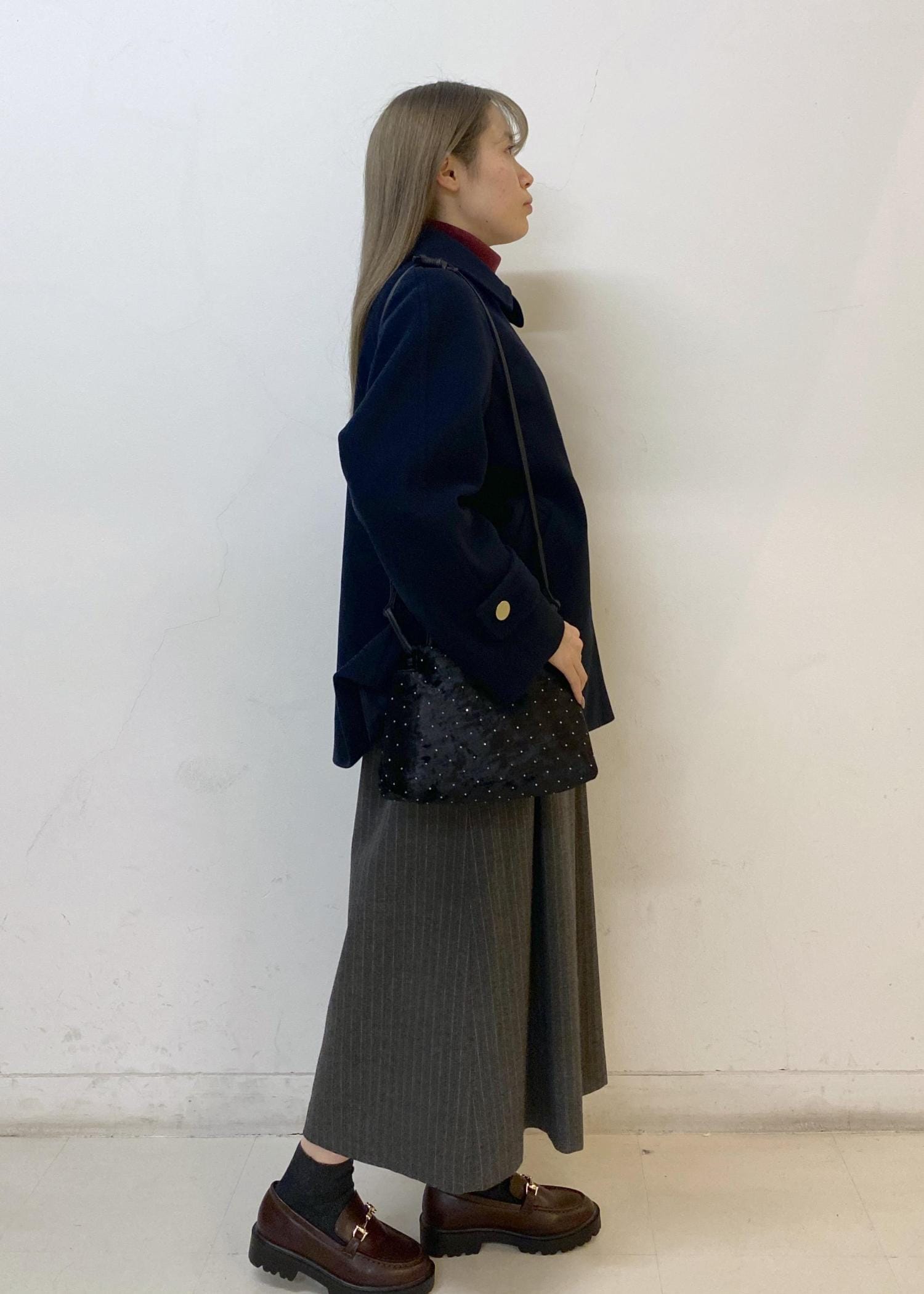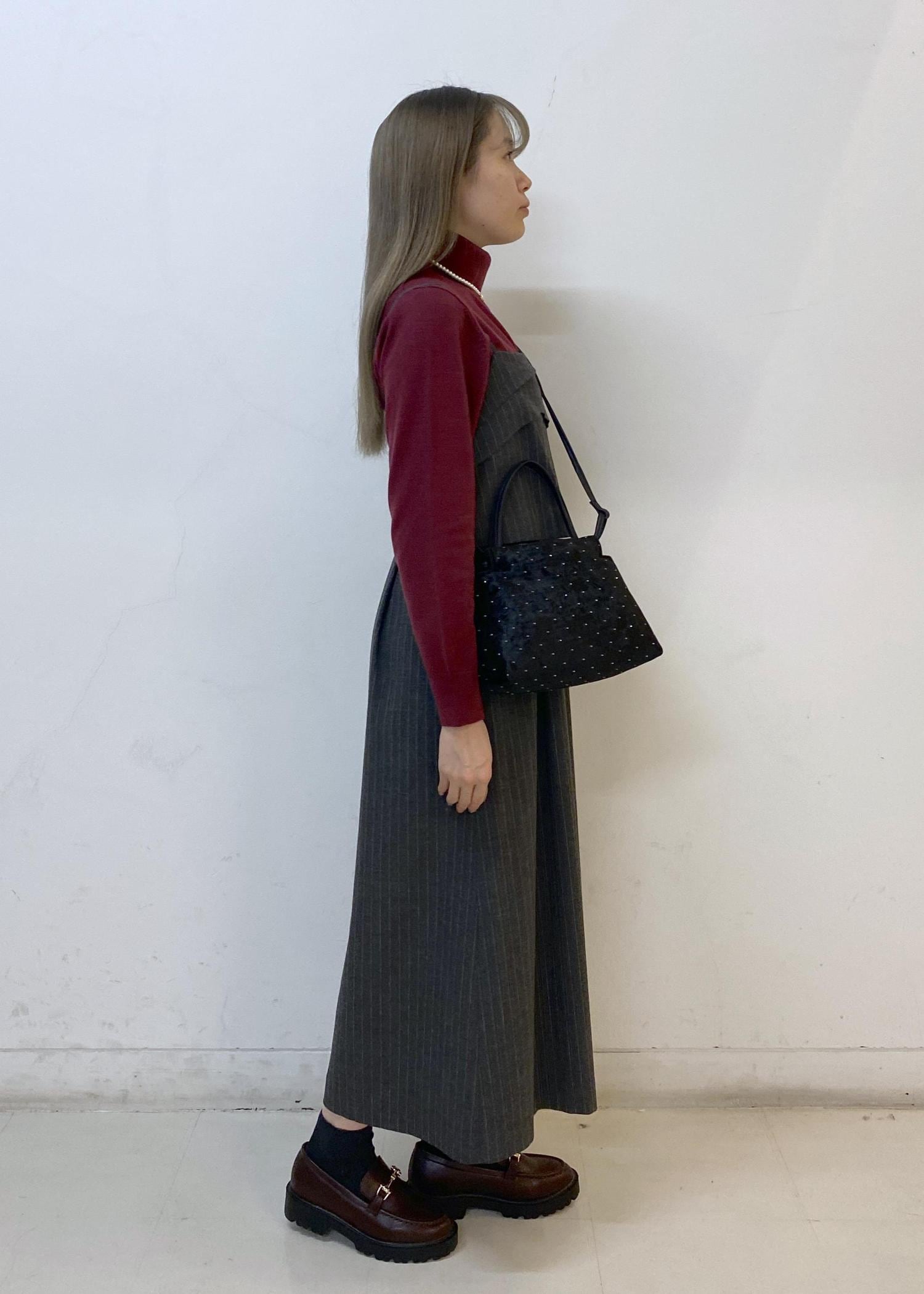 冬のホリデーを意識したカラーリングと、スタッズ付きのバッグがポイント!