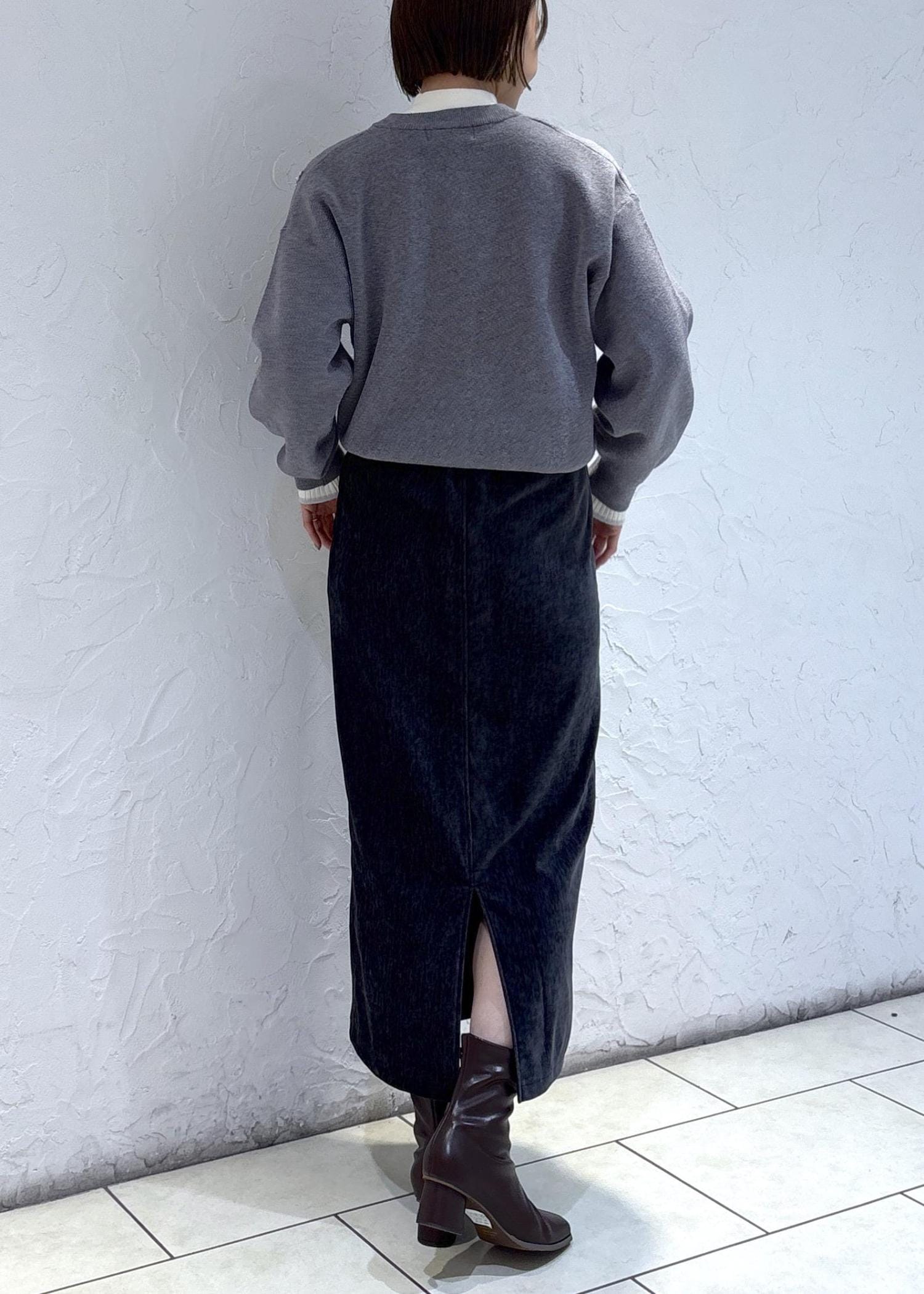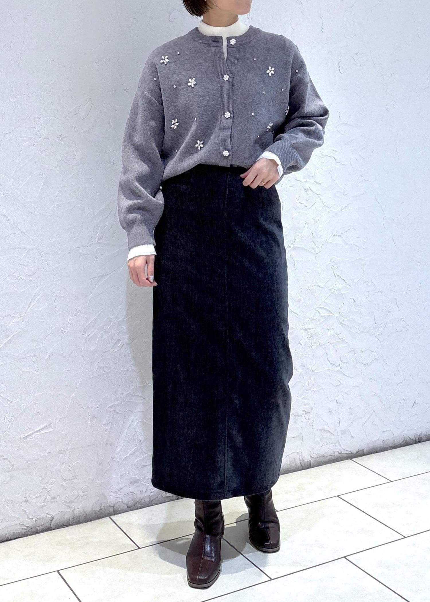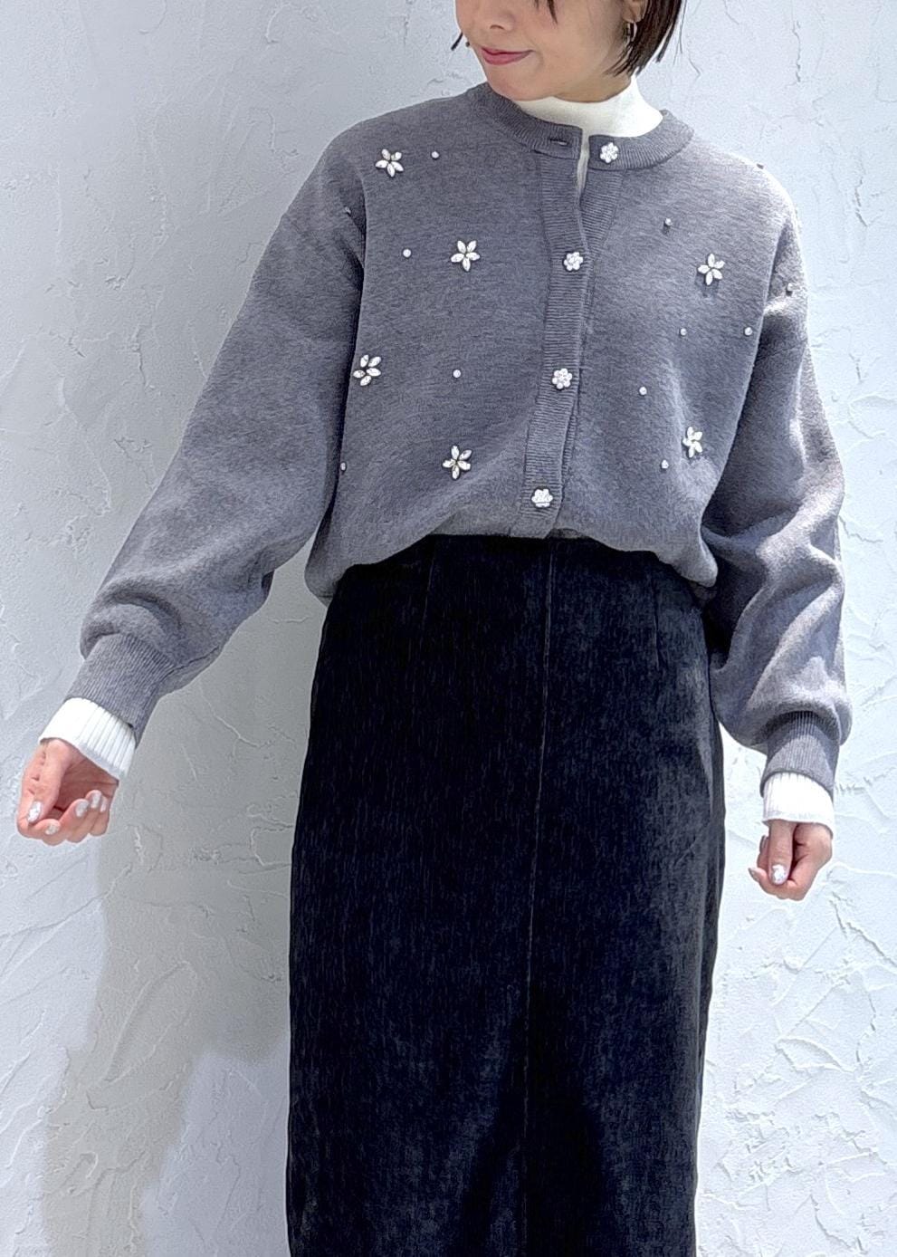ビジューカーディガンにアイラインスカートをあわせたグレーコーデ。