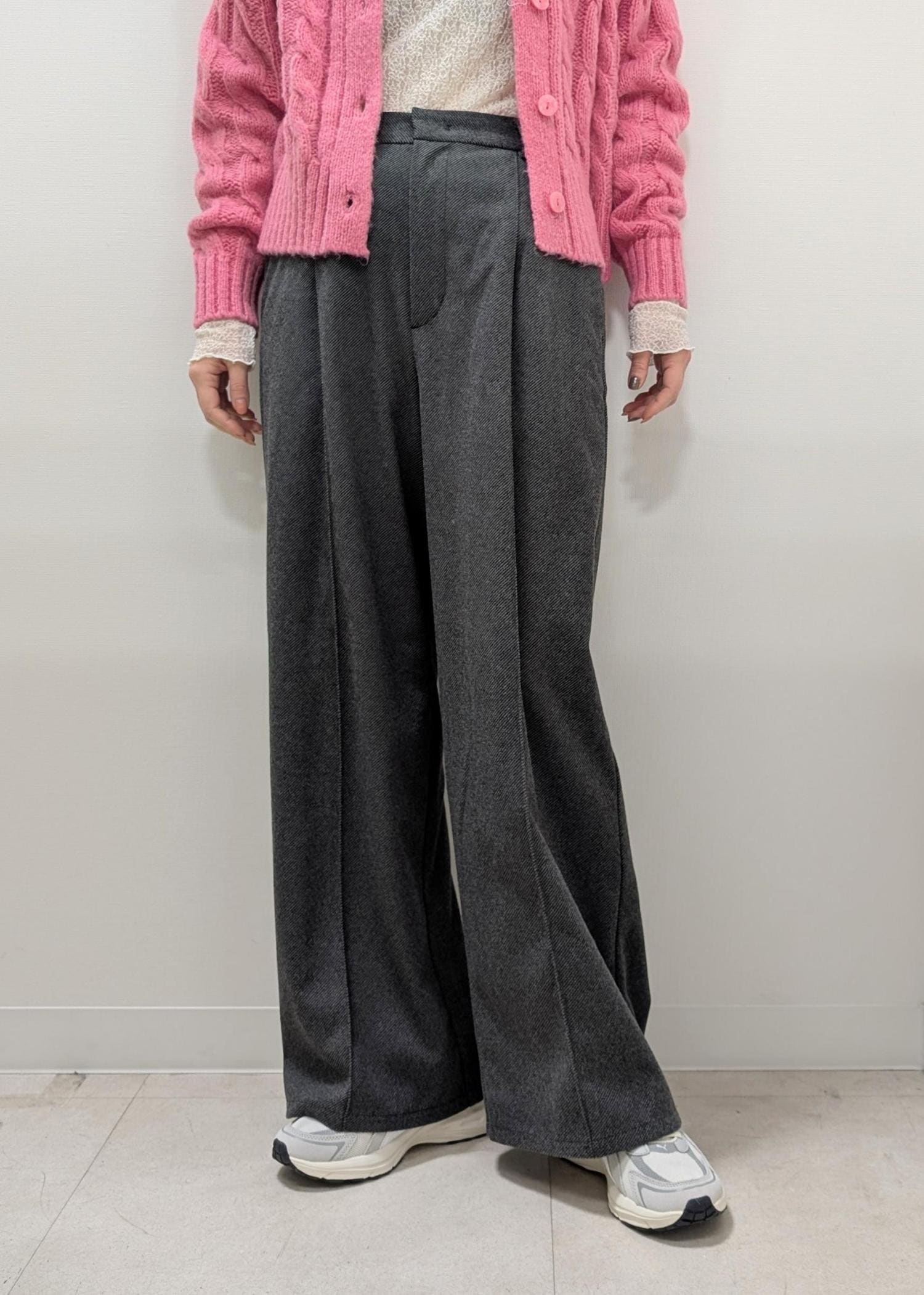 楽ちんシルエットでありながら、ボト厶をウール調のワイドパンツにすることでカジュアルながら大人っぽさもあるコーディネートです!