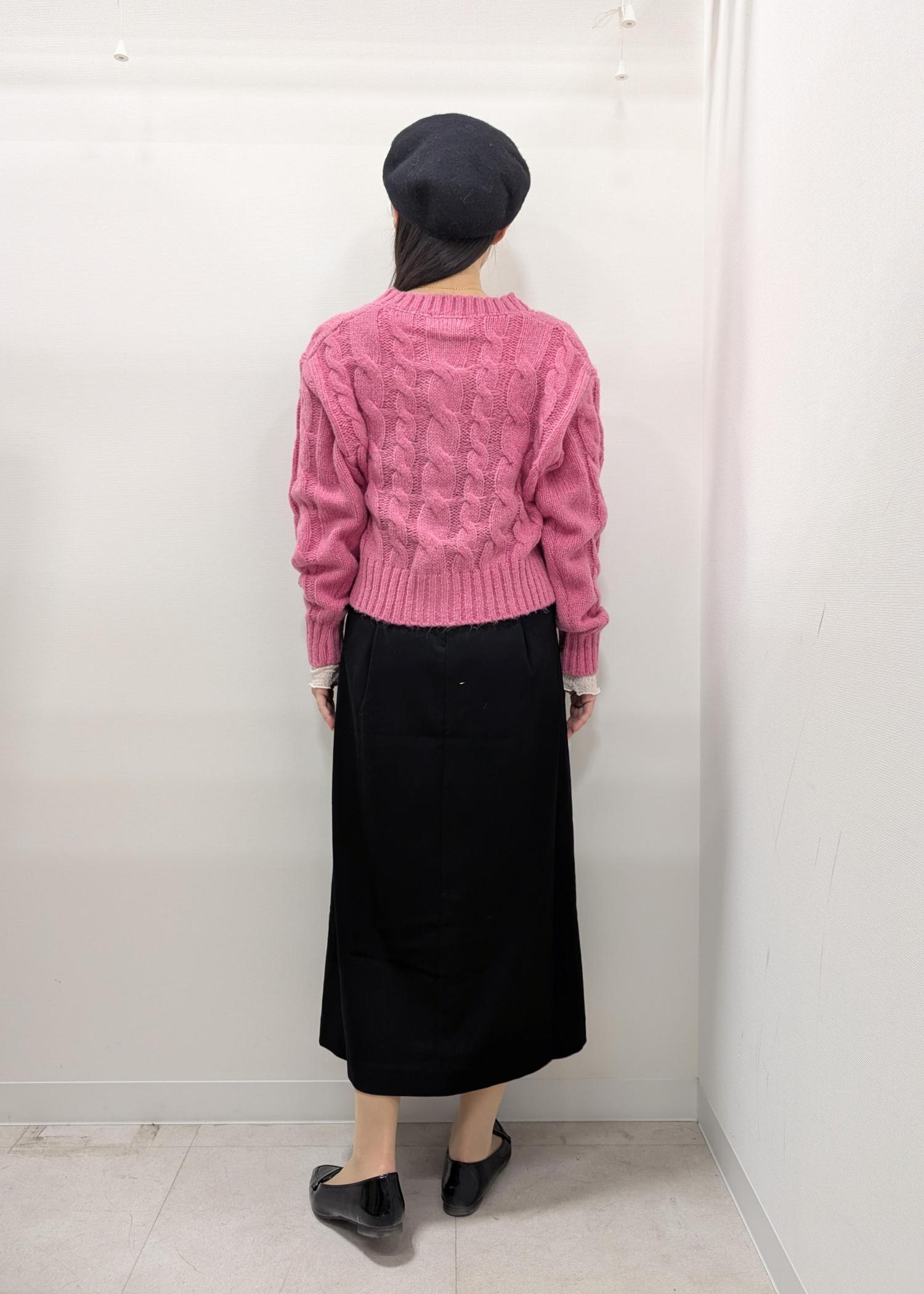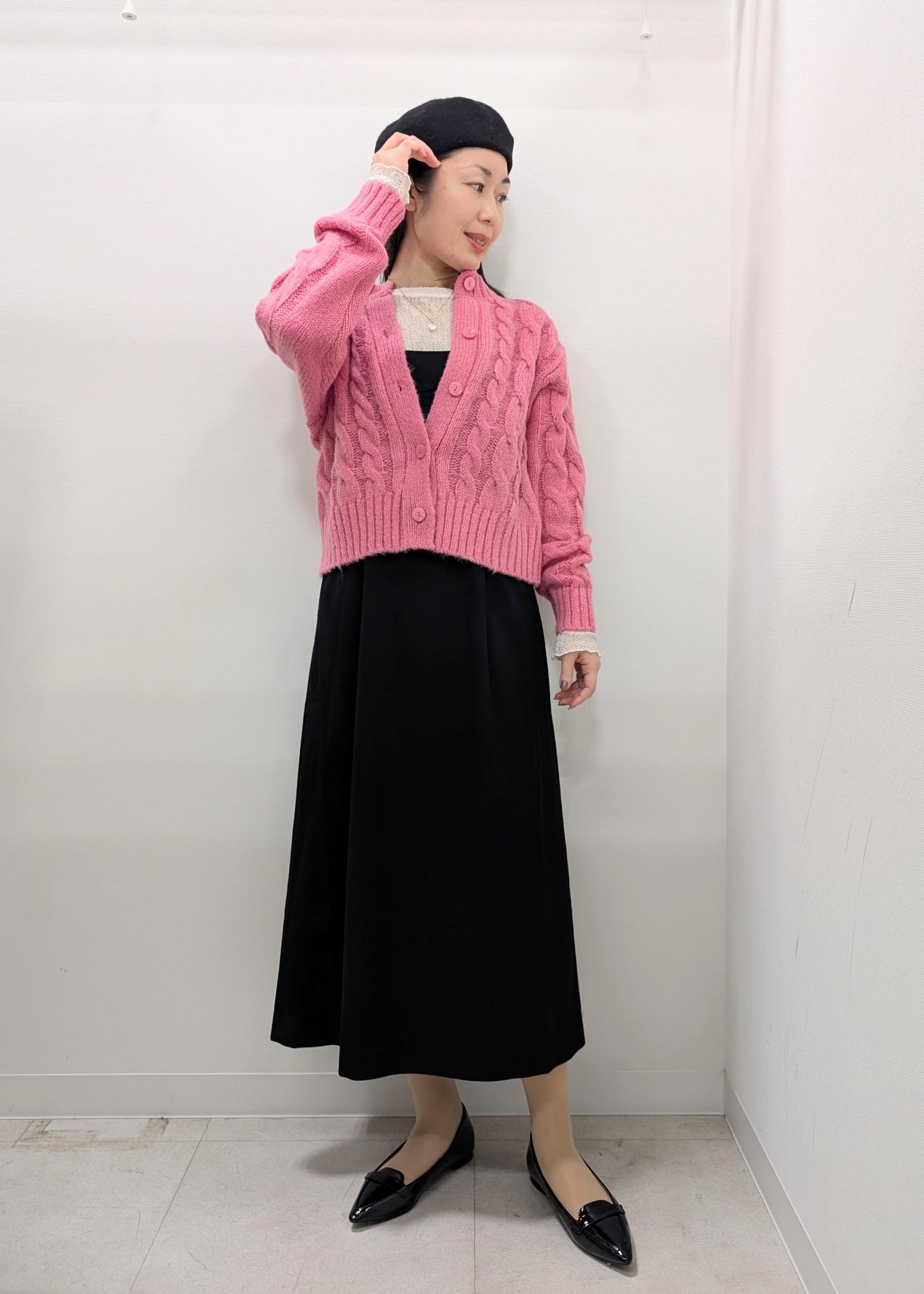 大人気のキャミワンピース。ピンク色のケーブルカーディガンを羽織り、ややカジュアルにコーディネートしました!