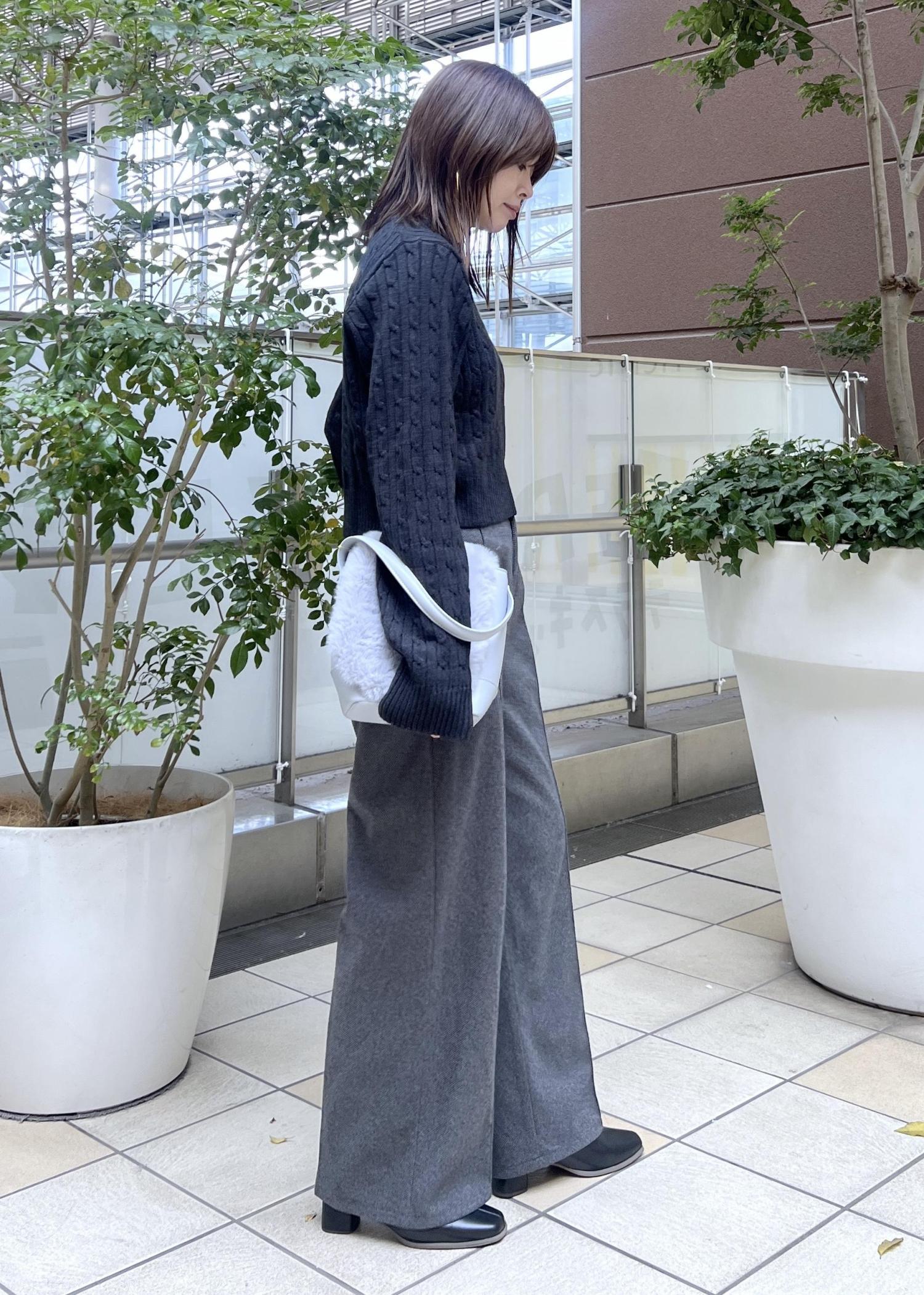 ブラックのコートのインナーは、グレーコーデで重たく見えないようにカラーをまとめました。