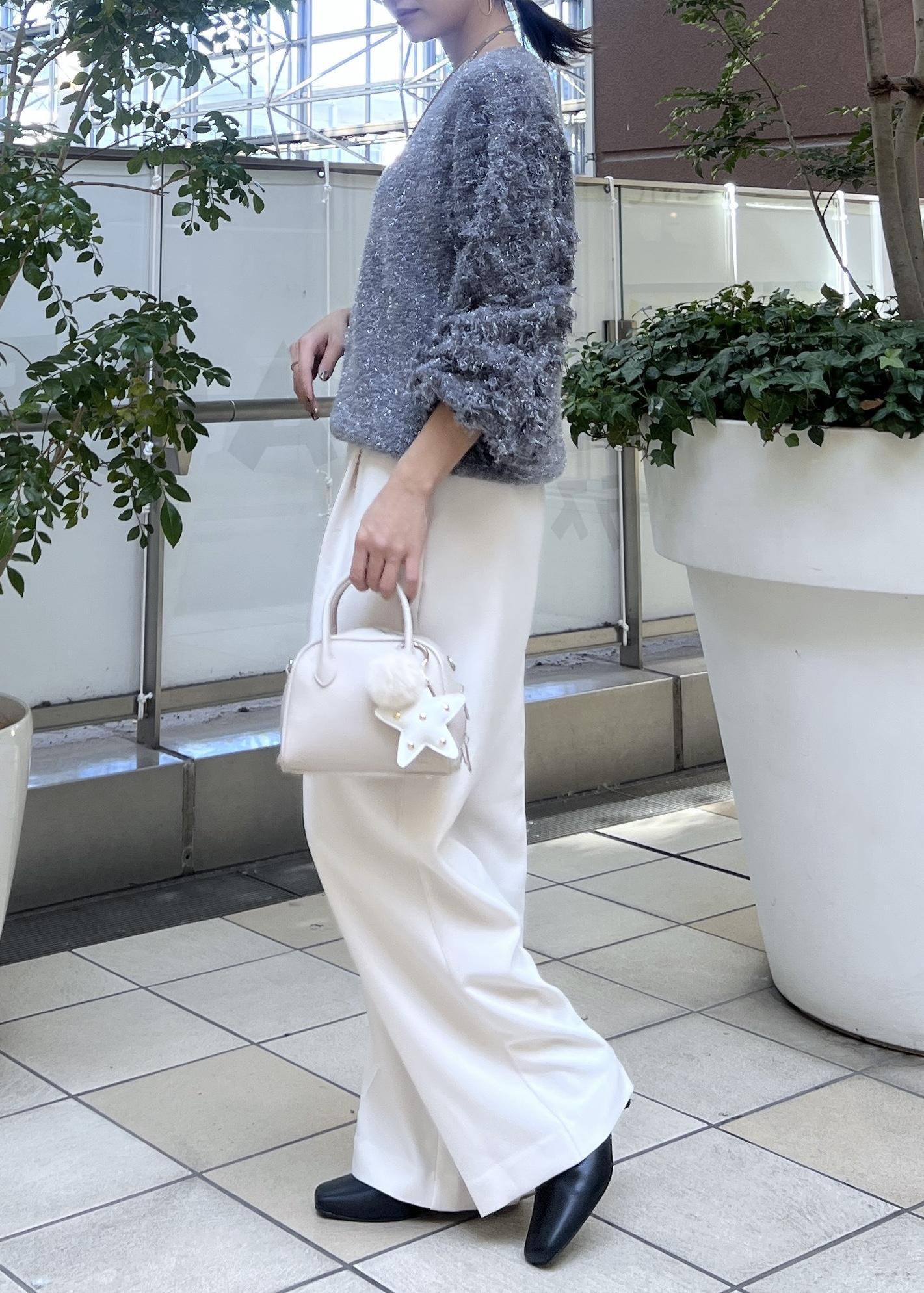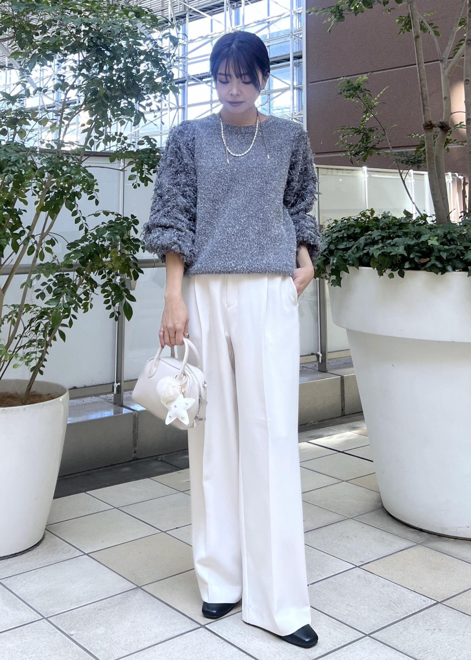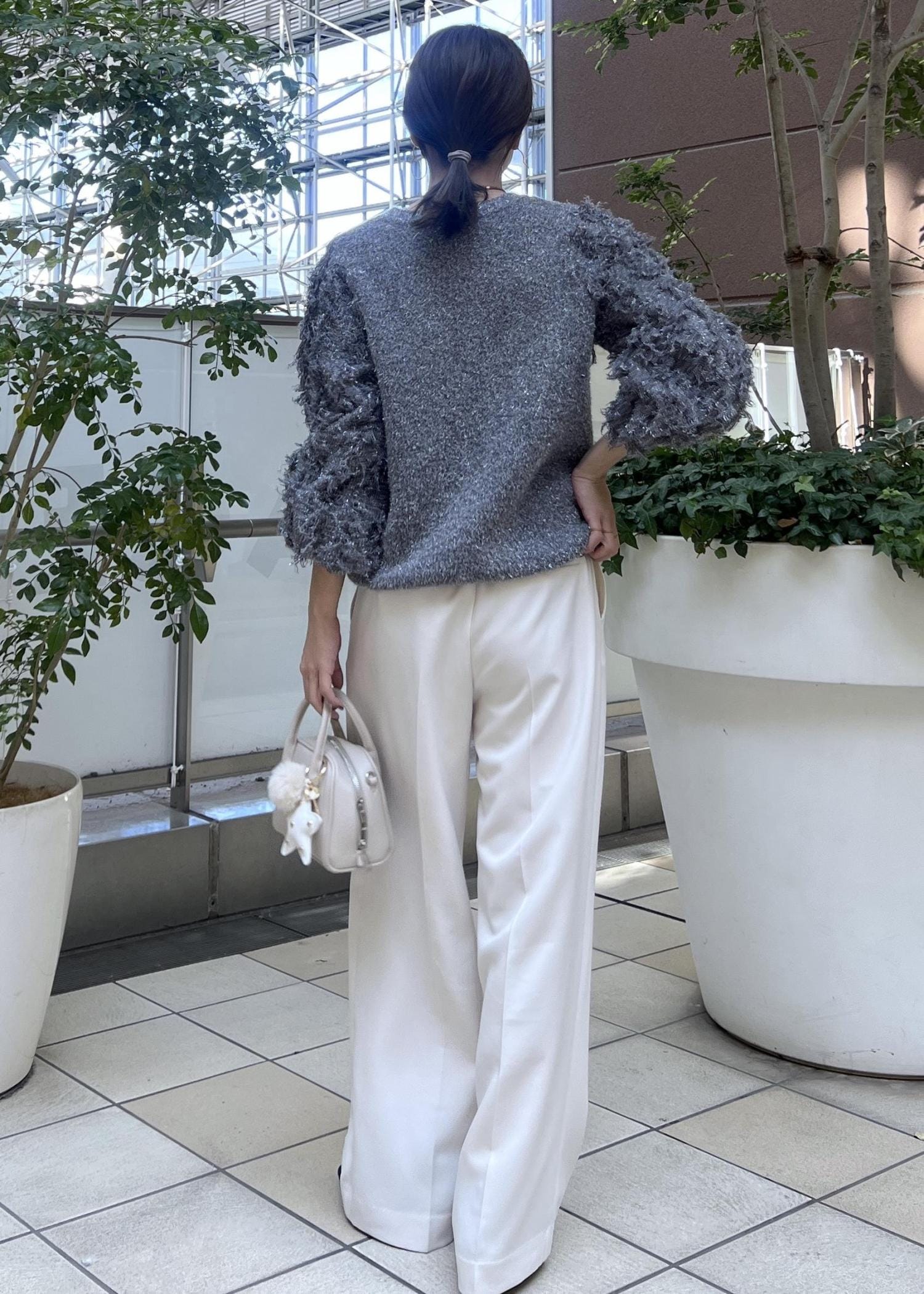 ラメ入りのニットは、袖部分はフリンジ素材で1枚着るだけで華やかなスタイリングになります。
