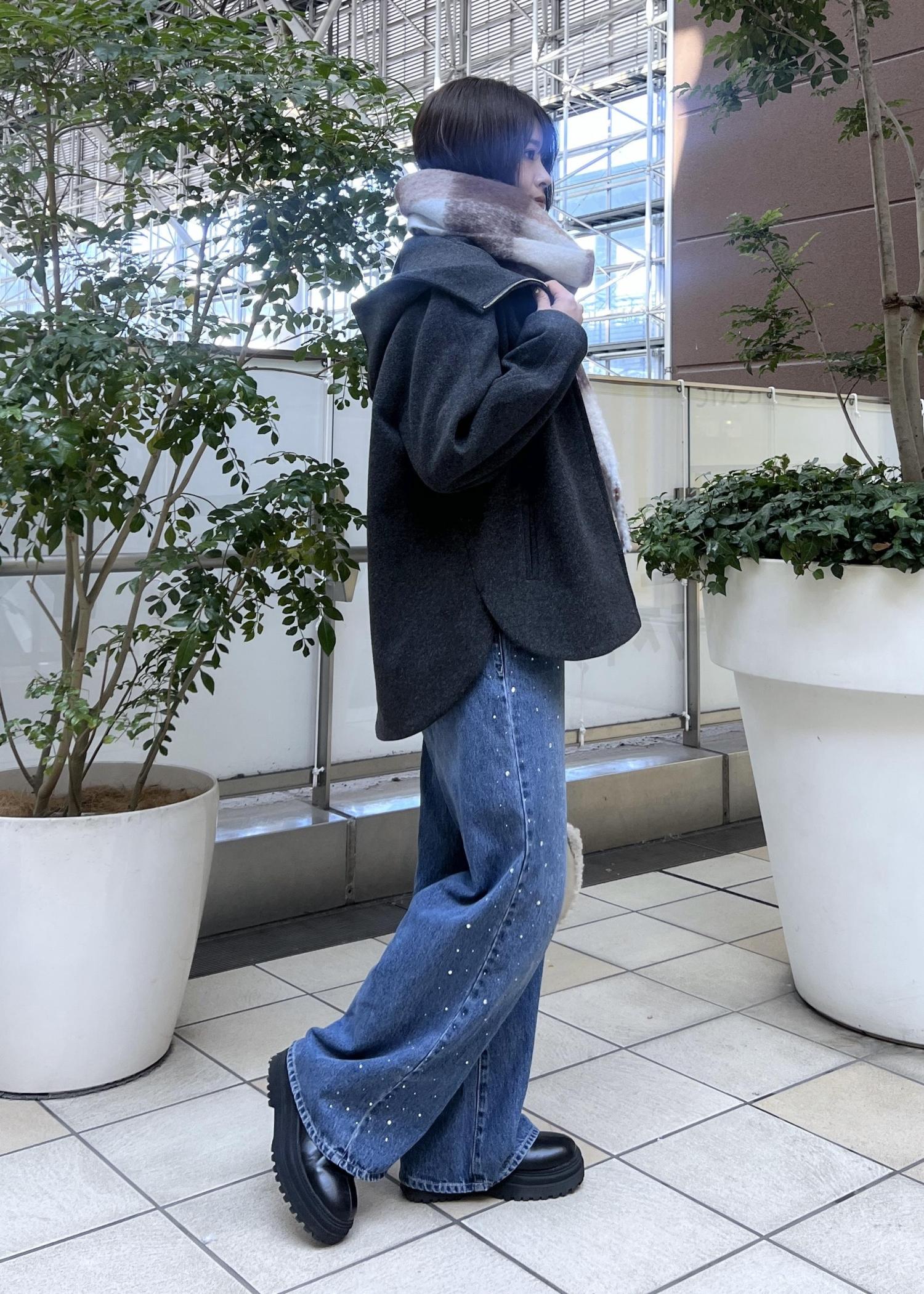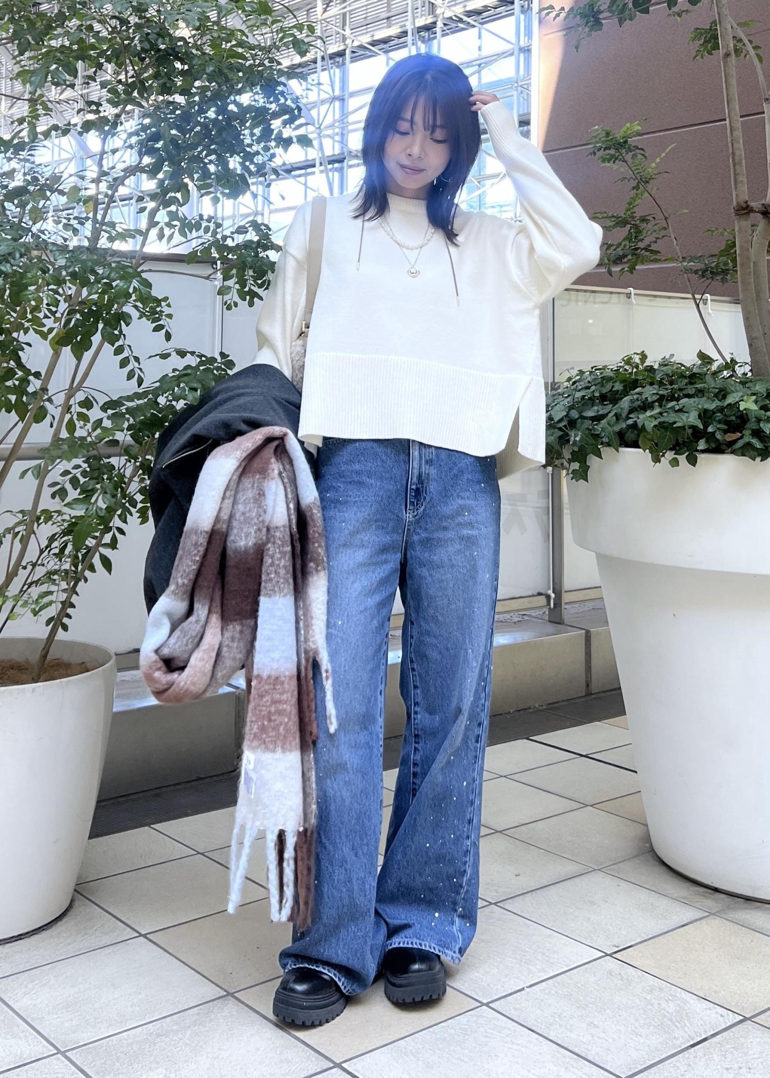 ビジューデニムとチェック柄のストールをポイントに、カジュアルなお出かけスタイルにしました。