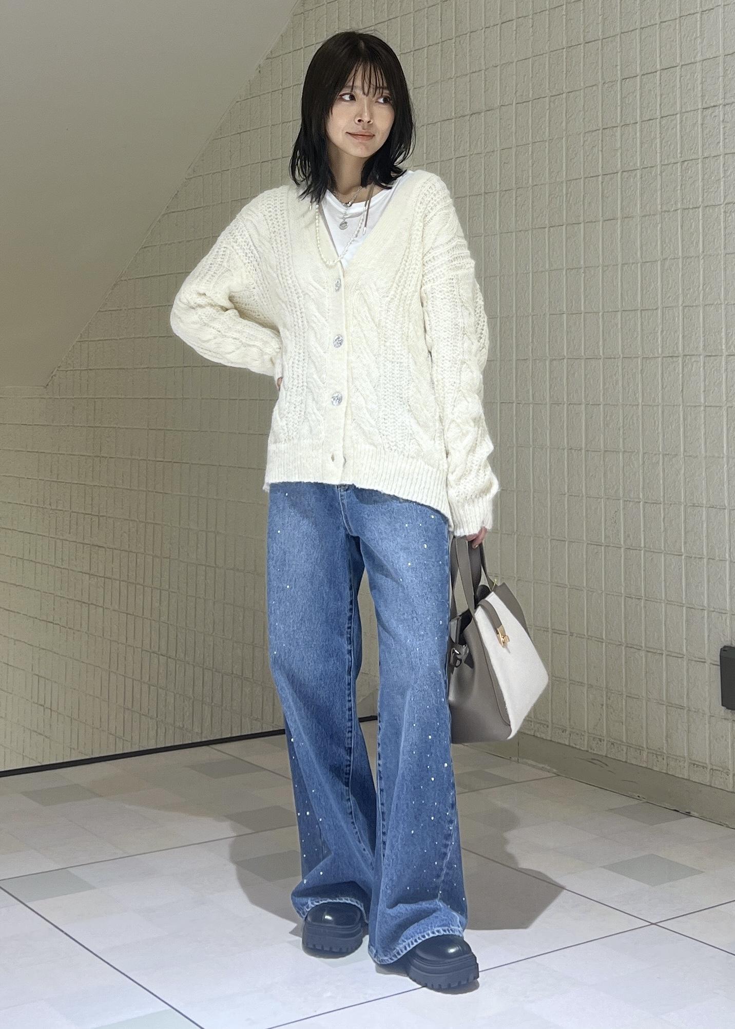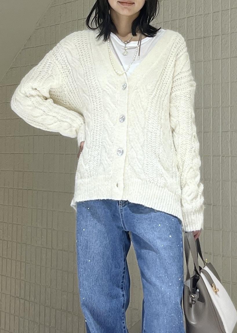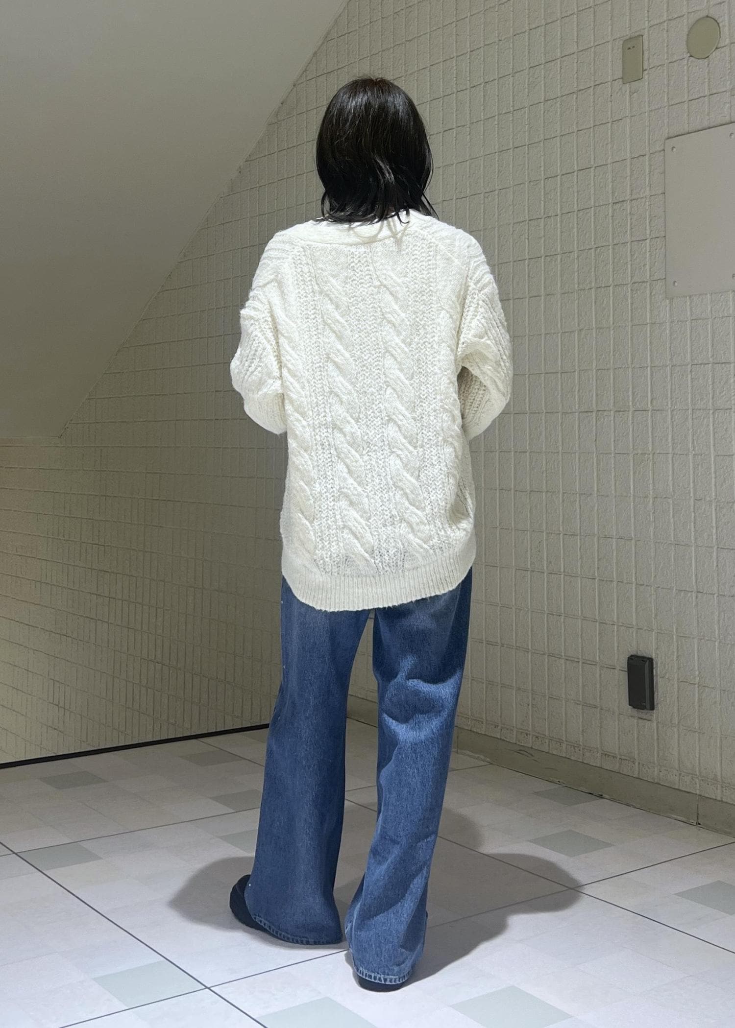 ざっくり感が可愛いゆるニットのカーデは、デニムでシンプルカジュアルなコーデに。
