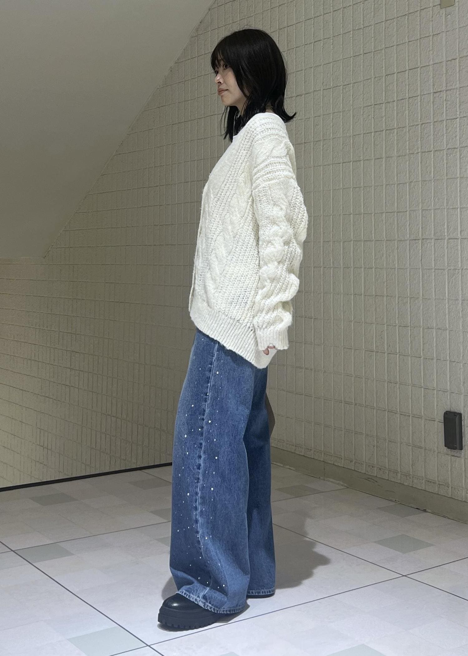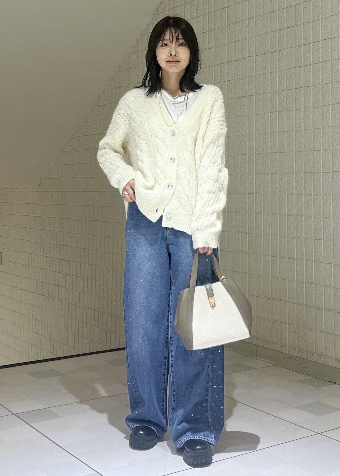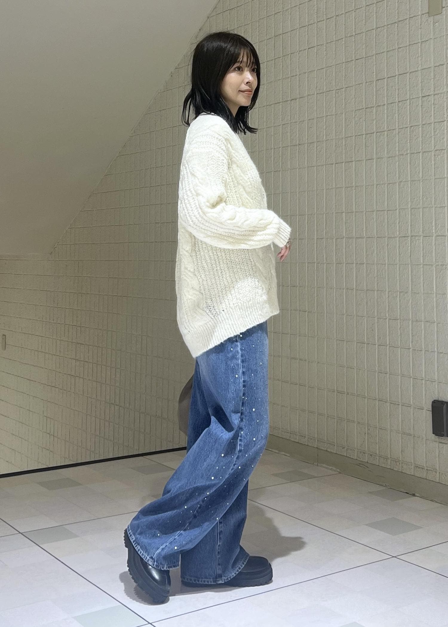 ざっくり感が可愛いゆるニットのカーデは、デニムでシンプルカジュアルなコーデに。