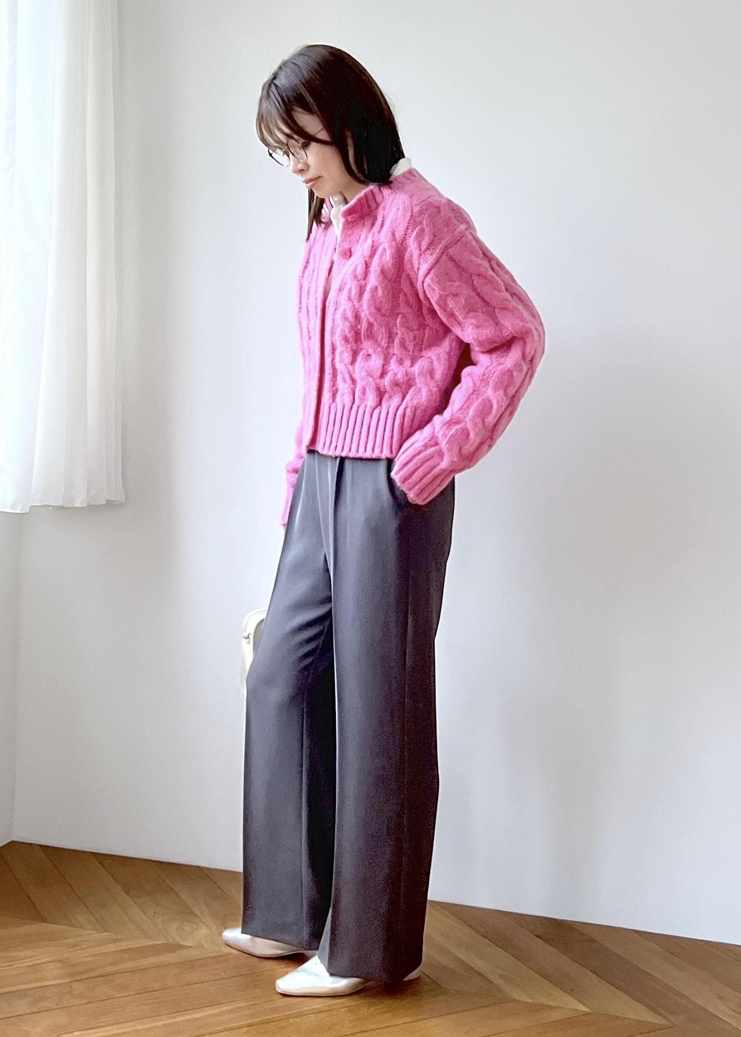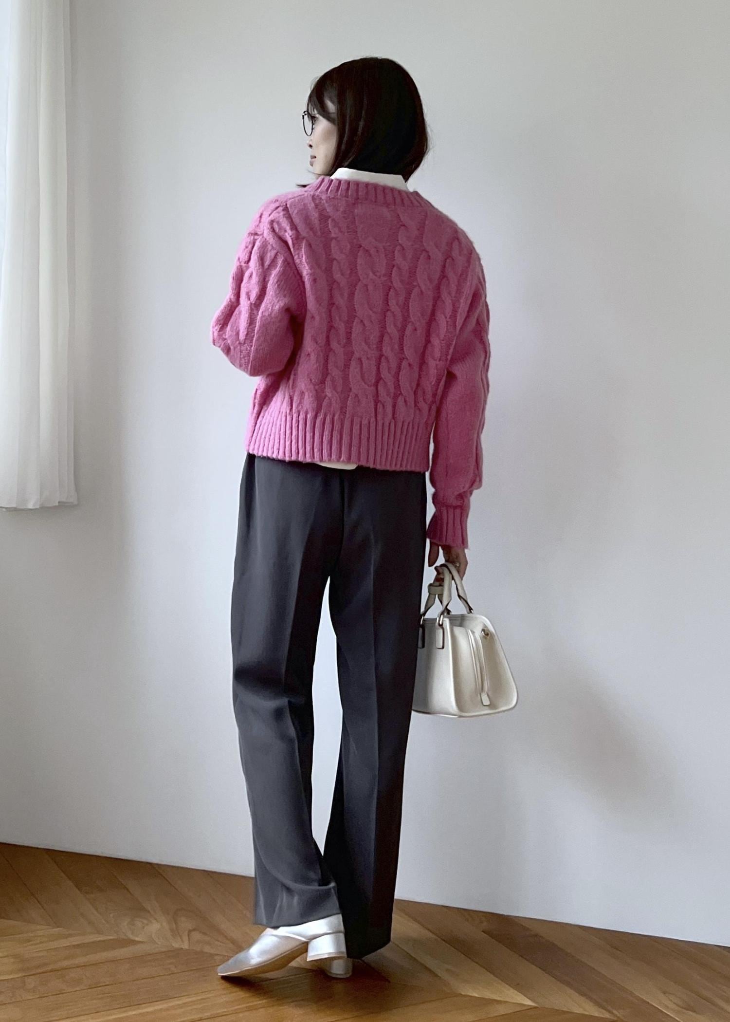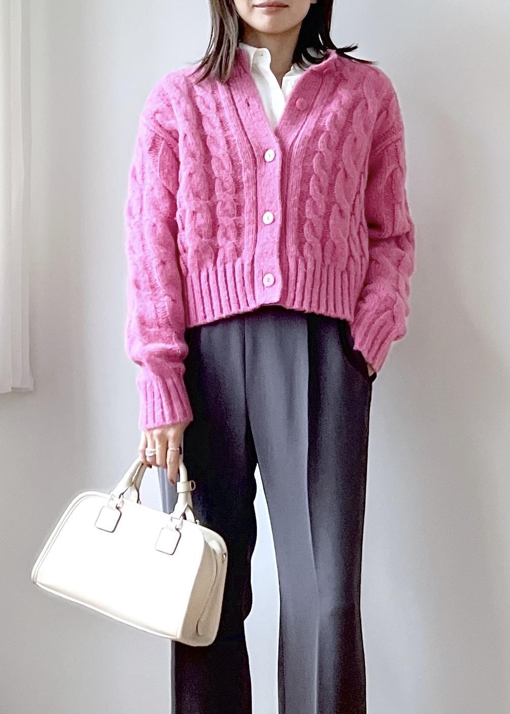 明るいピンクカラーのカーディガンは、程よく厚みがあるのでしっかり暖かみのある素材感。
