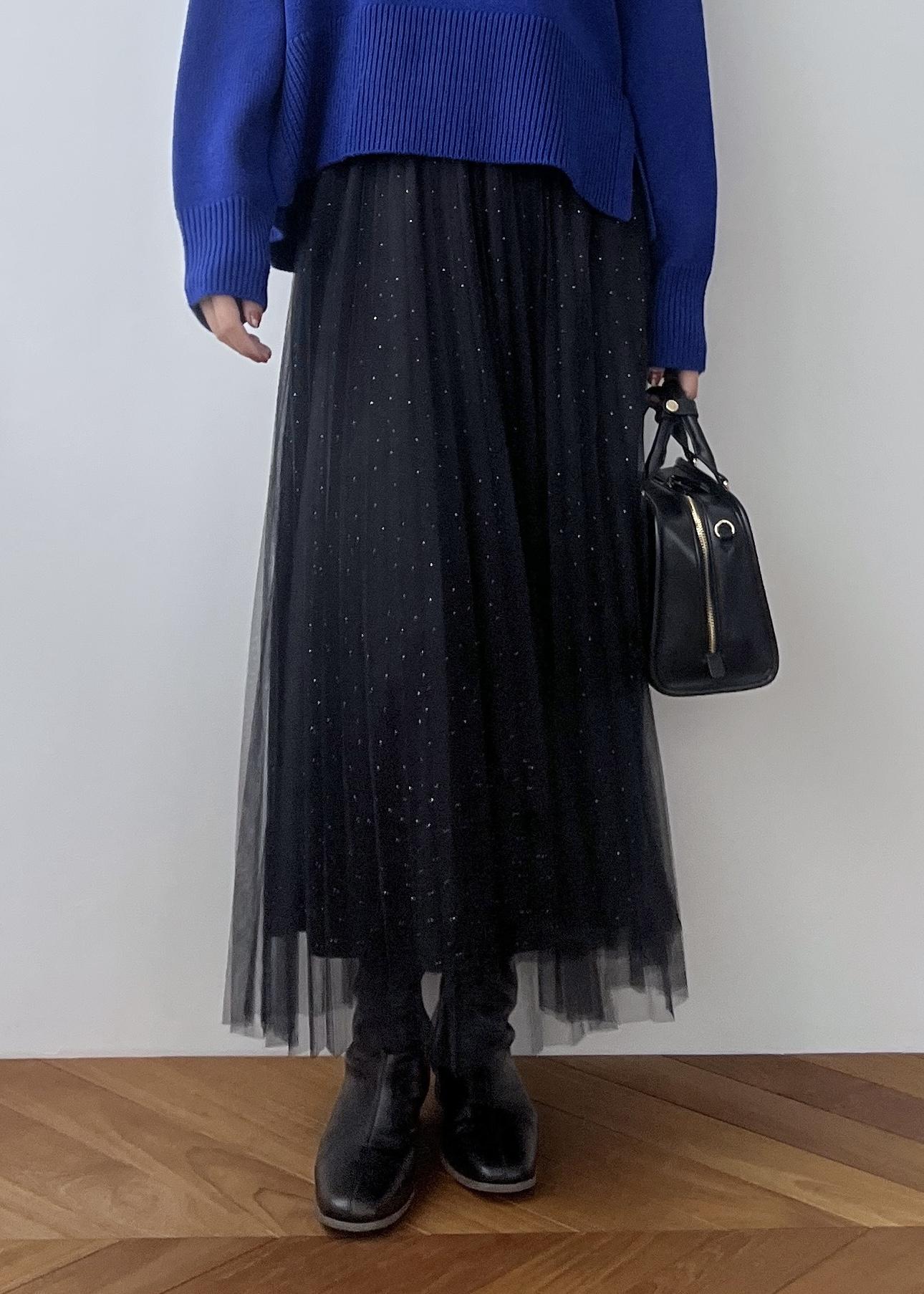 ROPÉ PICNICキラキラチュールプリーツスカート/着丈が選べるブラック / MT¥6,490レビュー軽いチュール素材にプリーツ加工。内側にさりげないキラキラ感のあるホットフィックスがポイント。