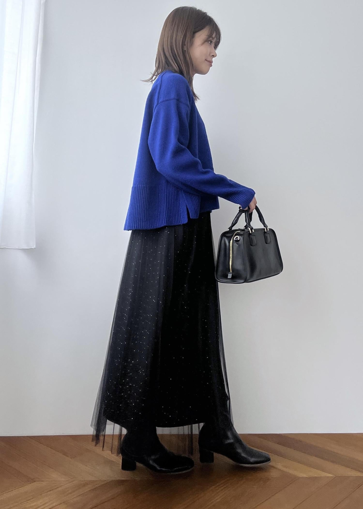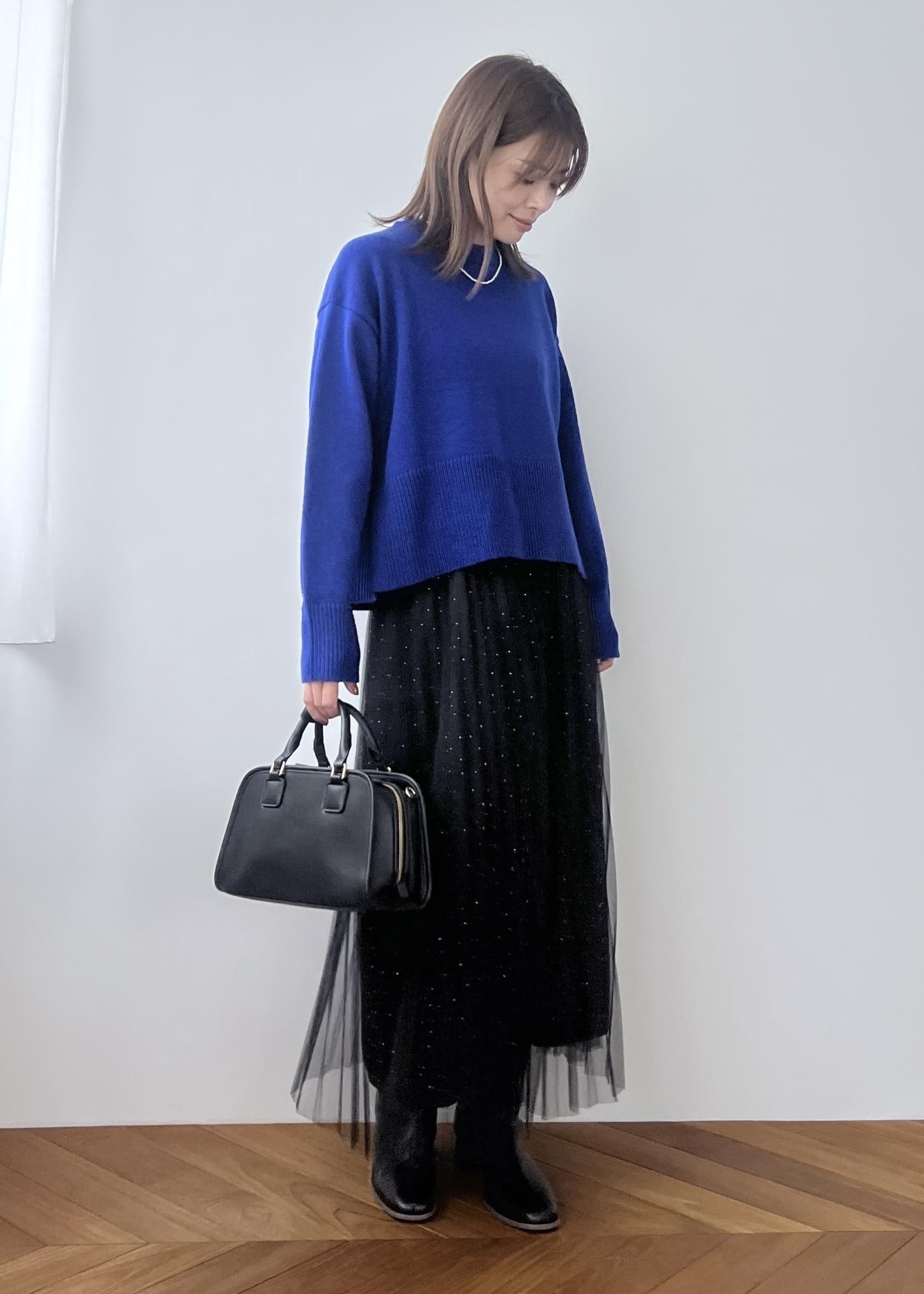 ブルーニットの大人きれいめスタイル
