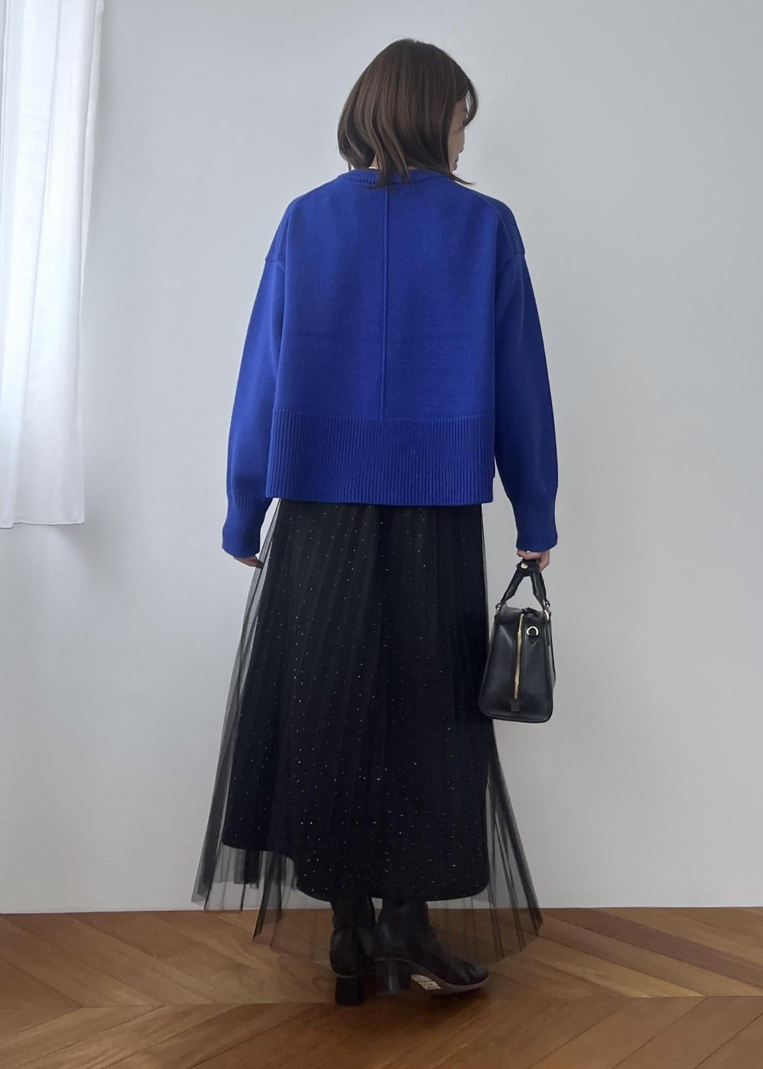 華やかさのあるブルーのニットは、柔らかくチクチク感なく着やすい素材感。