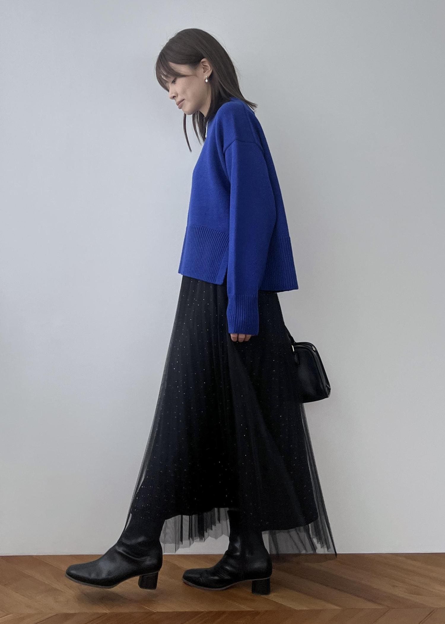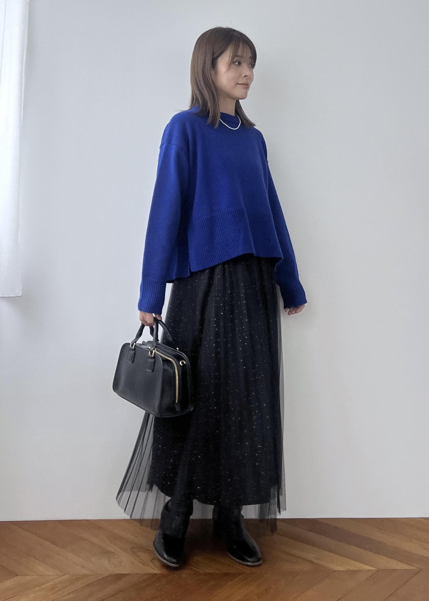 ブラックのチュールスカートを合わせて、華やかなスタイリングにしました。