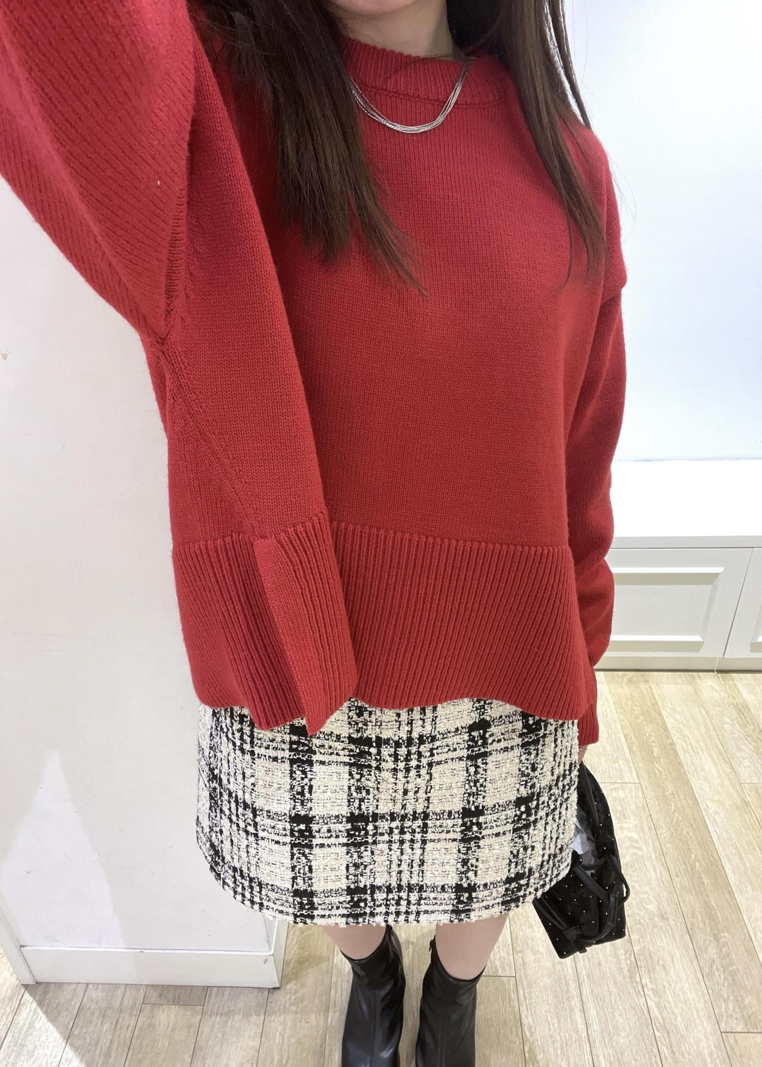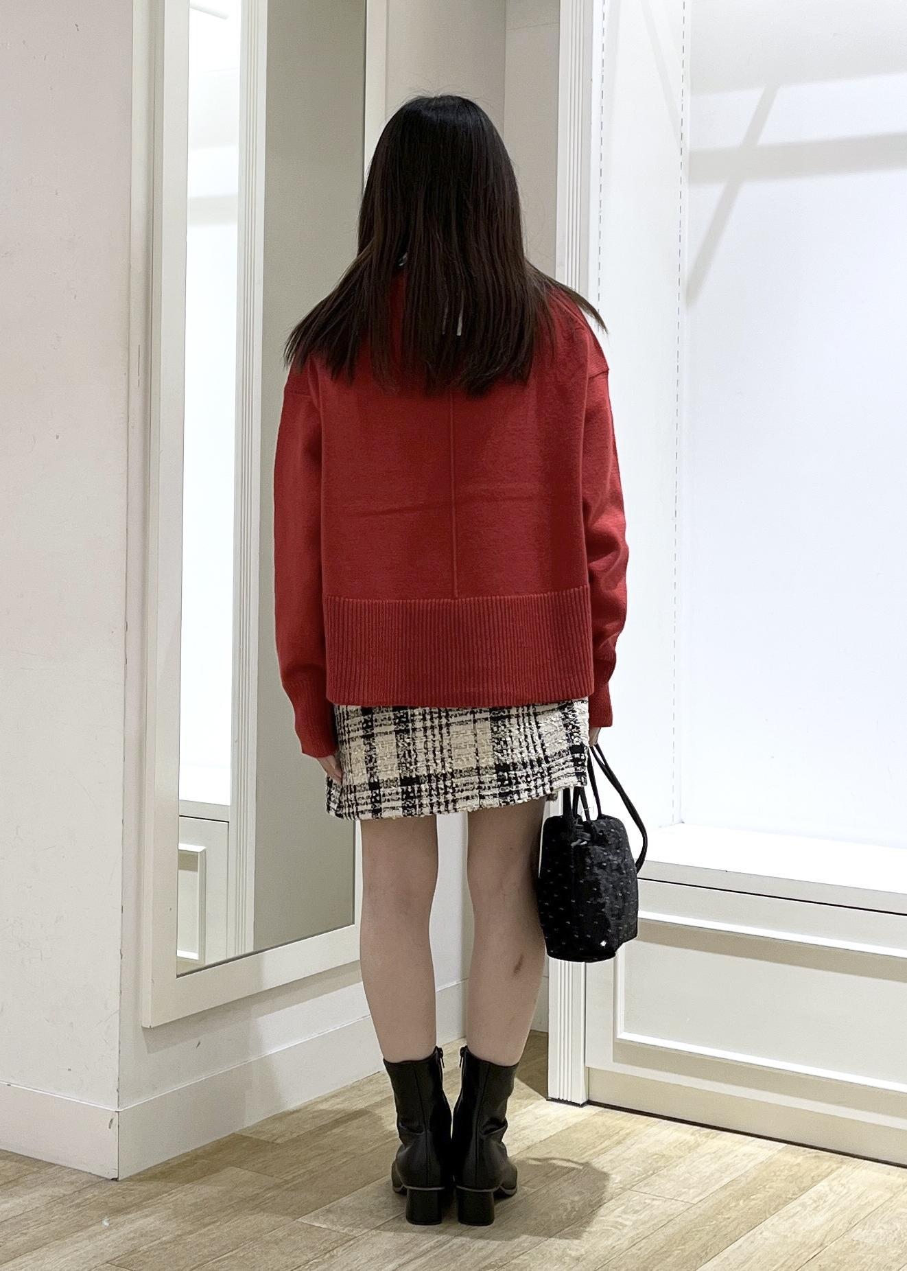 赤のトップスをメインにクリスマスを意識したコーディネートです。