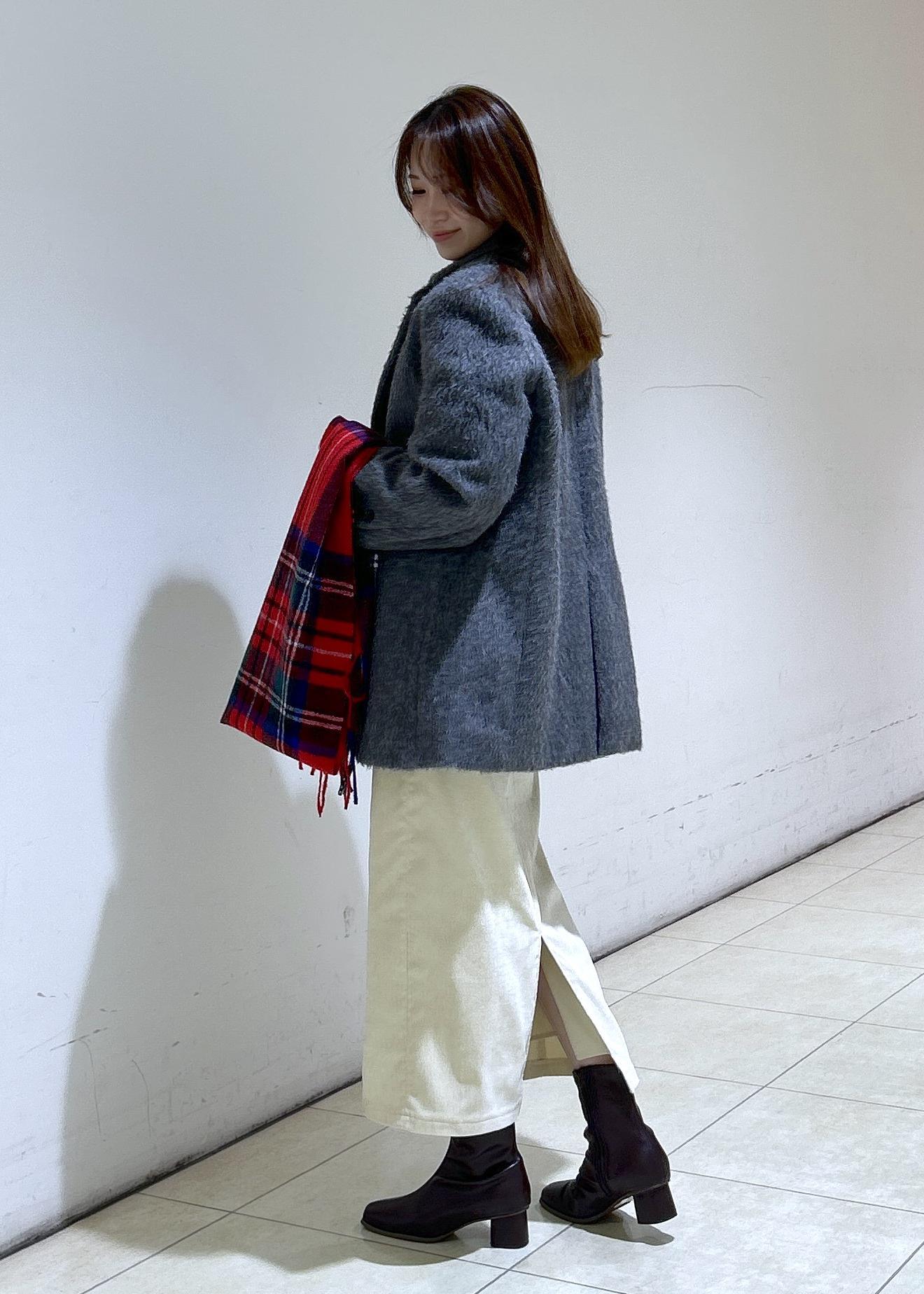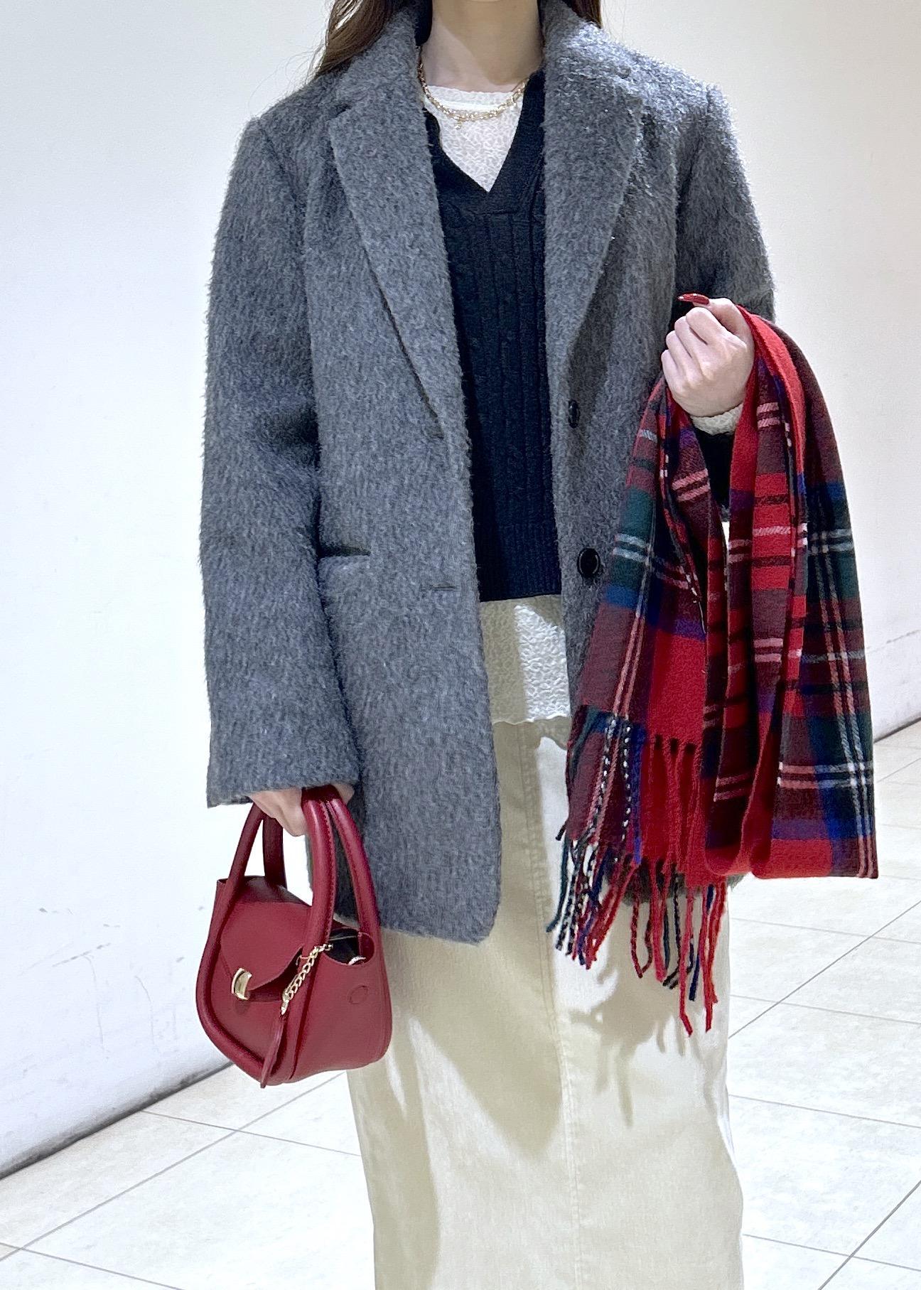 赤いマフラーをアクセントにし、クリスマスらしいお出かけスタイリングにしました。