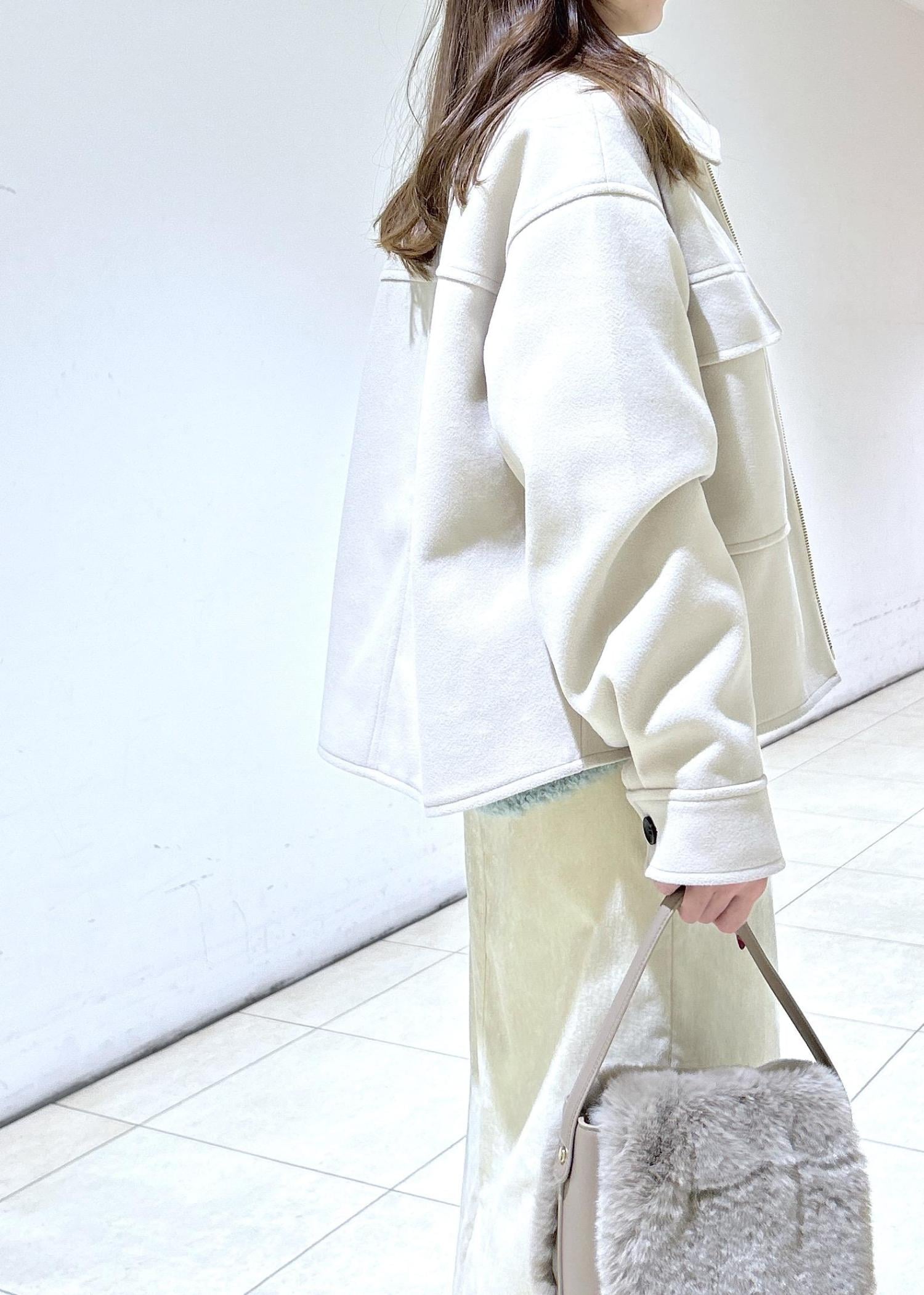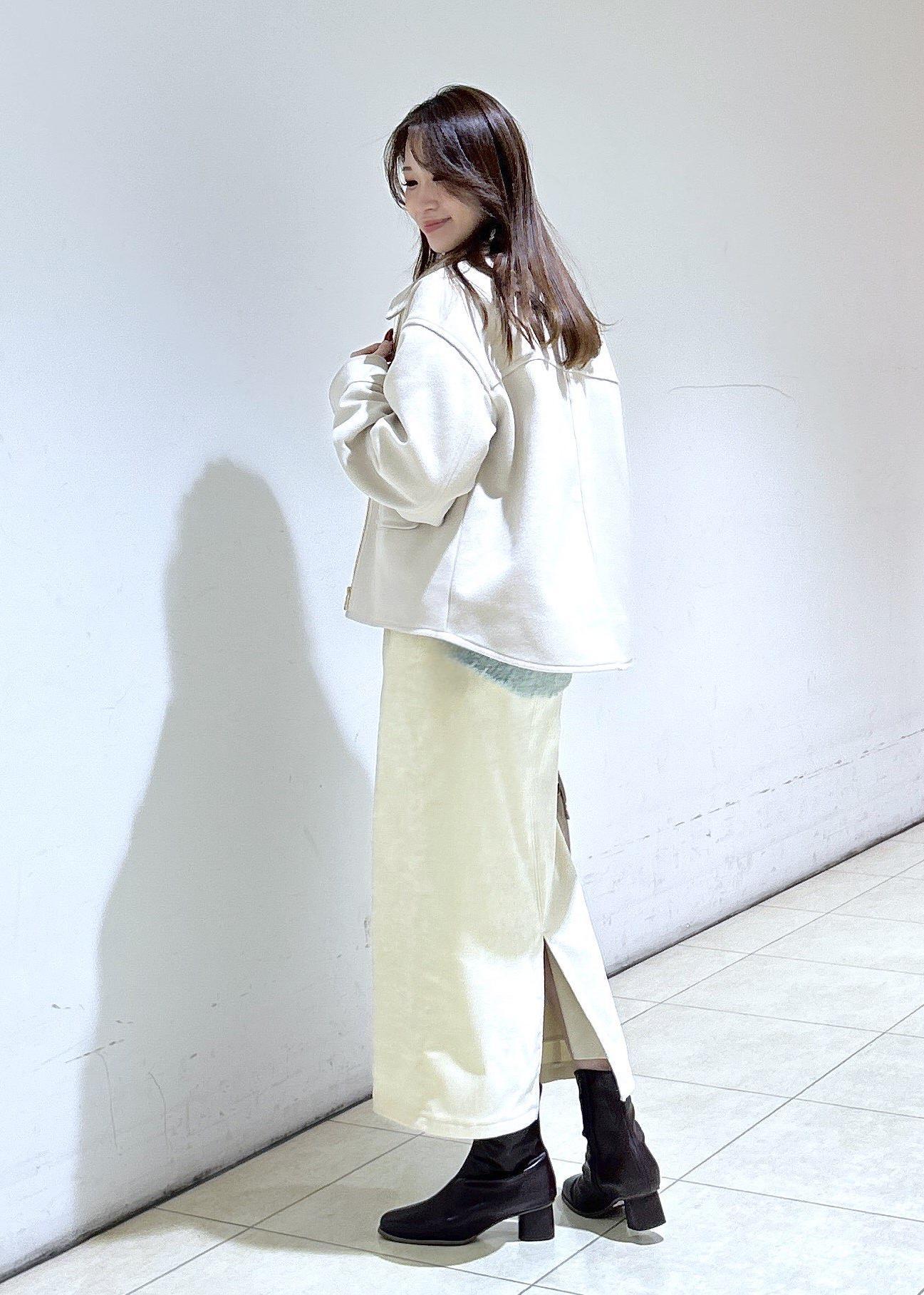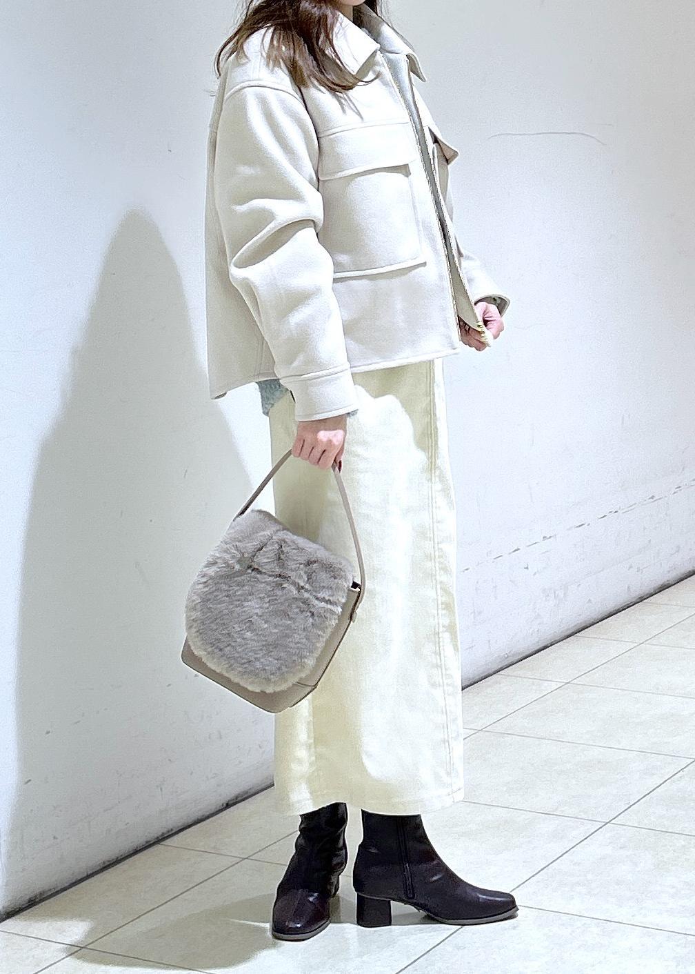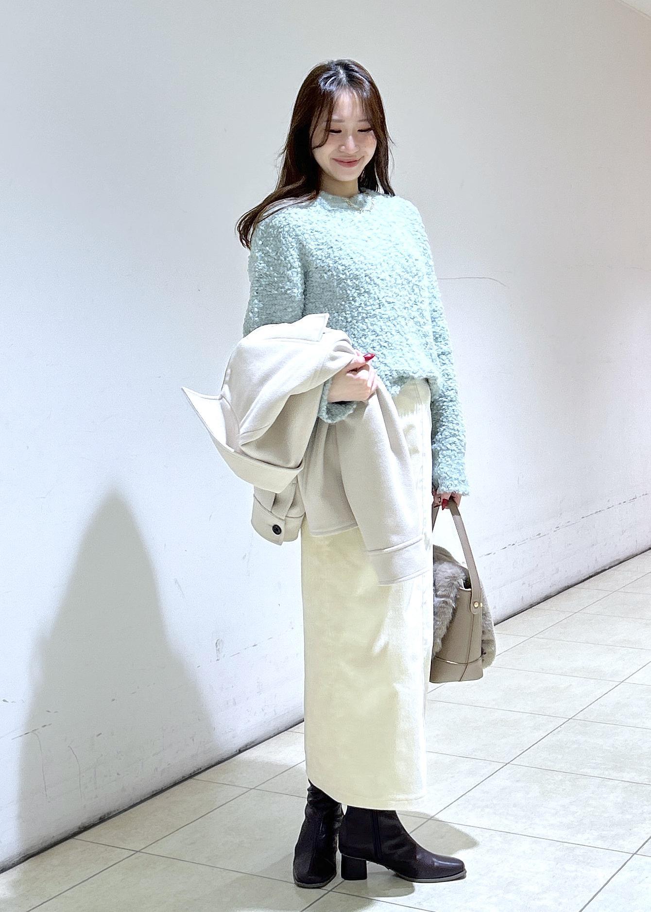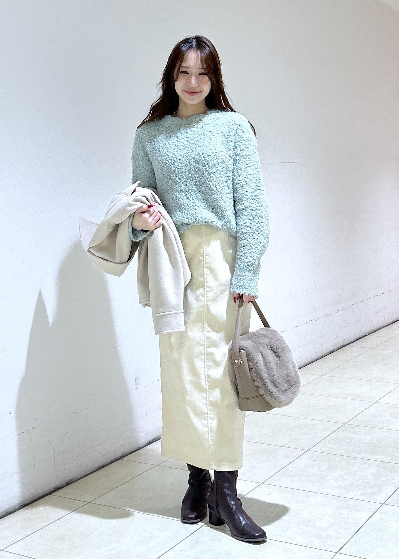 アウター×スカートどちらも白で合わせてホワイトクリスマスなスタイリングにしました。