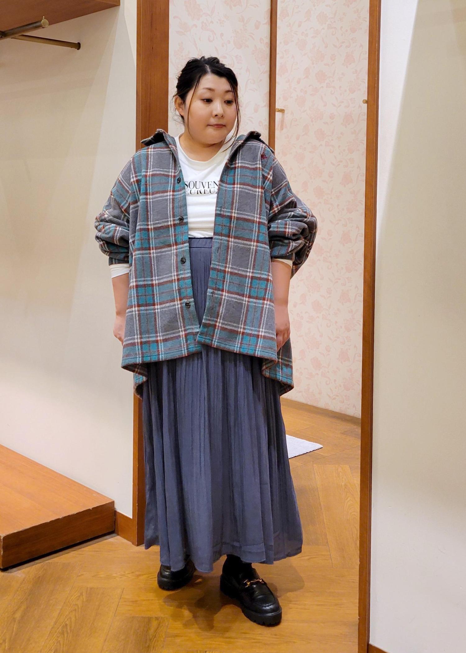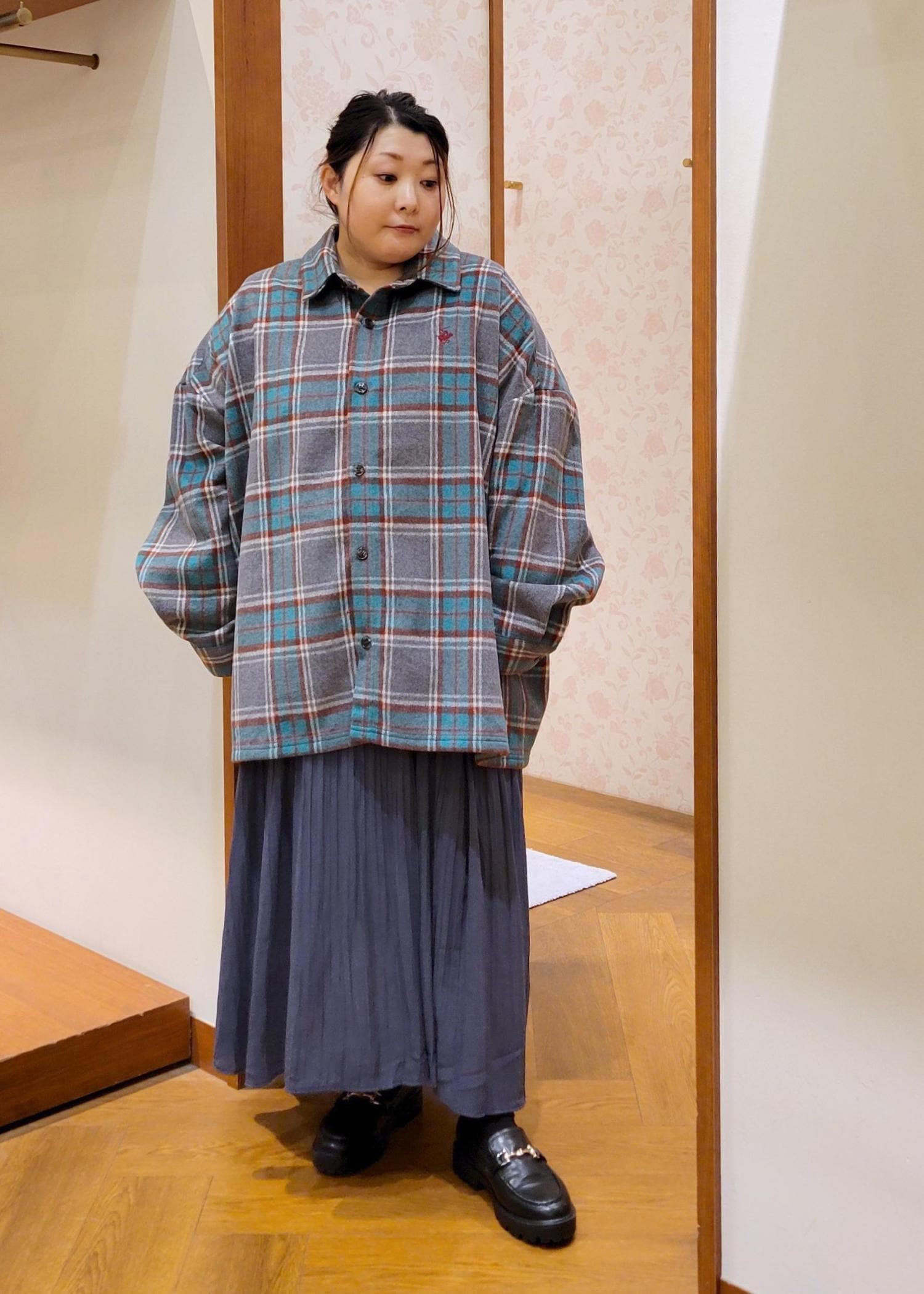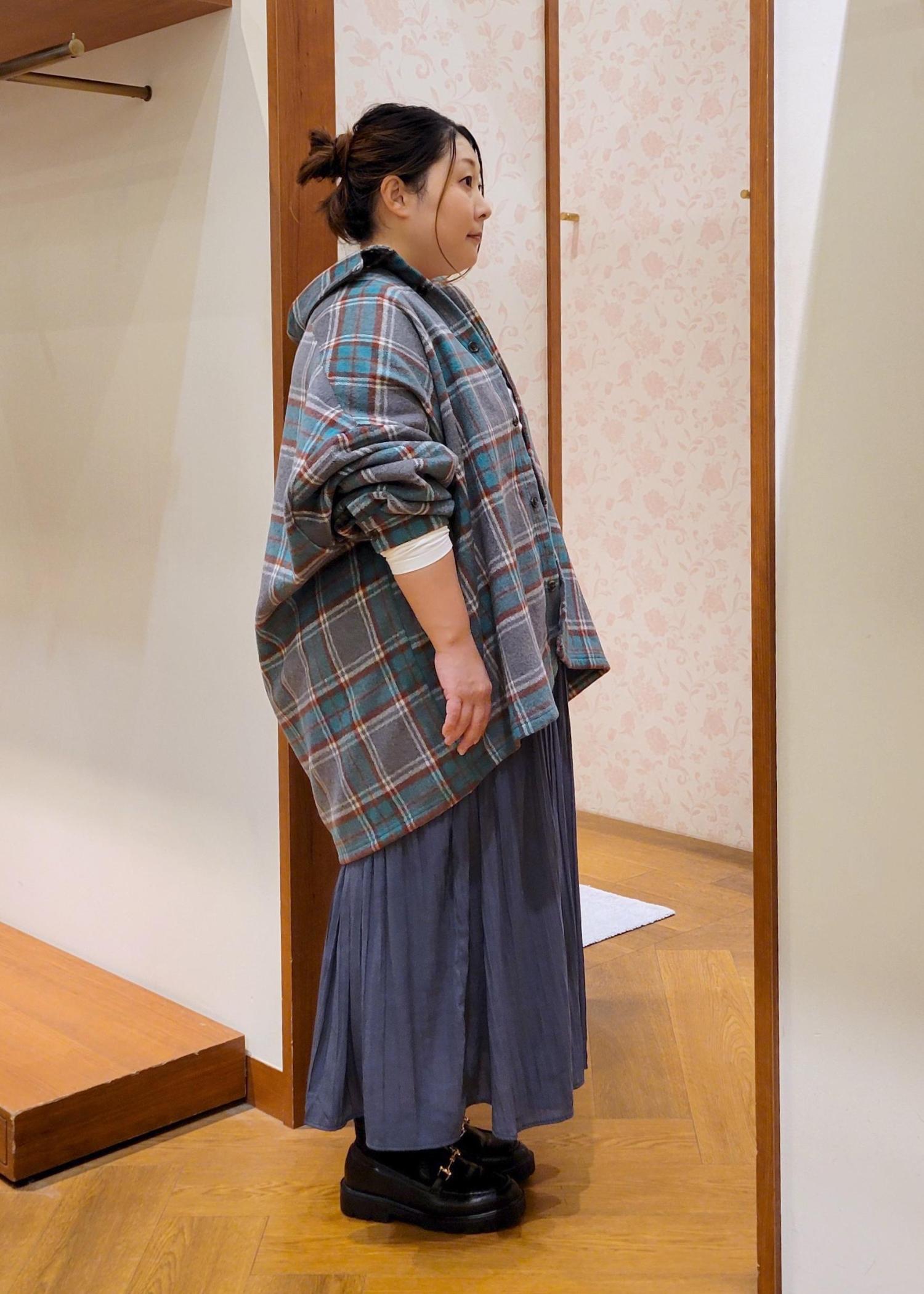 オーバーサイズのシャギーシャツにスカートを合わせた大人カジュアルスタイルです。BIGサイズがとってもお気に入りです。