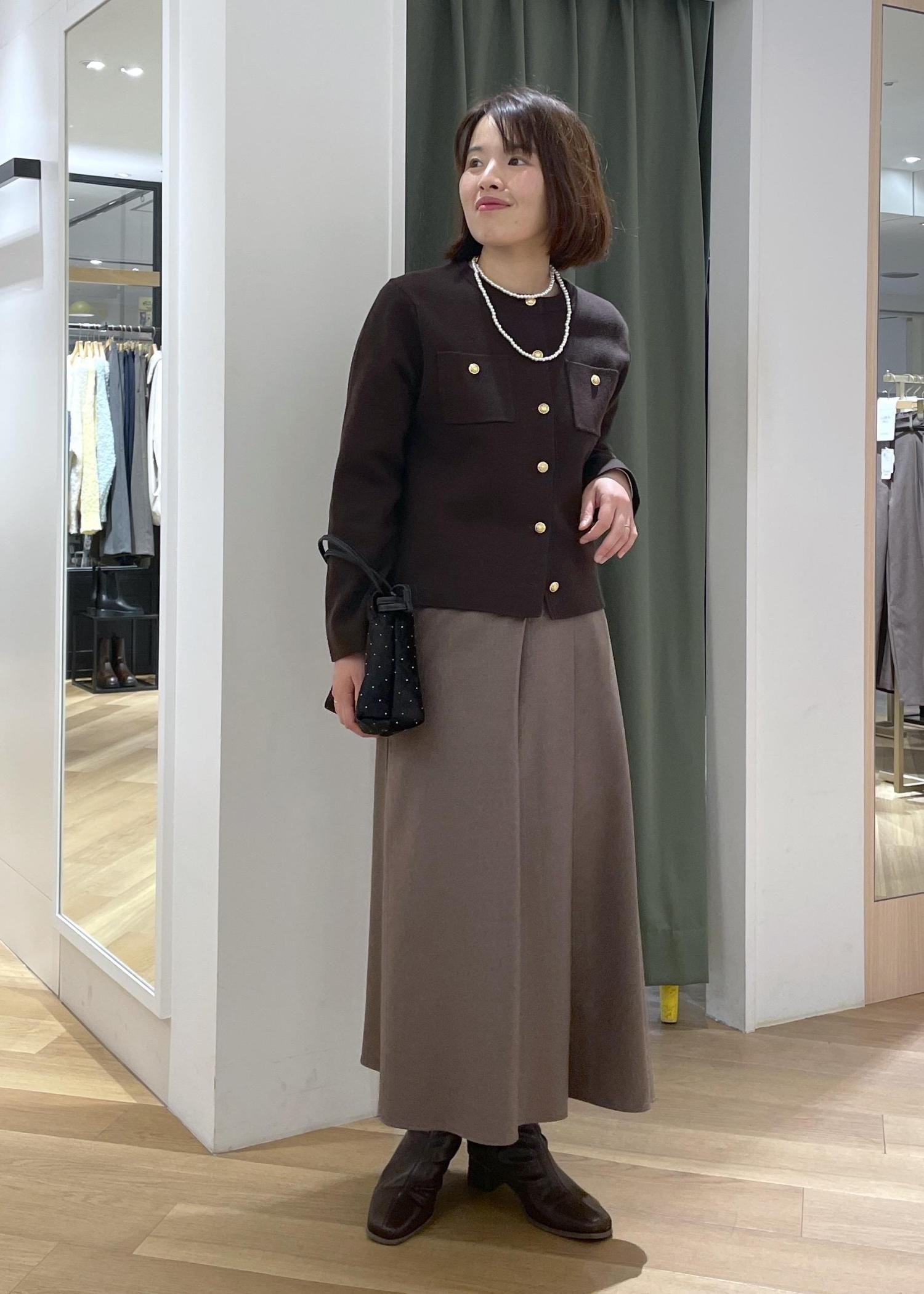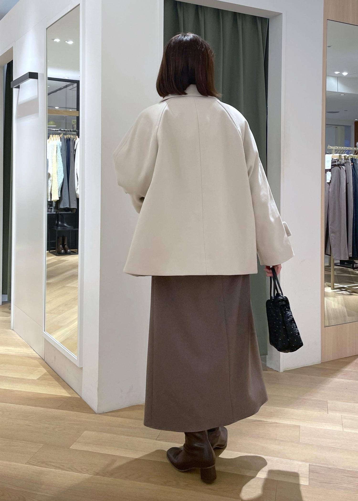 金釦がポイントのミドル丈コートに、ブラウンでまとめたスカートスタイルを合わせた、デートにもおすすめのきれいめコーデです!