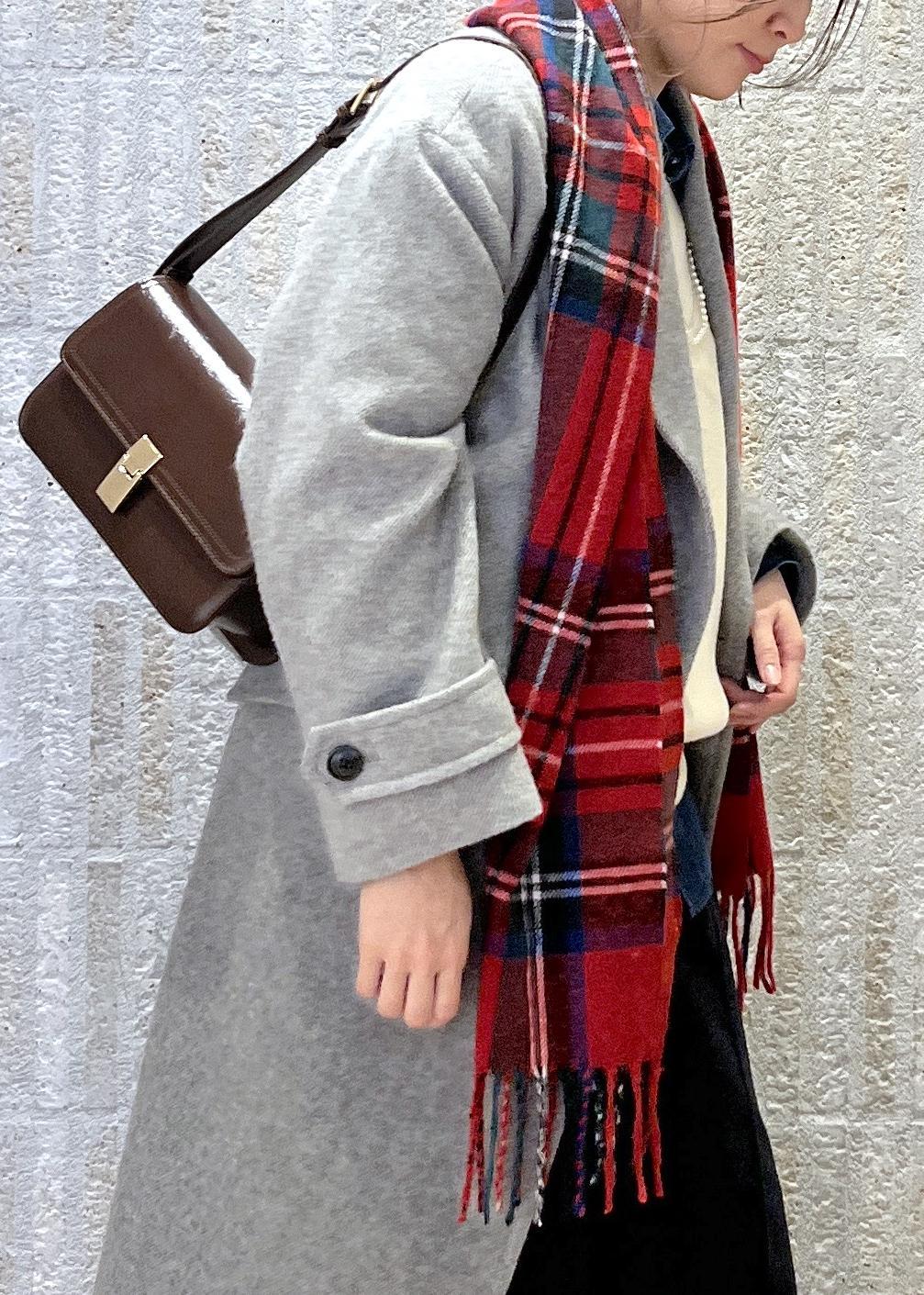 差し色に赤のマフラーを巻けば季節感もあり一気におしゃれな印象に◎