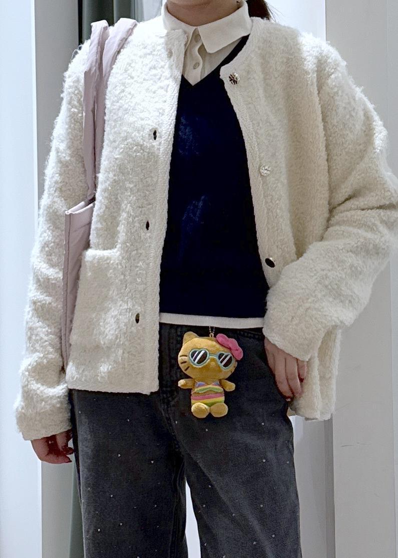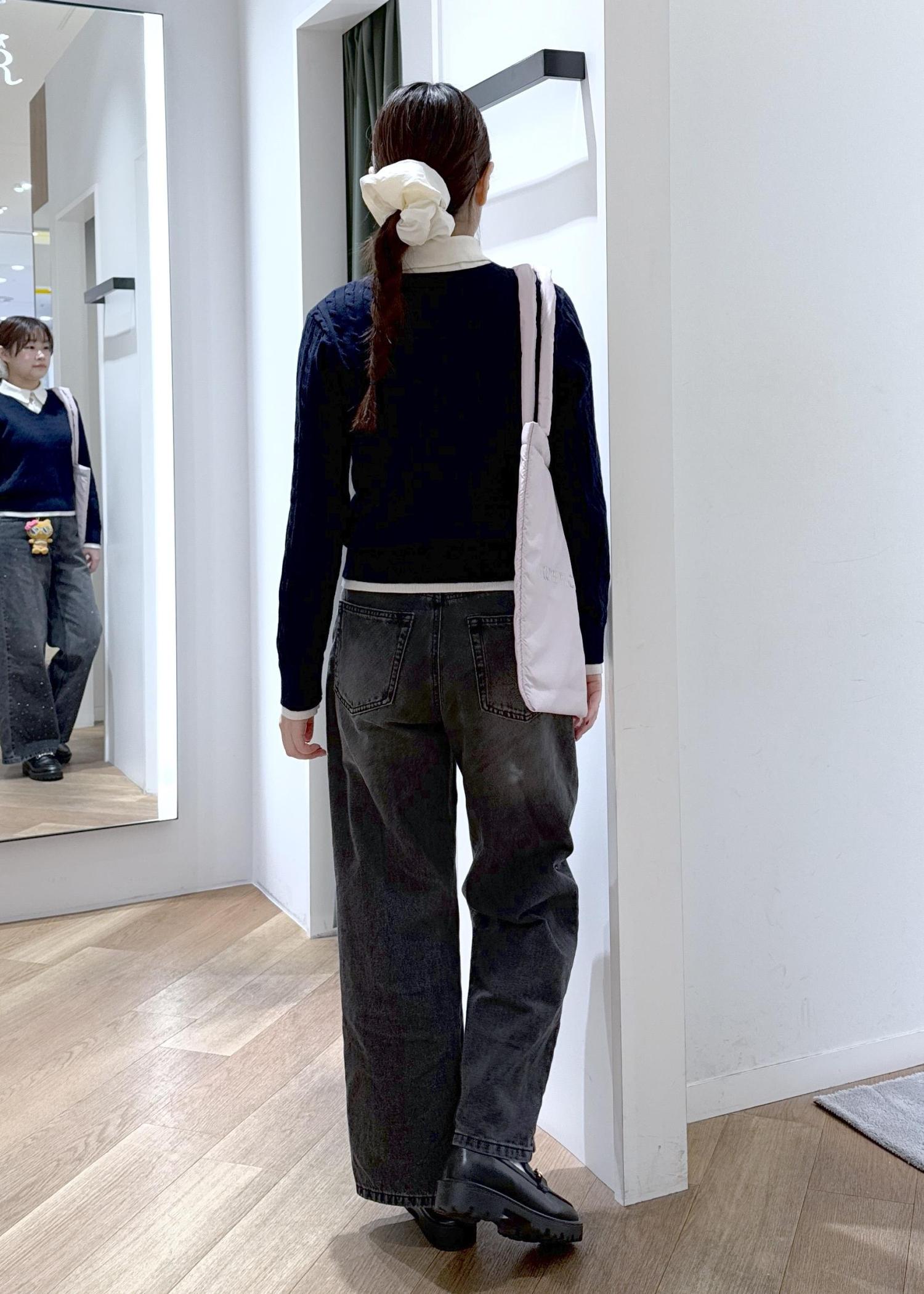 襟付きニットに金ボタンのカーディガンを合わせた綺麗めなコーディネートです。