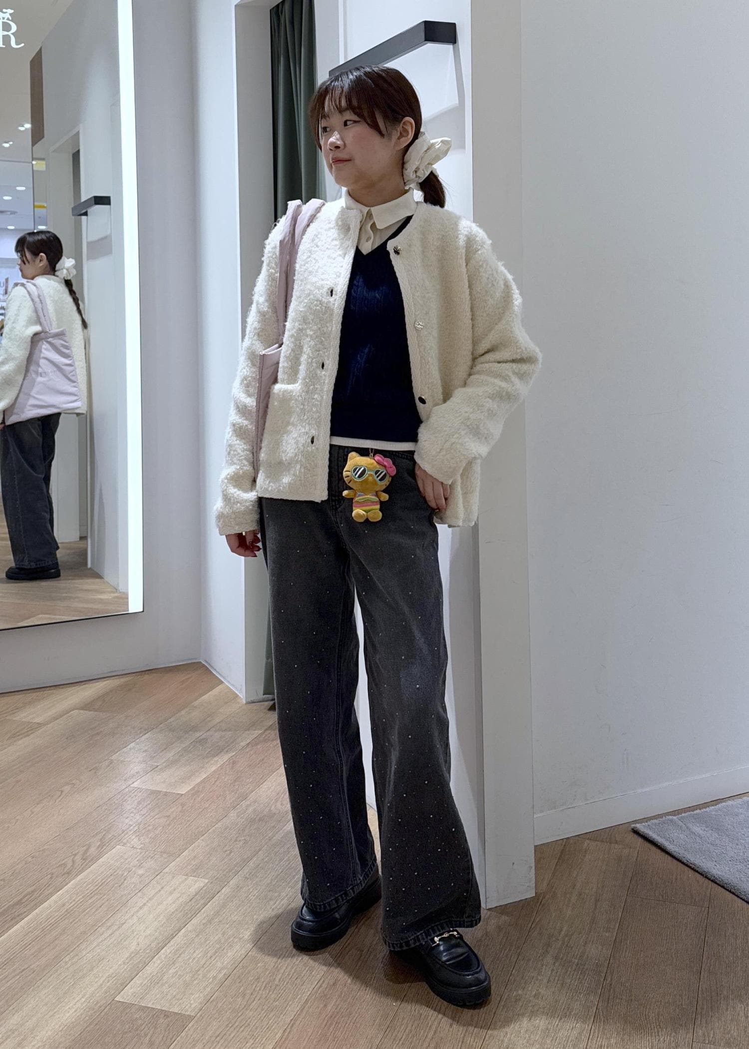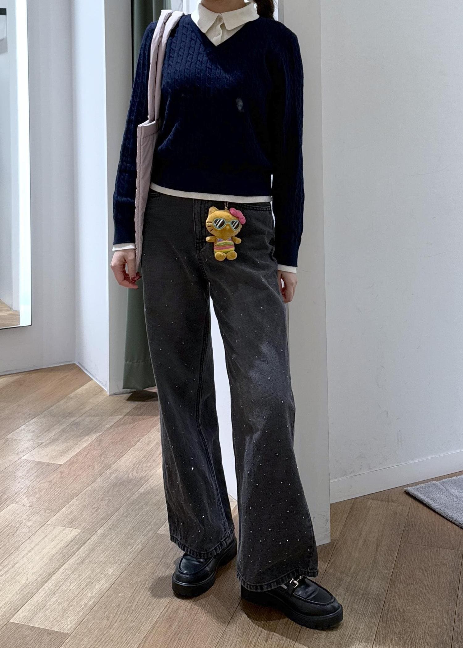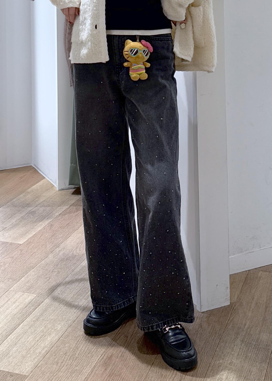ボトムはキラキラデニムとハローキティーのチャームで遊び心をプラス。