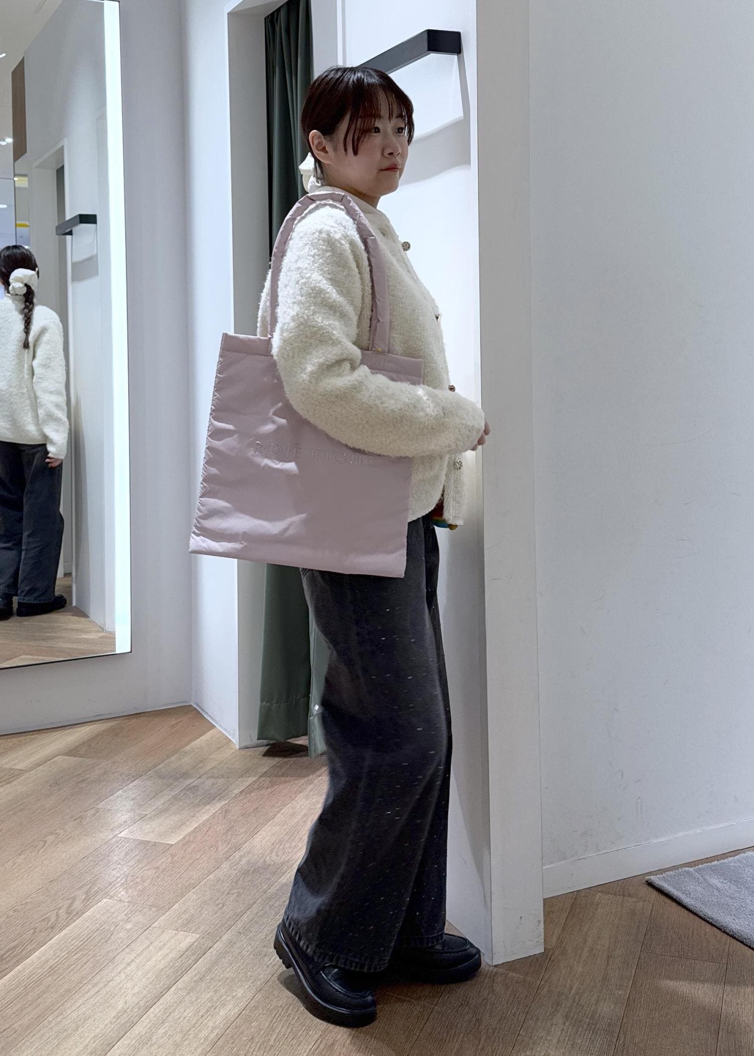 ピンクのバッグを持って、大人可愛く仕上げました。