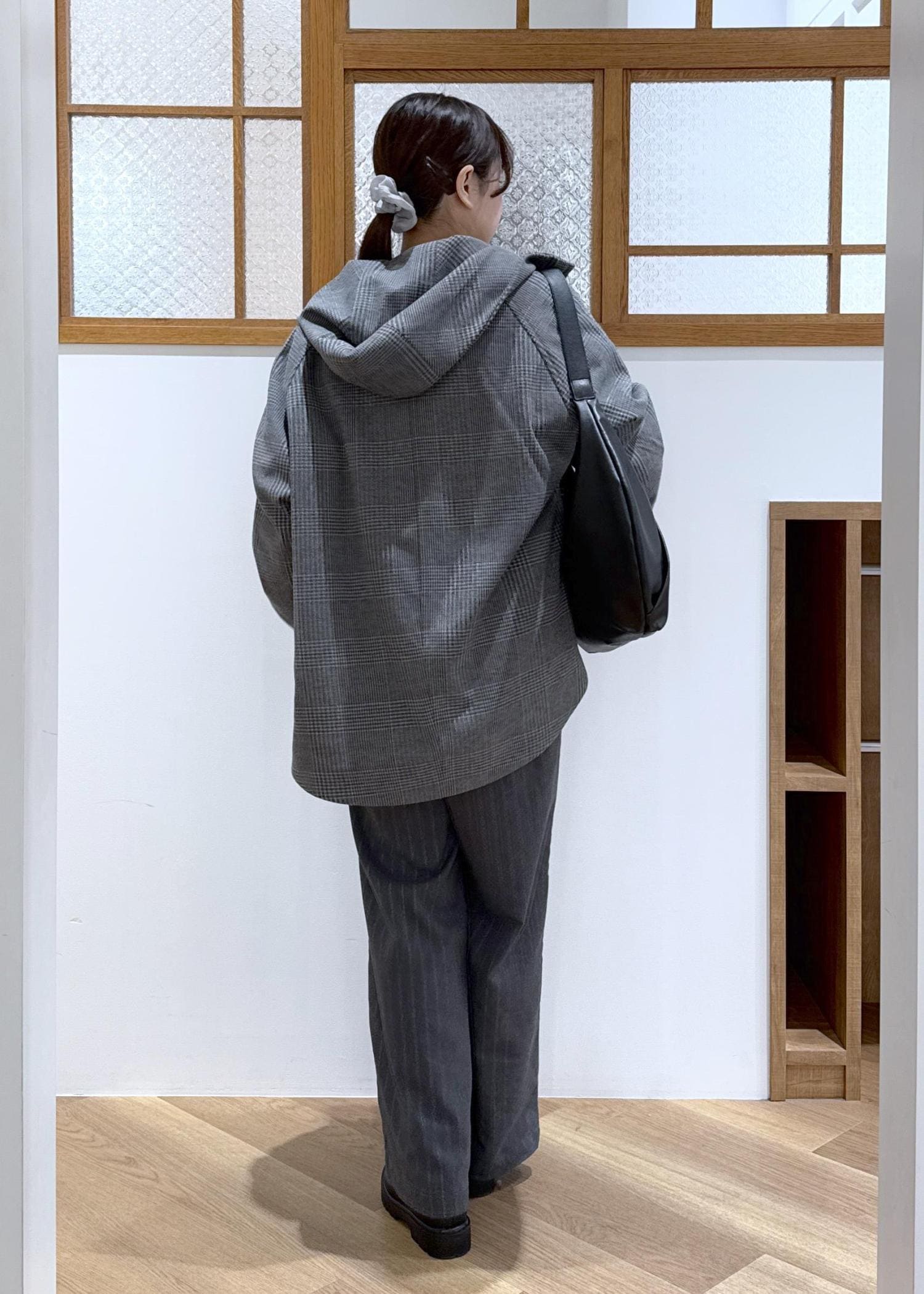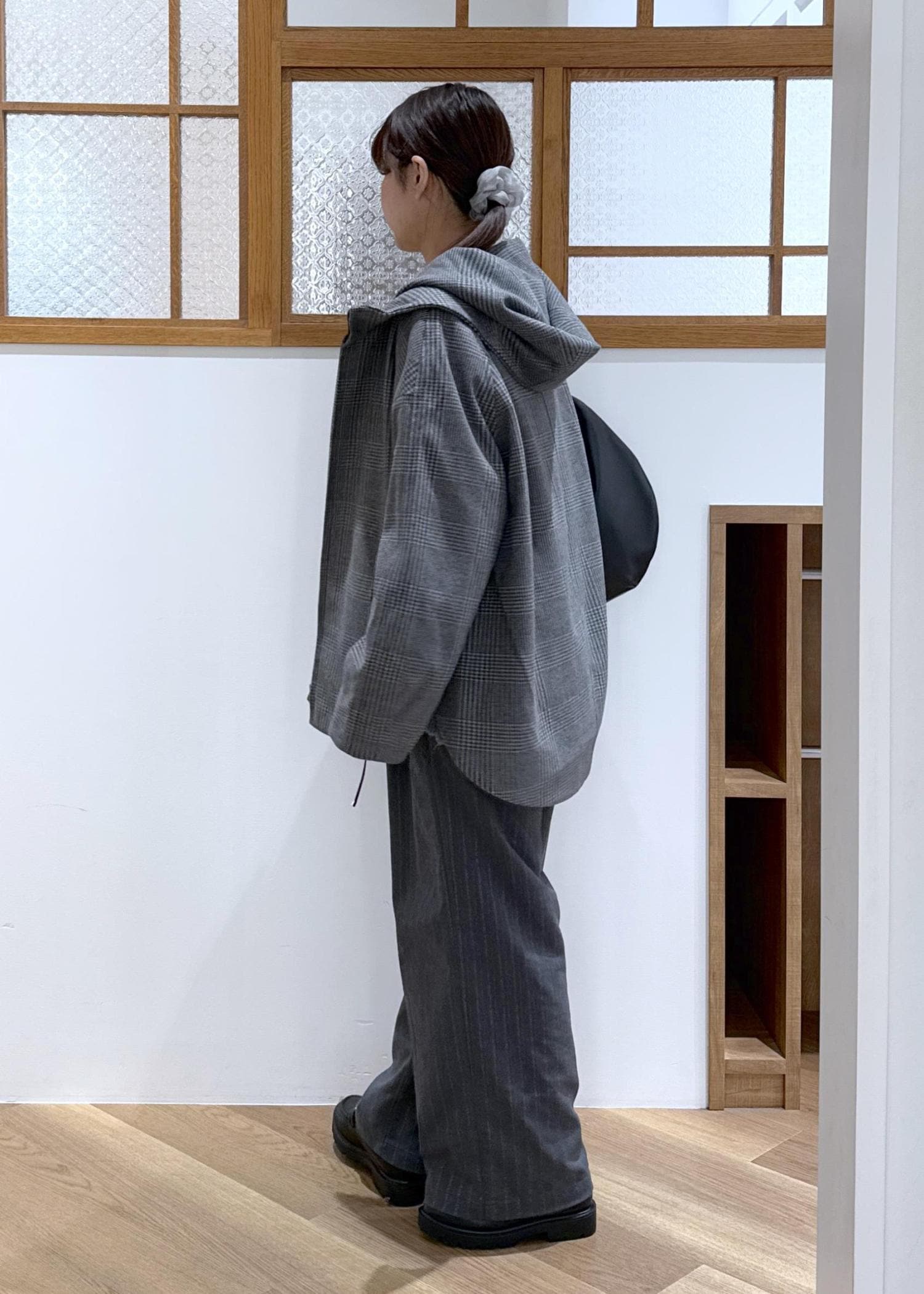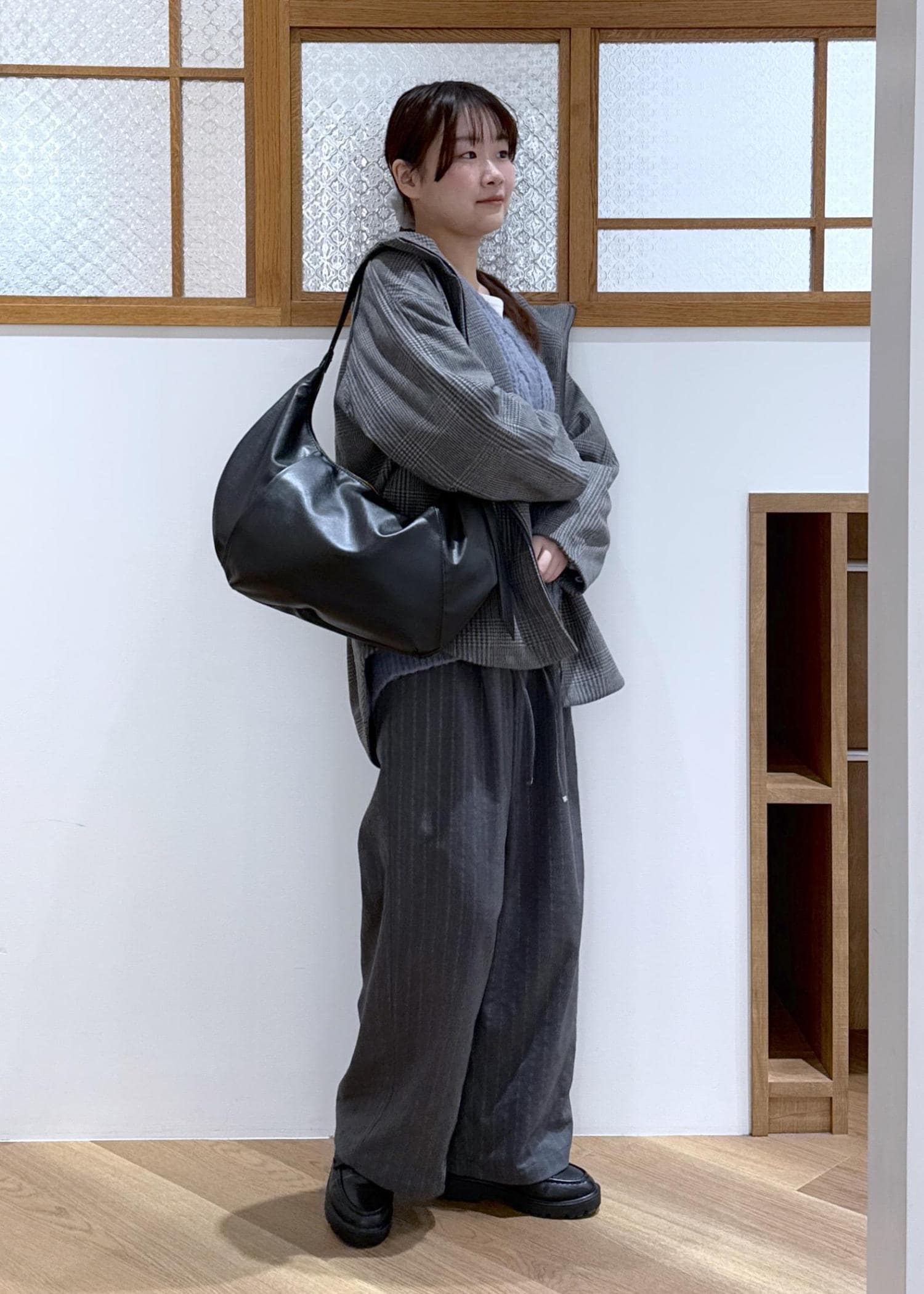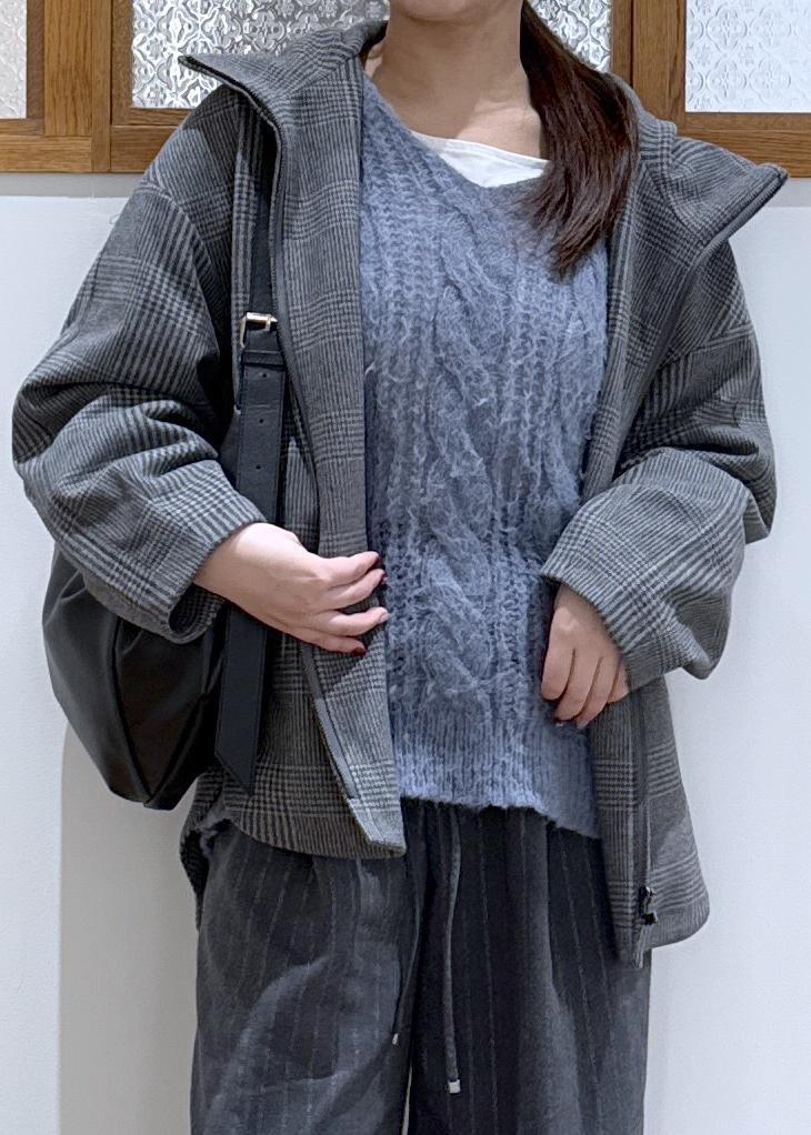 アウターはグレーのチェック柄、ボトムはグレーのストライプ柄で、柄と柄を組み合わせたコーディネートです。