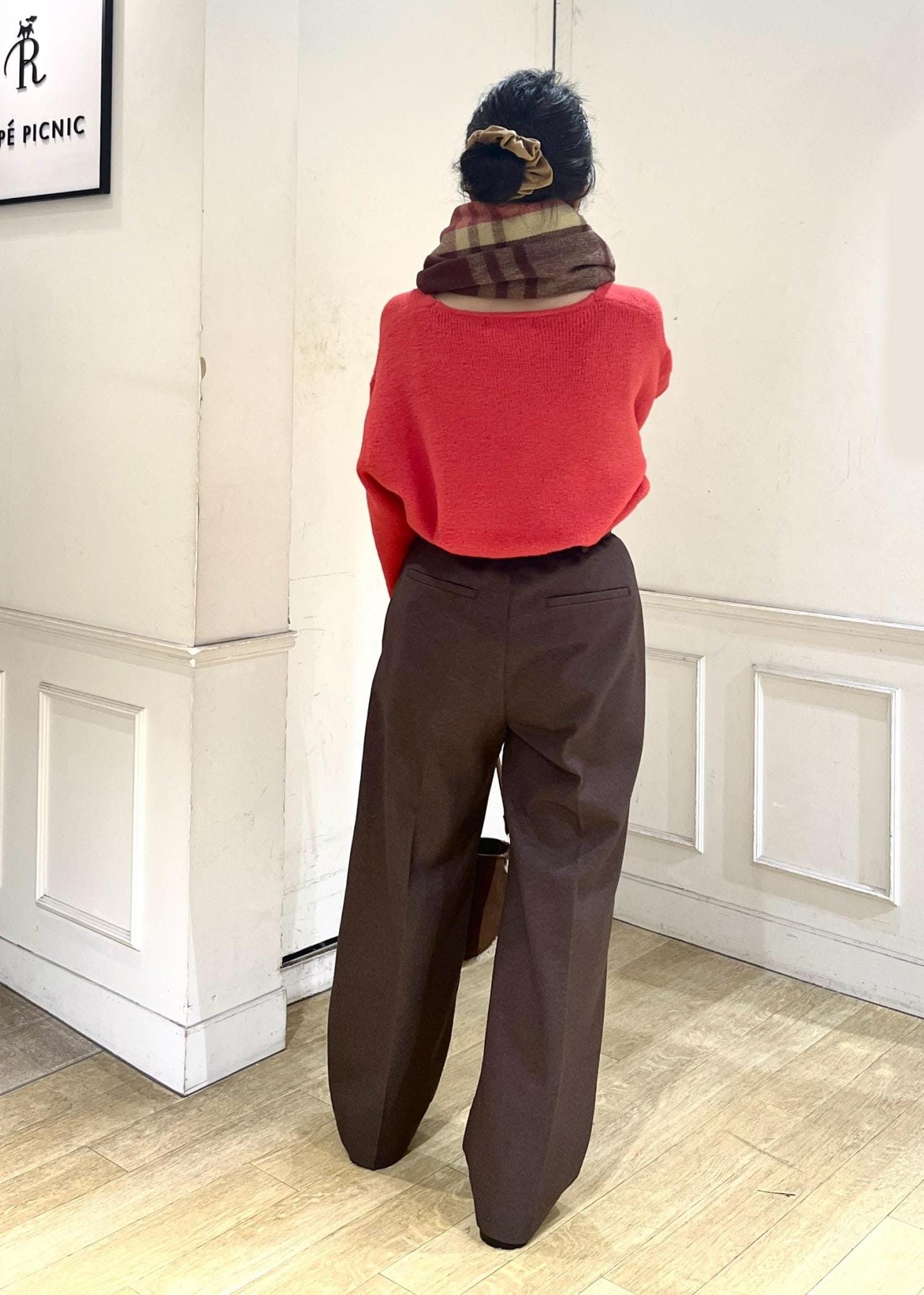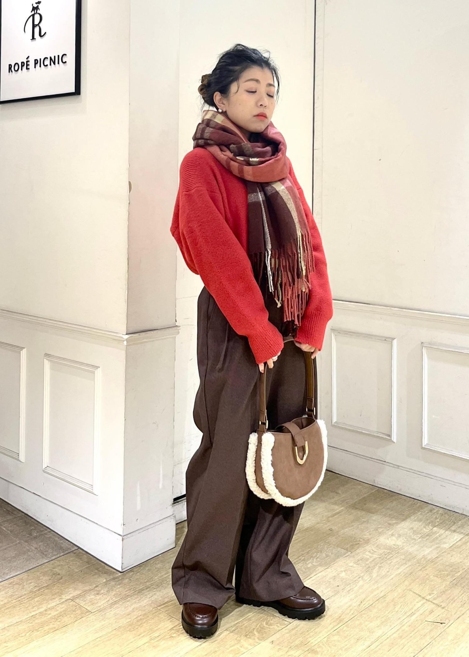 赤×ブラウンは定番可愛い組み合わせですがニットをウエストインしてちょっとでもきちんと綺麗見えするように☺︎