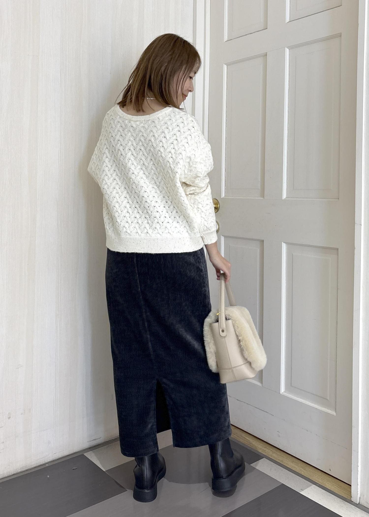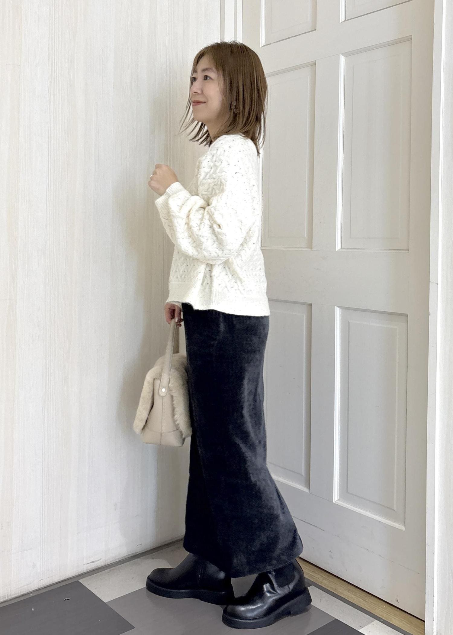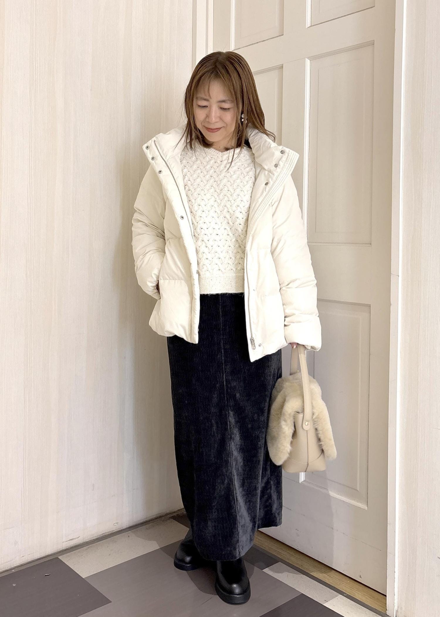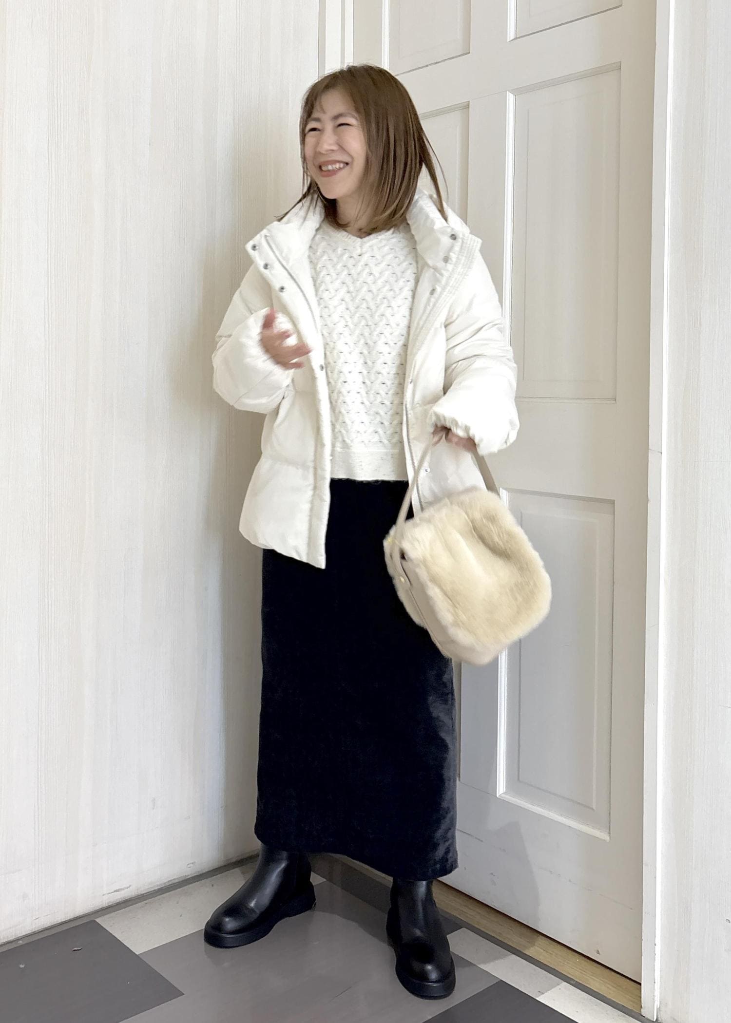 シルエットや生地がお値段以上なので、合わせたアイテムも高級感出てくれますが、スパンコールニットでキランとした季節感と、ブーツにダウンと、ダウン使いイメージのコーディネートです◎