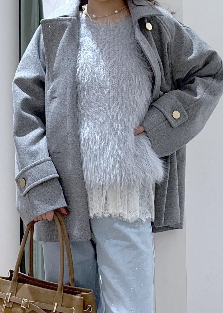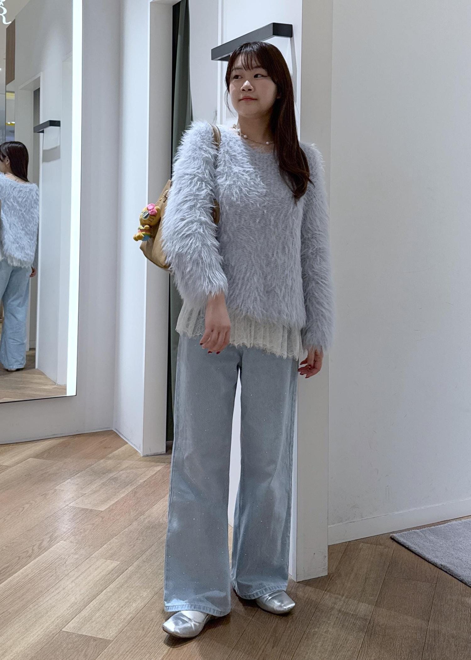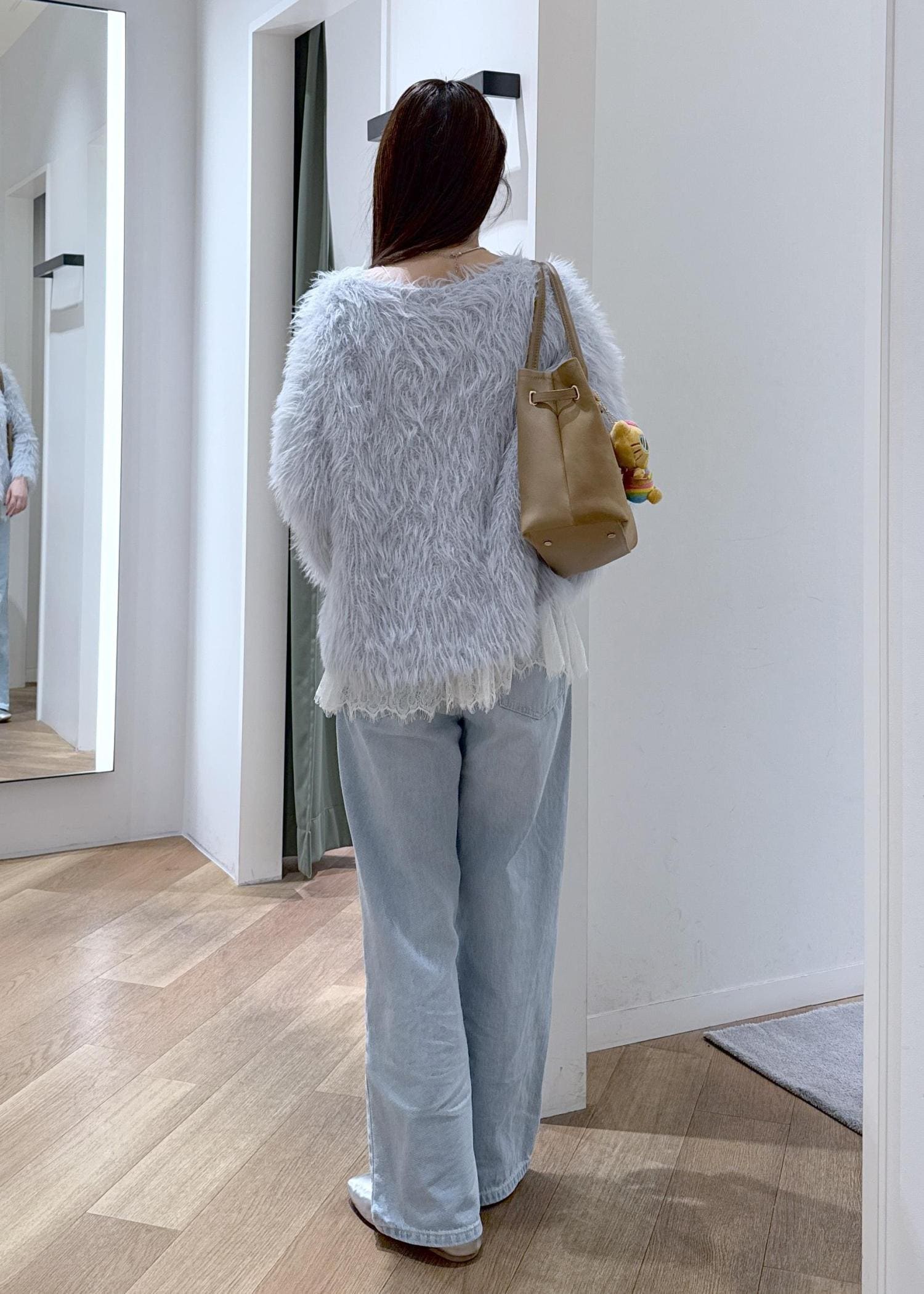 存在感のある毛足が長めのニットですが、デコルテラインが綺麗に見えるので、スッキリ見えします。