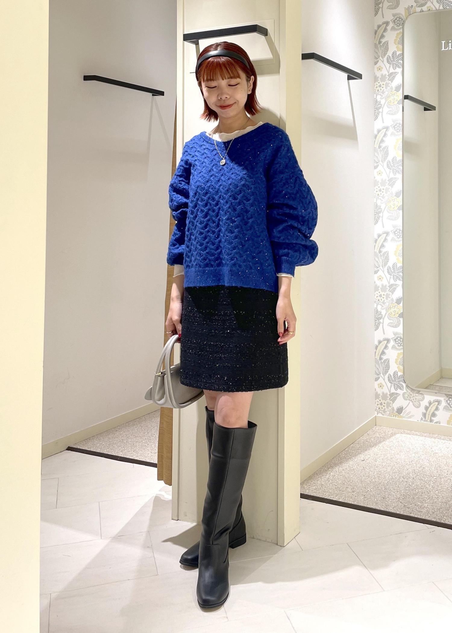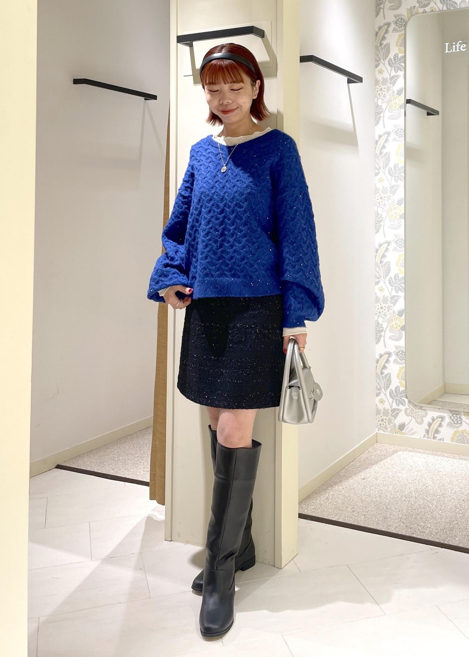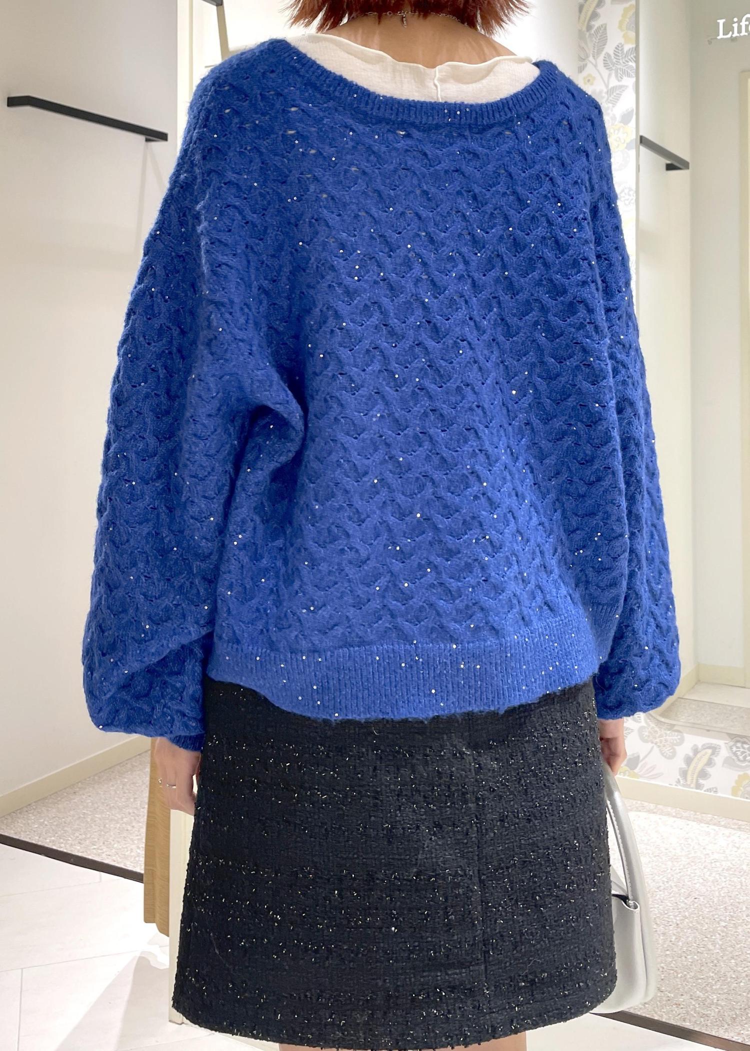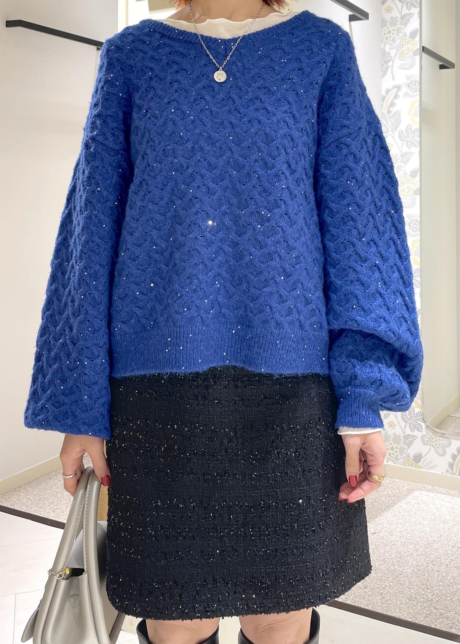 ざっくりとしたスパンコールニットに、シアートップスを合わせて顔まわりに明るさをプラスしたレイヤードスタイル。