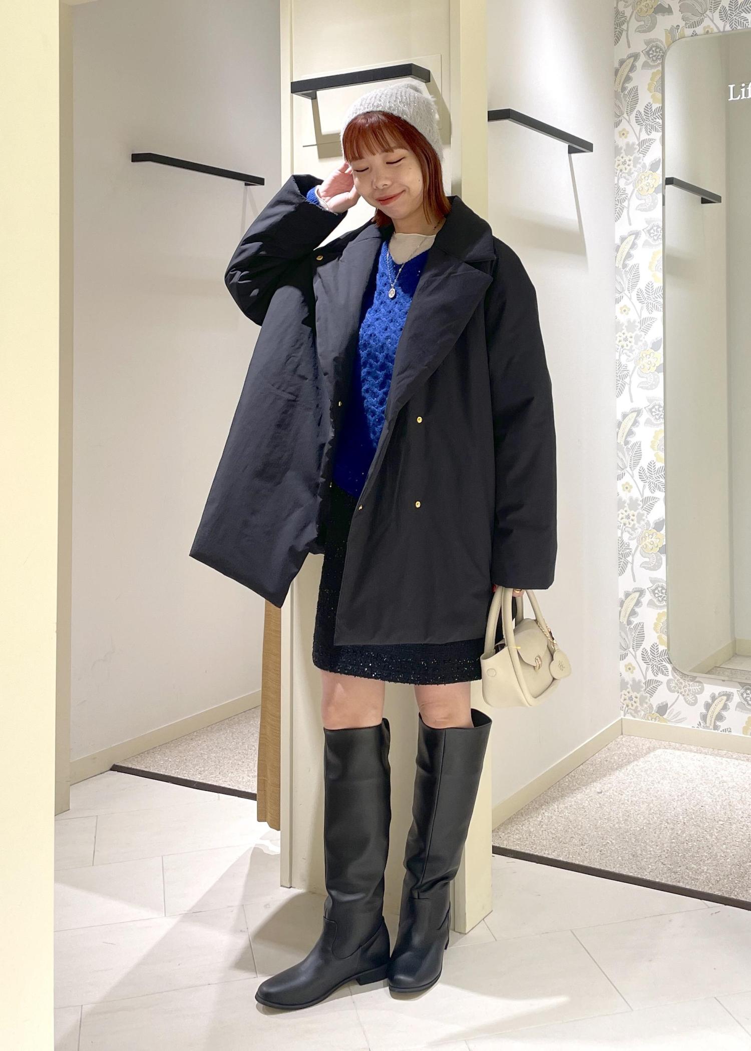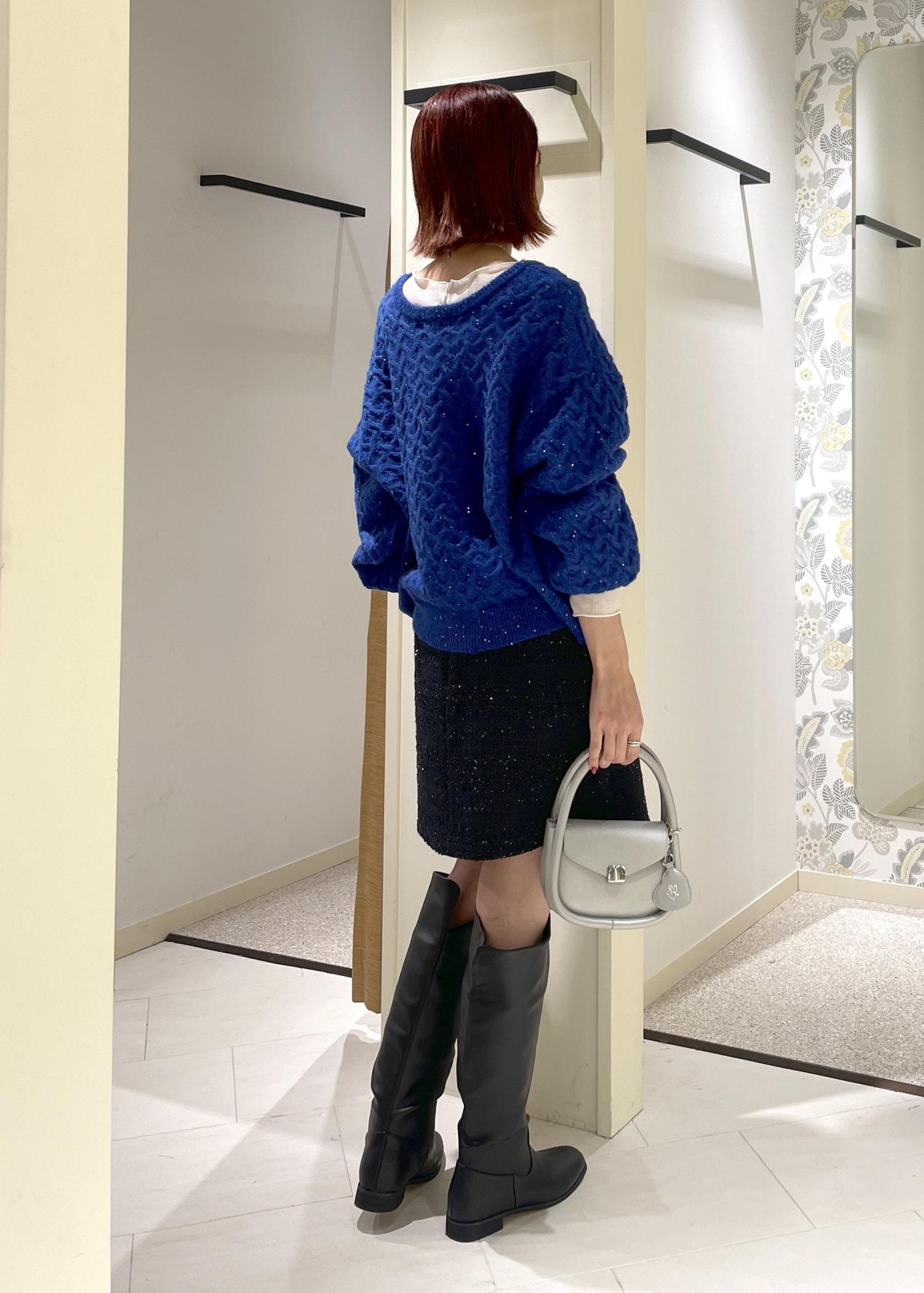 今回はブルーのニットが引き立つよう、ブラック系のカラーでまとめつつ、顔まわりが暗く見えないよう、シアーインナーやニット帽で明るさをプラスしてみました。