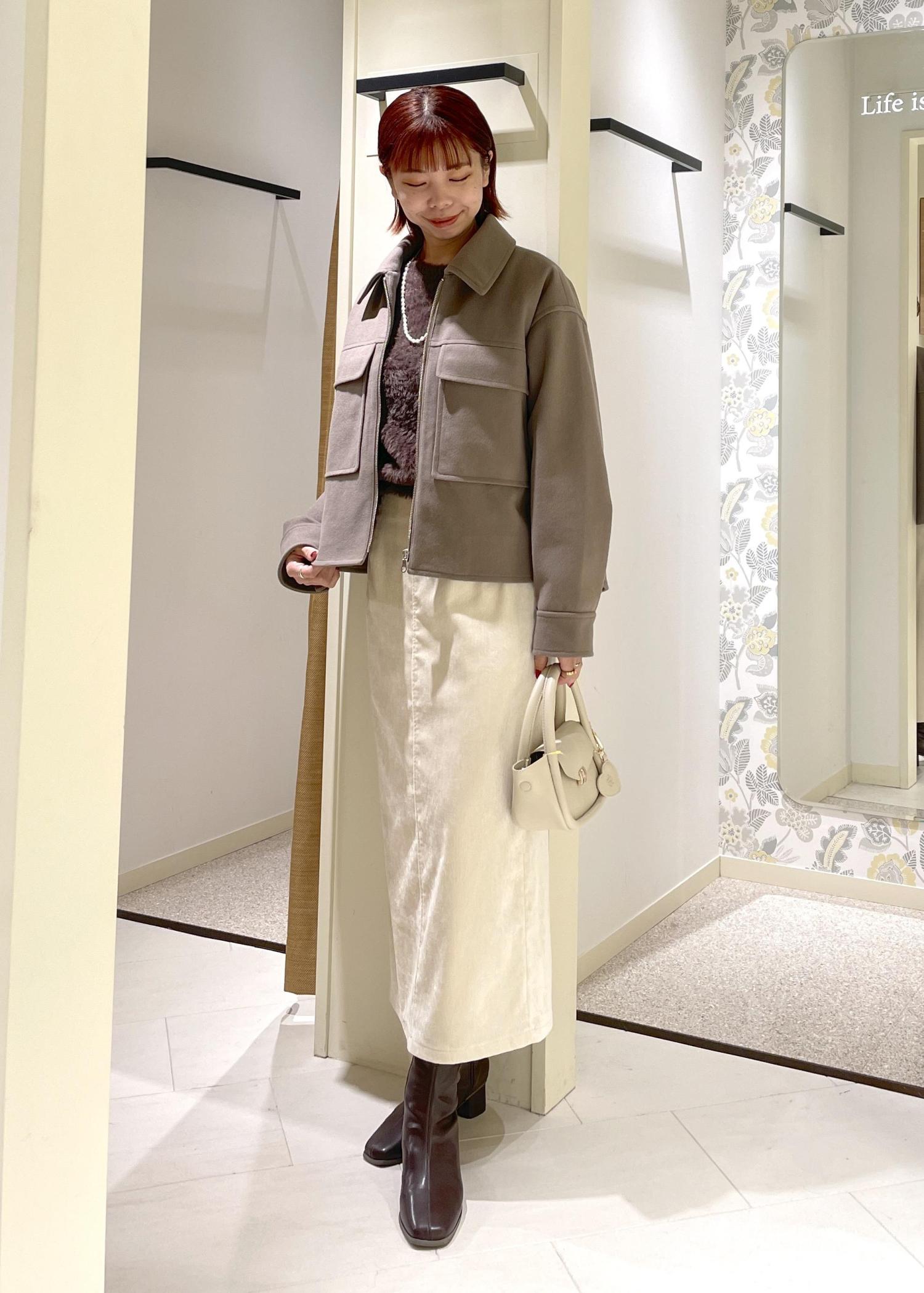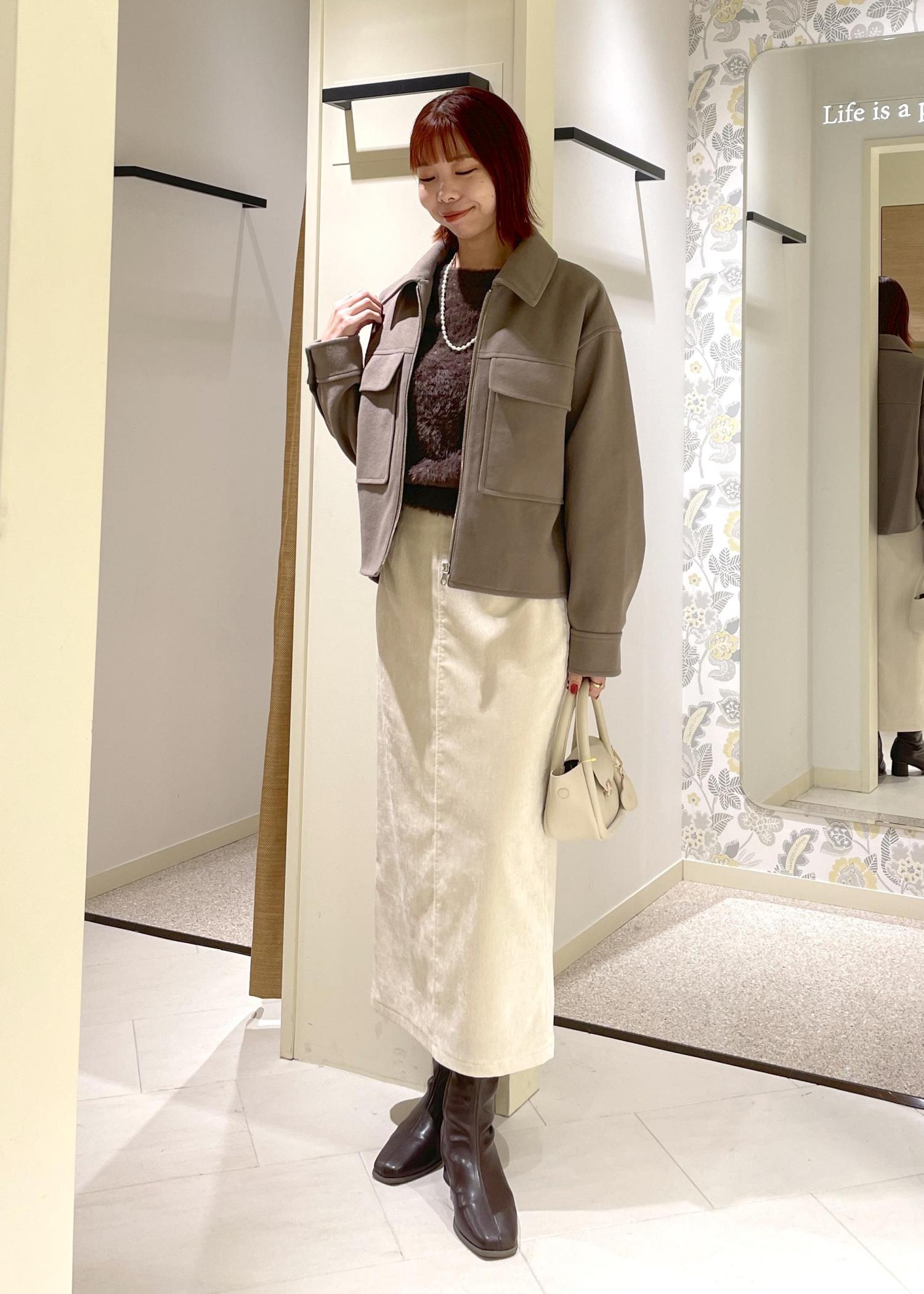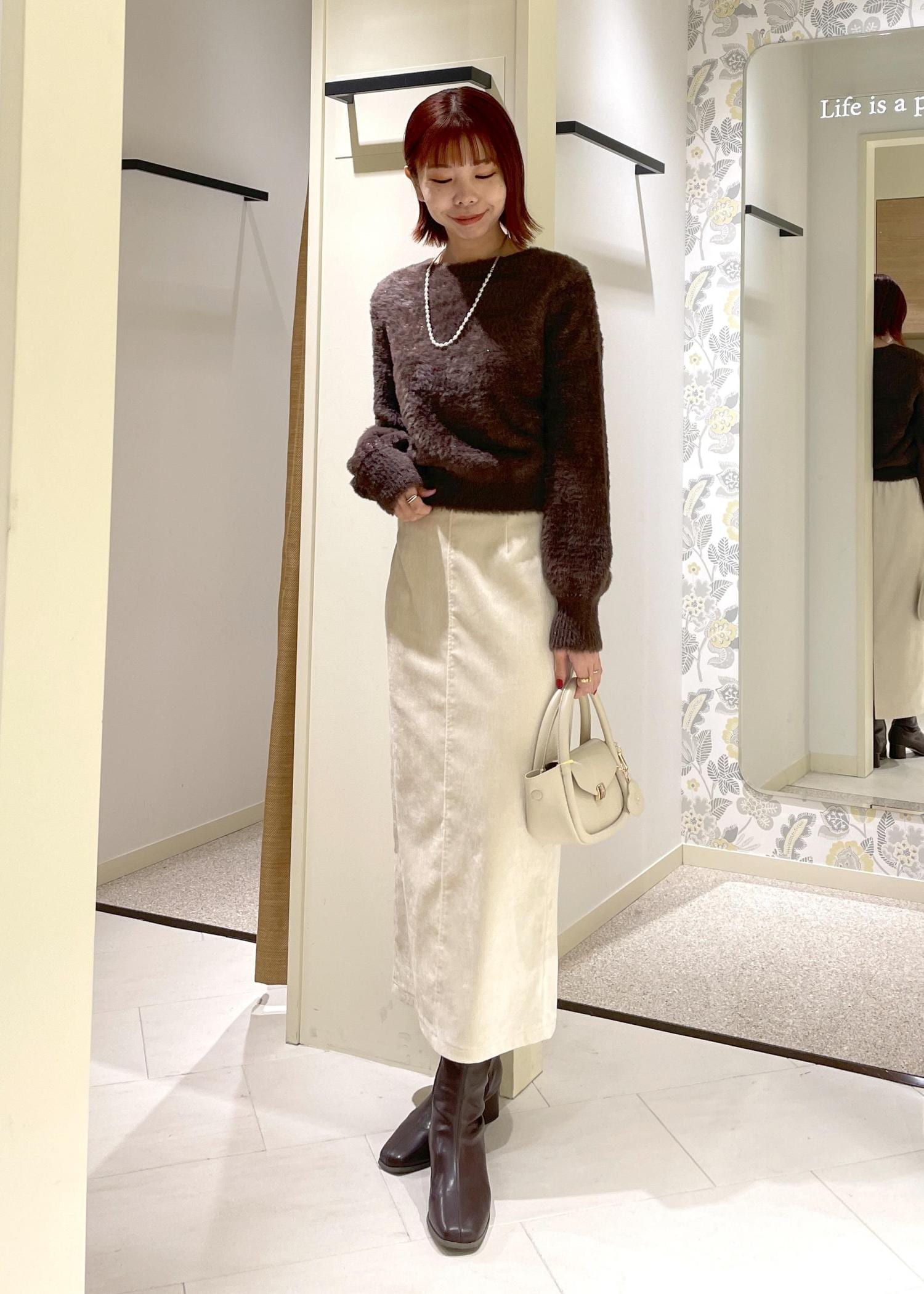 Iラインスカートにシャギーニットを合わせて、女性らしいスタイリングにまとめてみました。