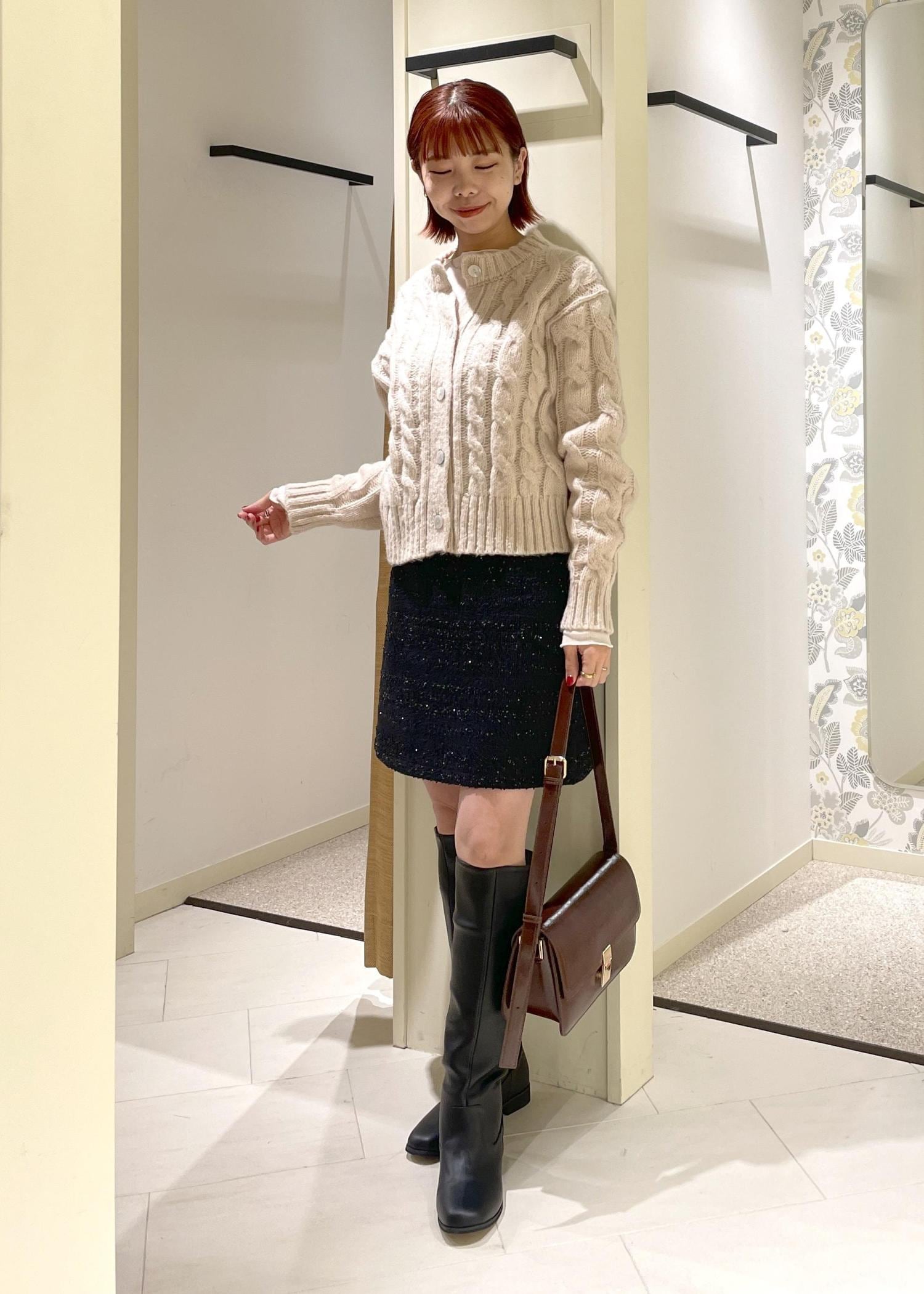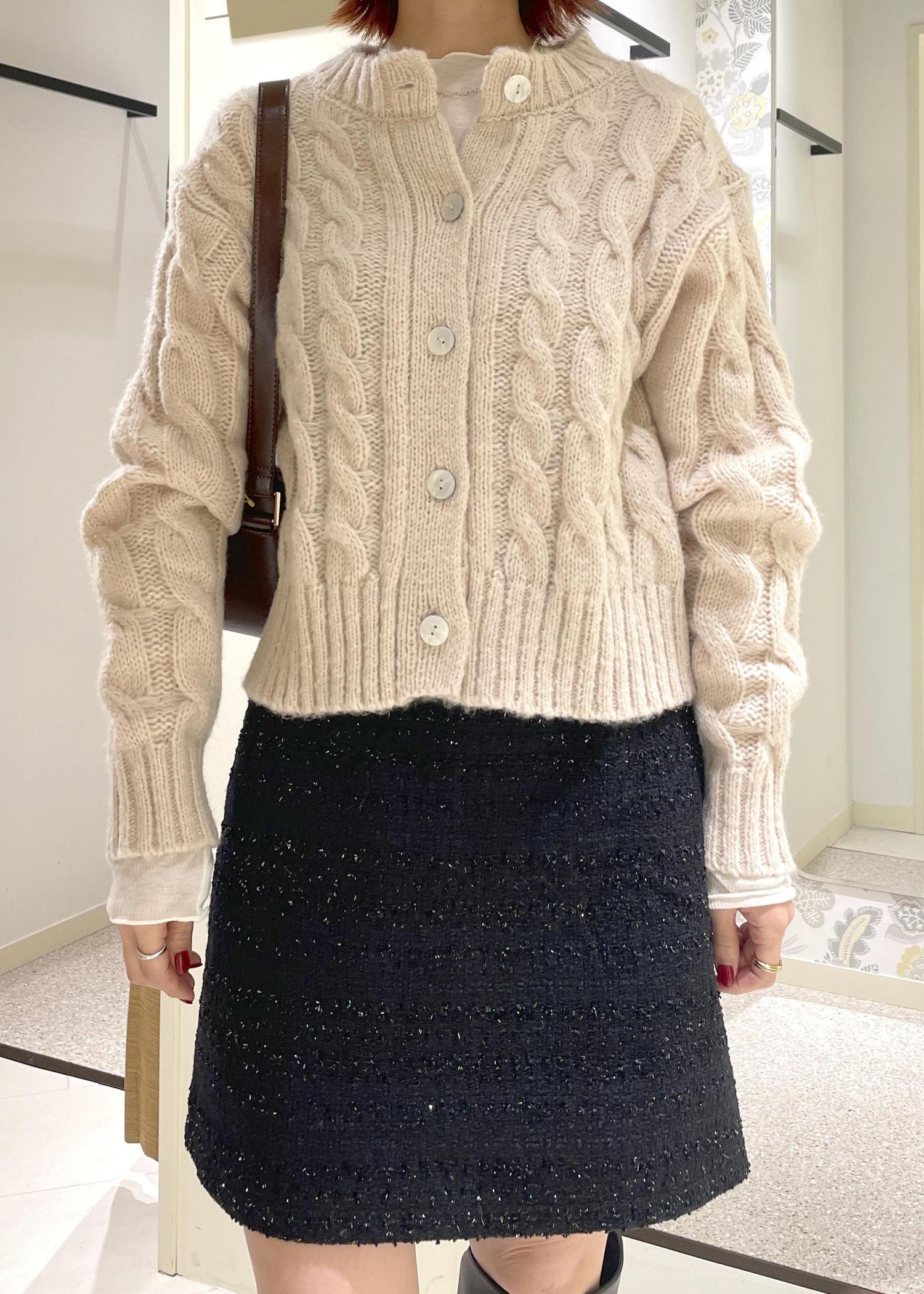 ふっくらと暖かみのあるケーブル編みニットカーディガンに、すっきりとしたミニスカートを合わせた冬コーデ。