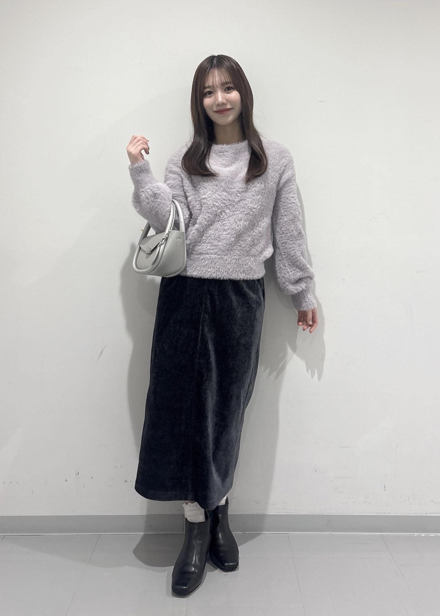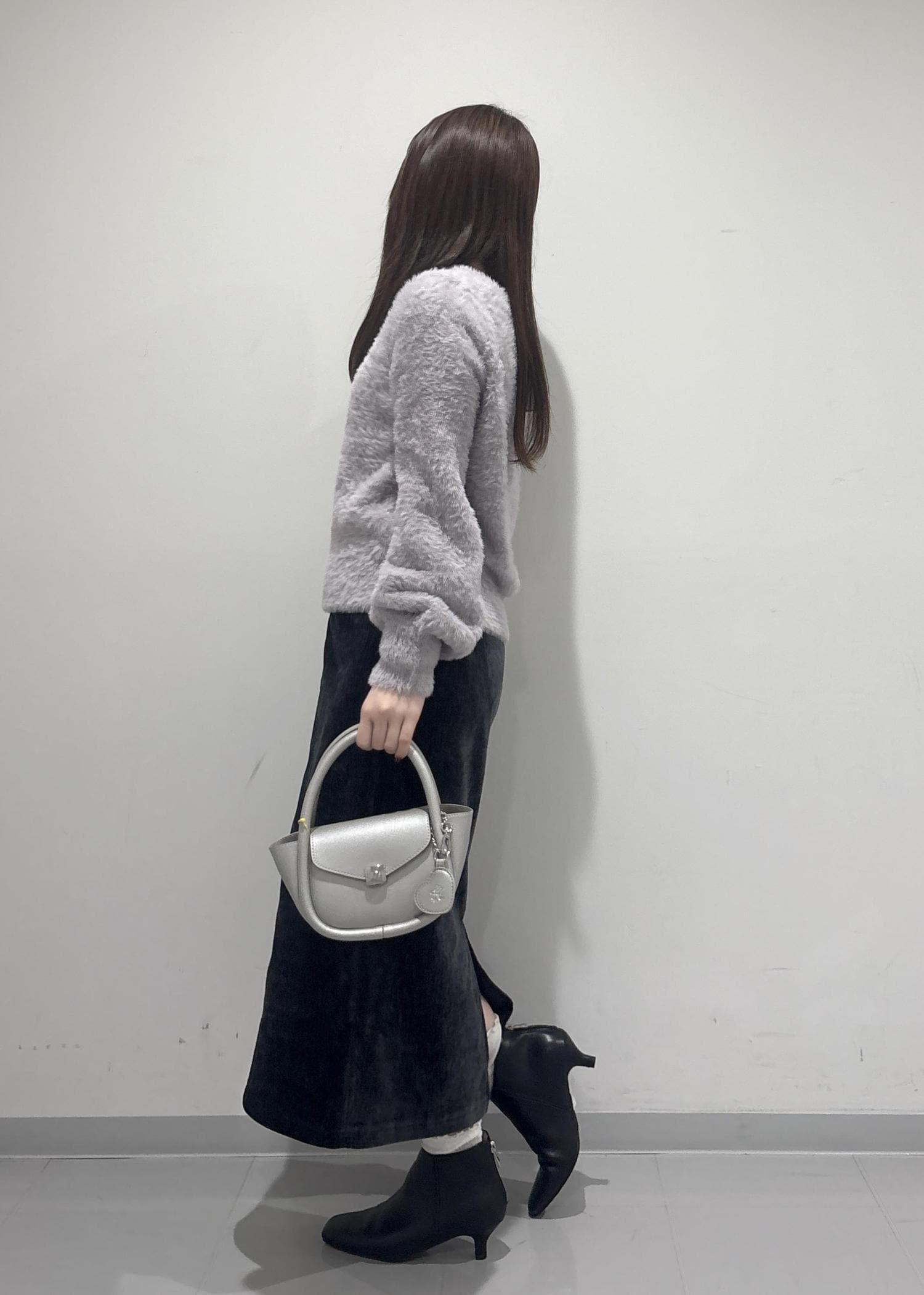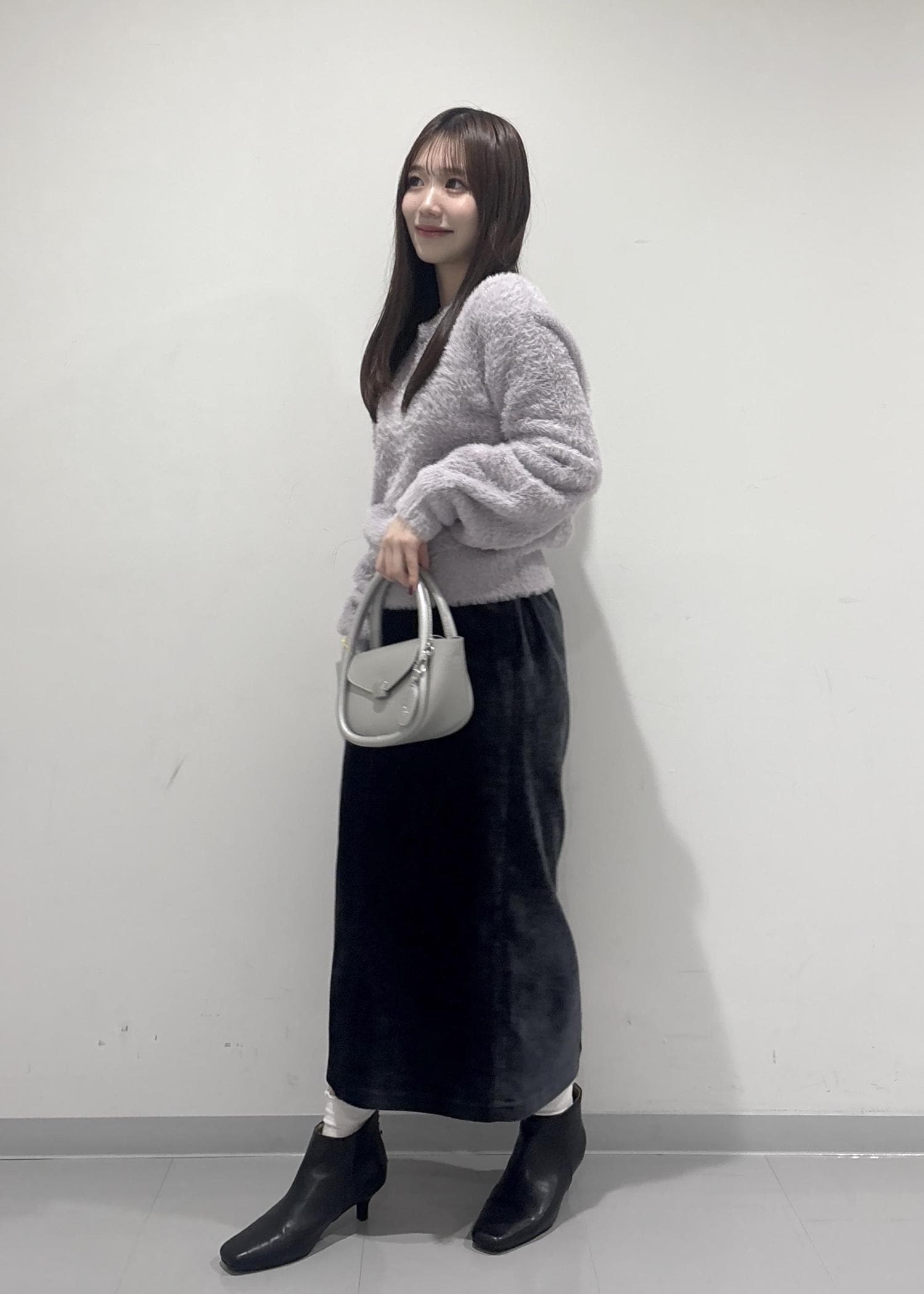 こちらのコーデのポイントは、パープルのニットです!ラメ感が可愛くてふわっと着用できるので女子会やデートで無双できること間違いなしです!黒色のスカートで大人っぽい印象を出して、目に惹かれやすいハートのバッグで女性らしい印象にしてみました!