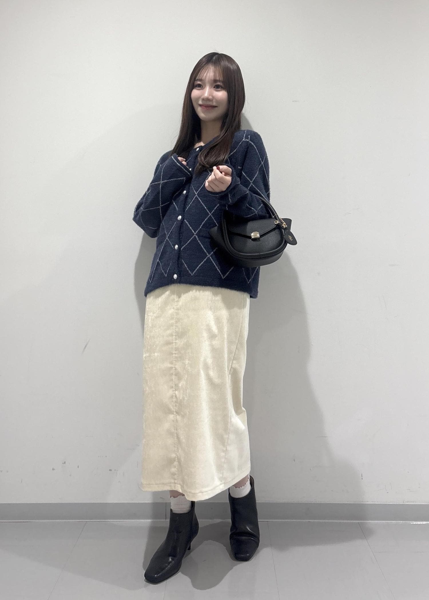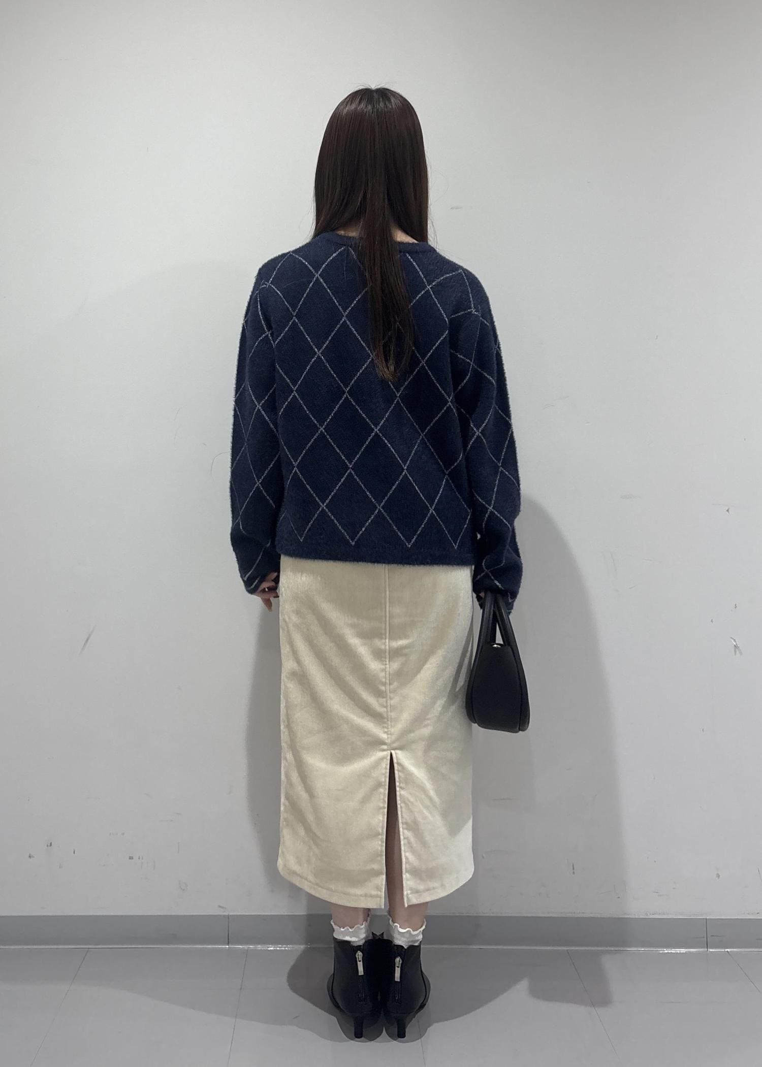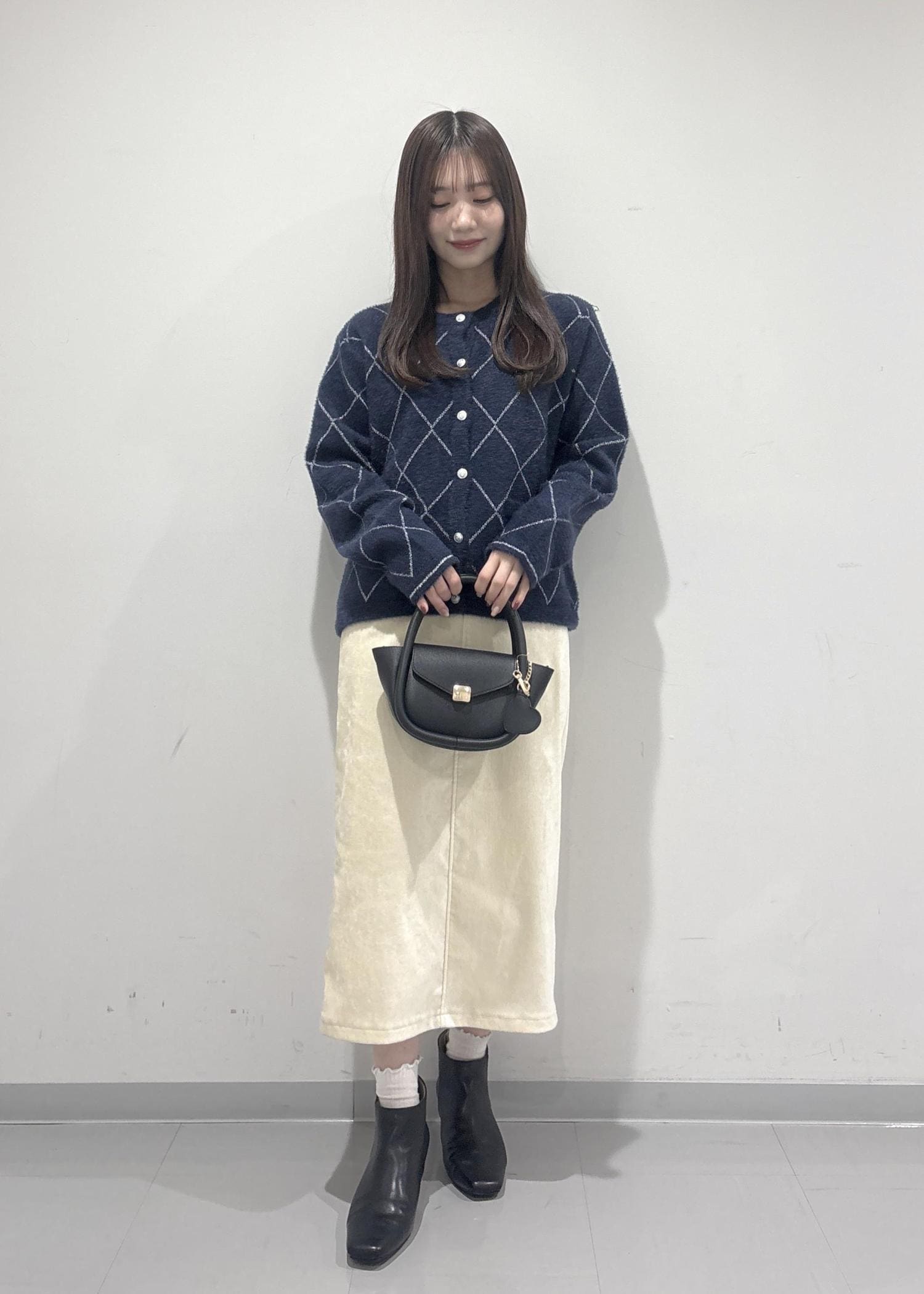 こちらのコーデのポイントは、ラメ感のあるフェザーカーディガンです!シルバーのラメ糸が刺繍されていてより一層冬っぽい印象になります!白色のスカートで明るい雰囲気を出してみました!