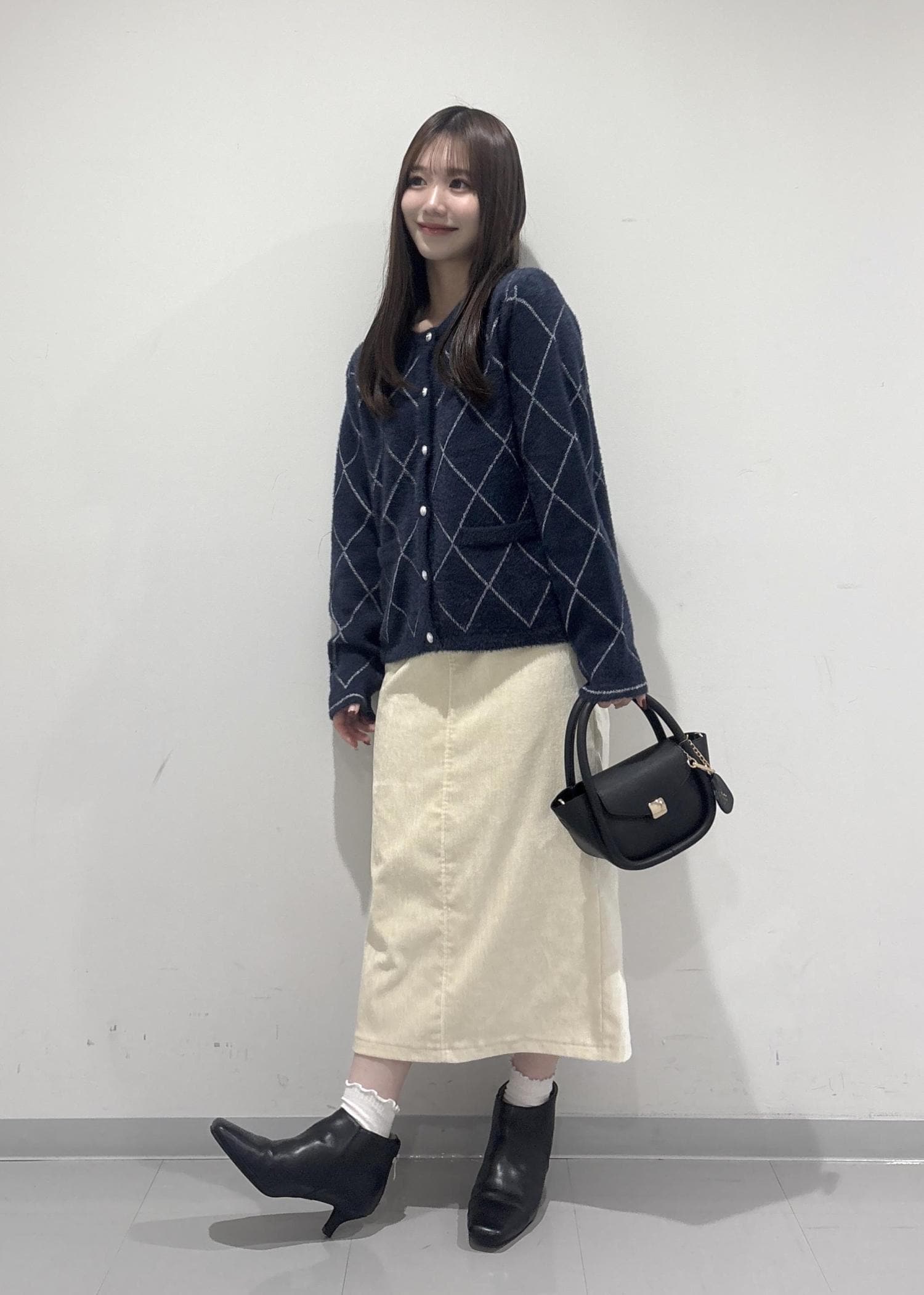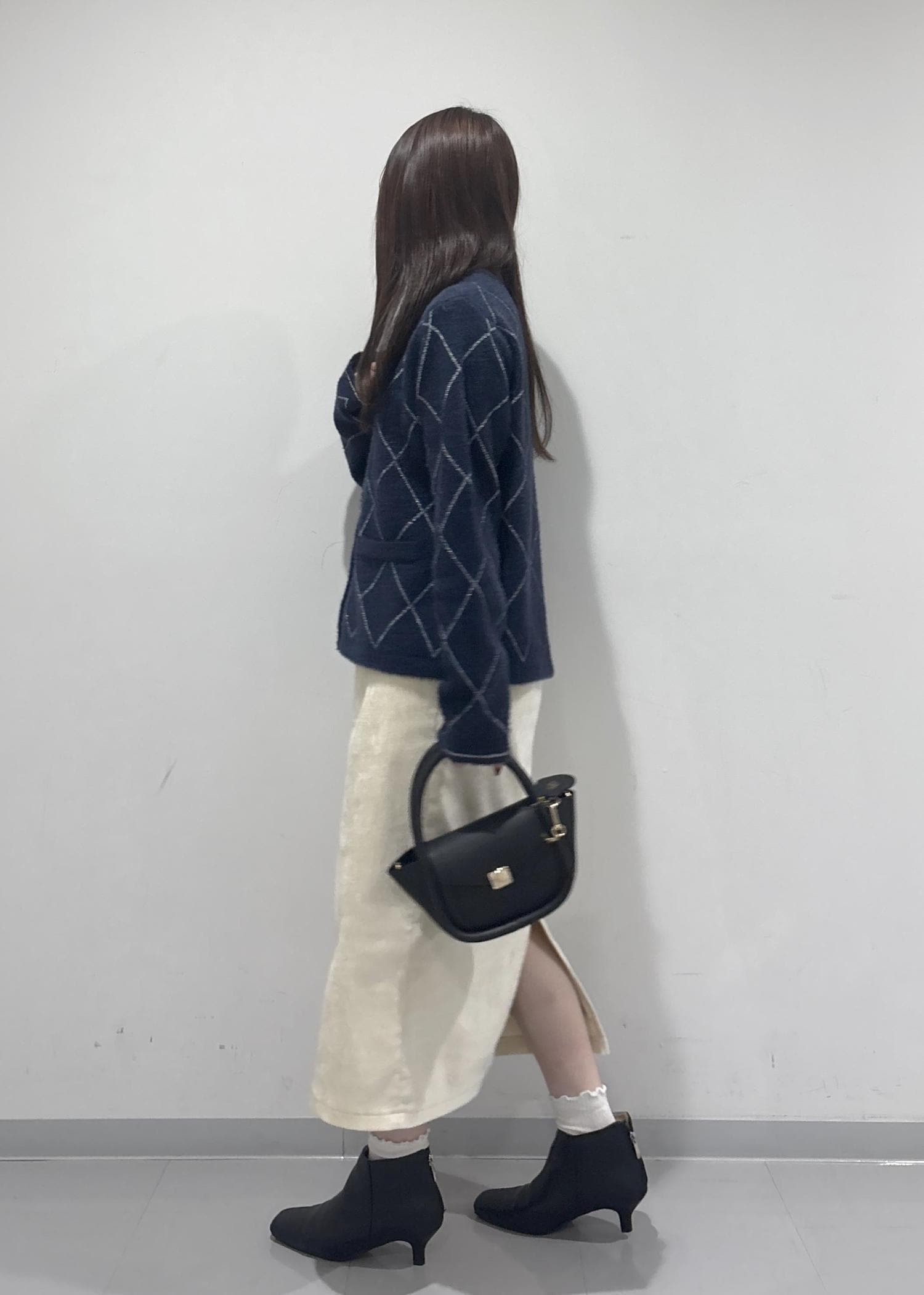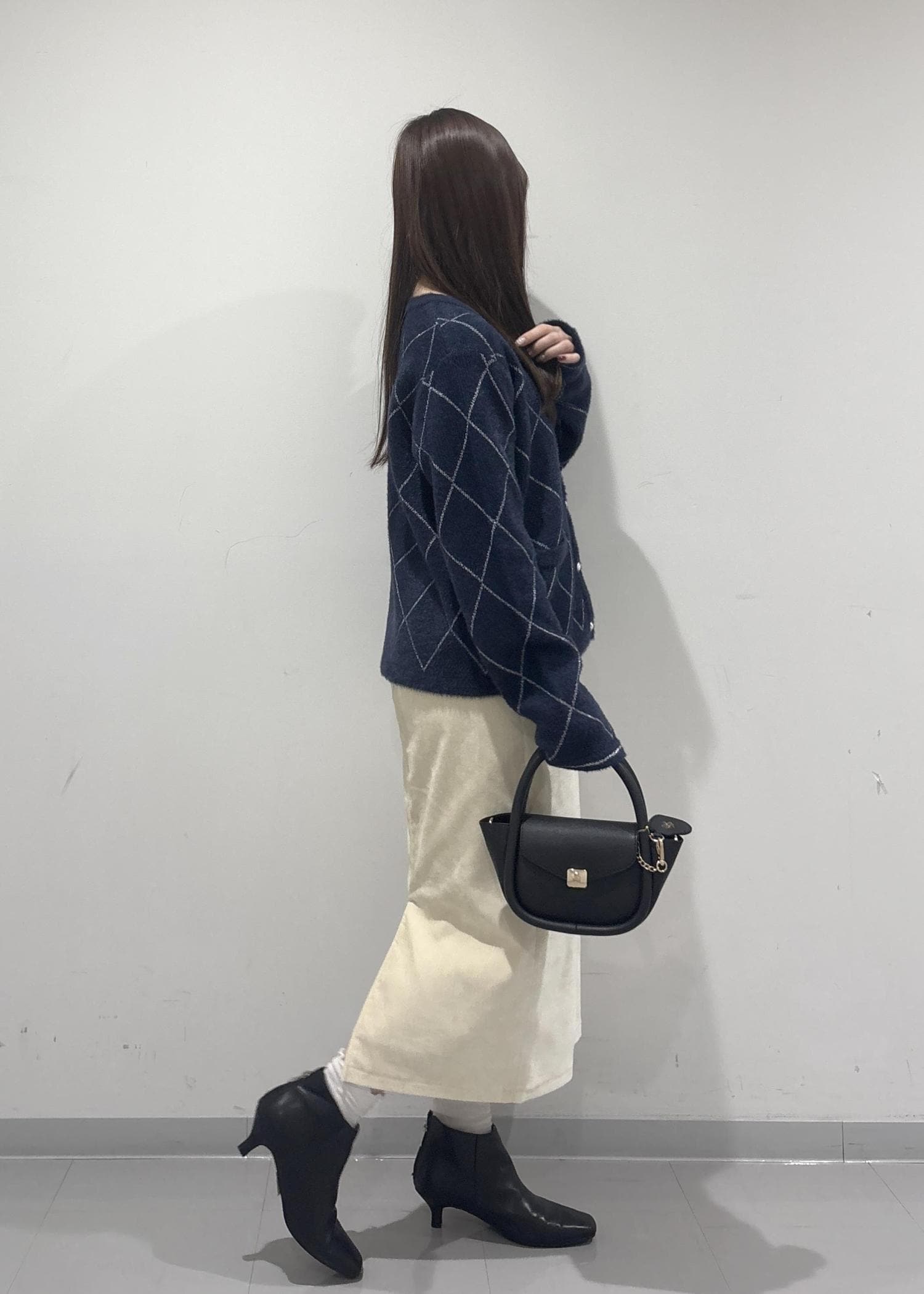 こちらのコーデのポイントは、ラメ感のあるフェザーカーディガンです!シルバーのラメ糸が刺繍されていてより一層冬っぽい印象になります!白色のスカートで明るい雰囲気を出してみました!