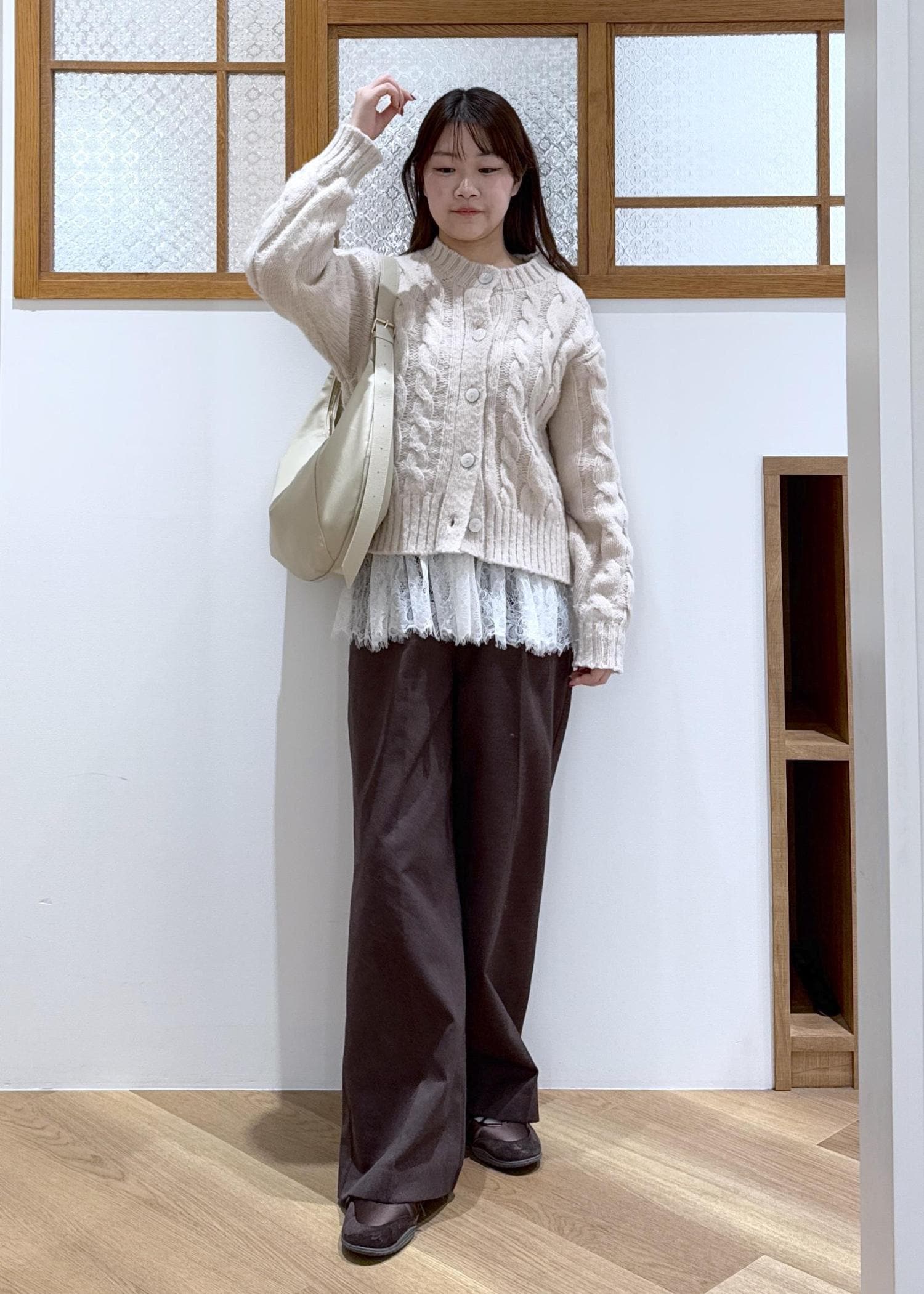 ベージュ〜ブラウンのグラデーションを意識したコーディネートで、フェミニンな柔らかい雰囲気を演出。