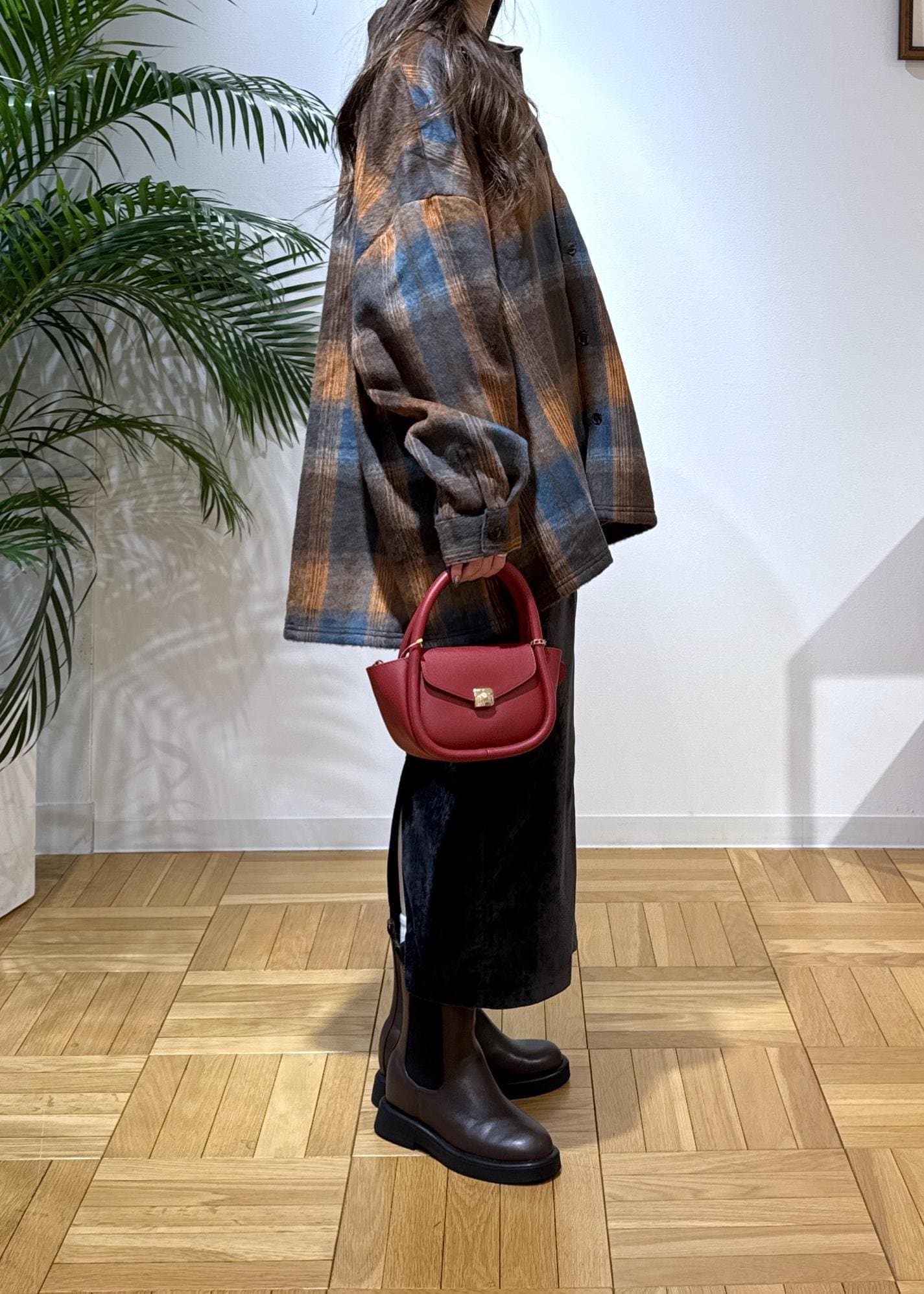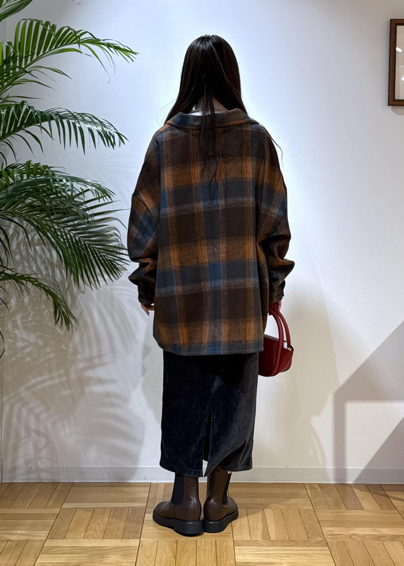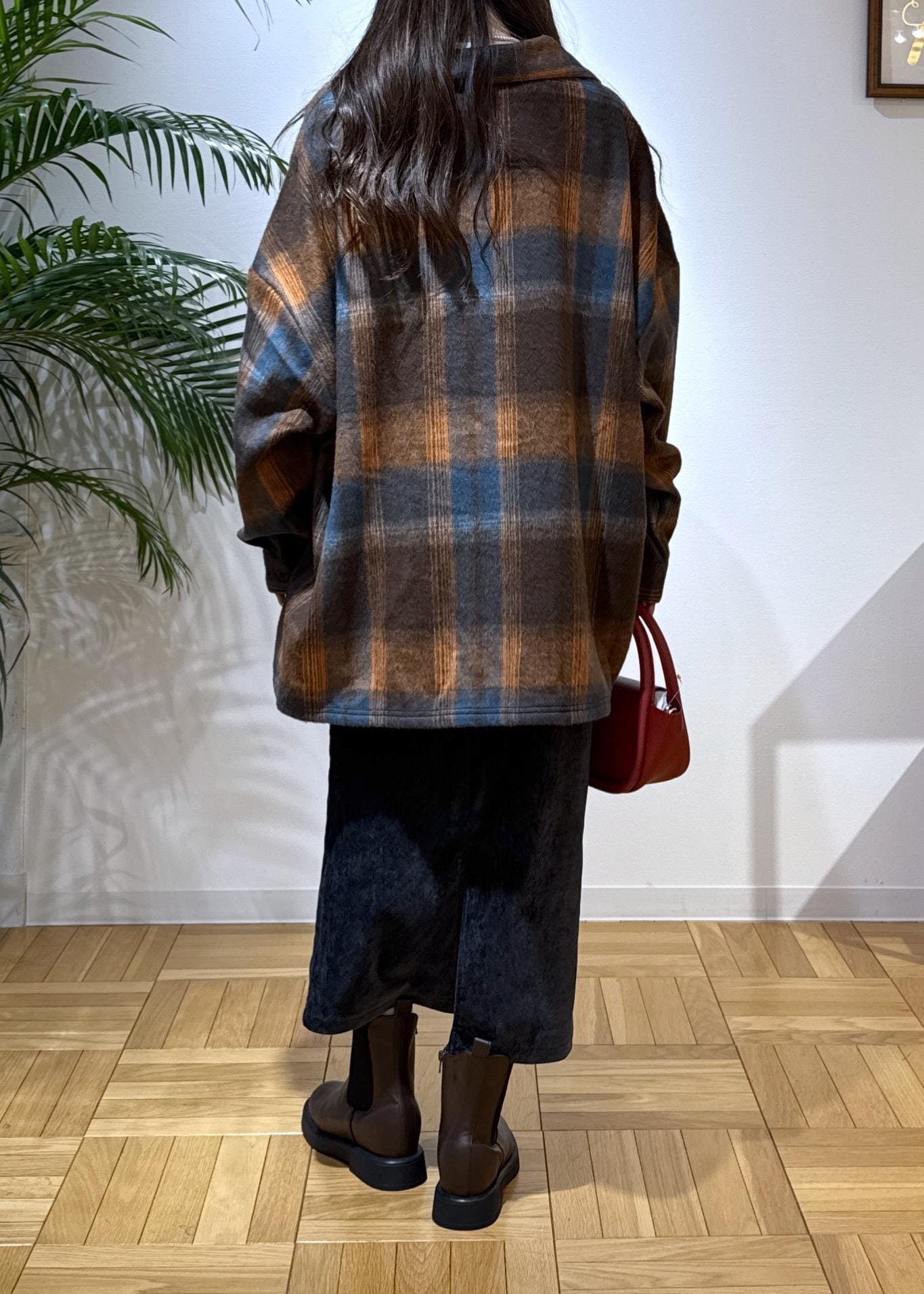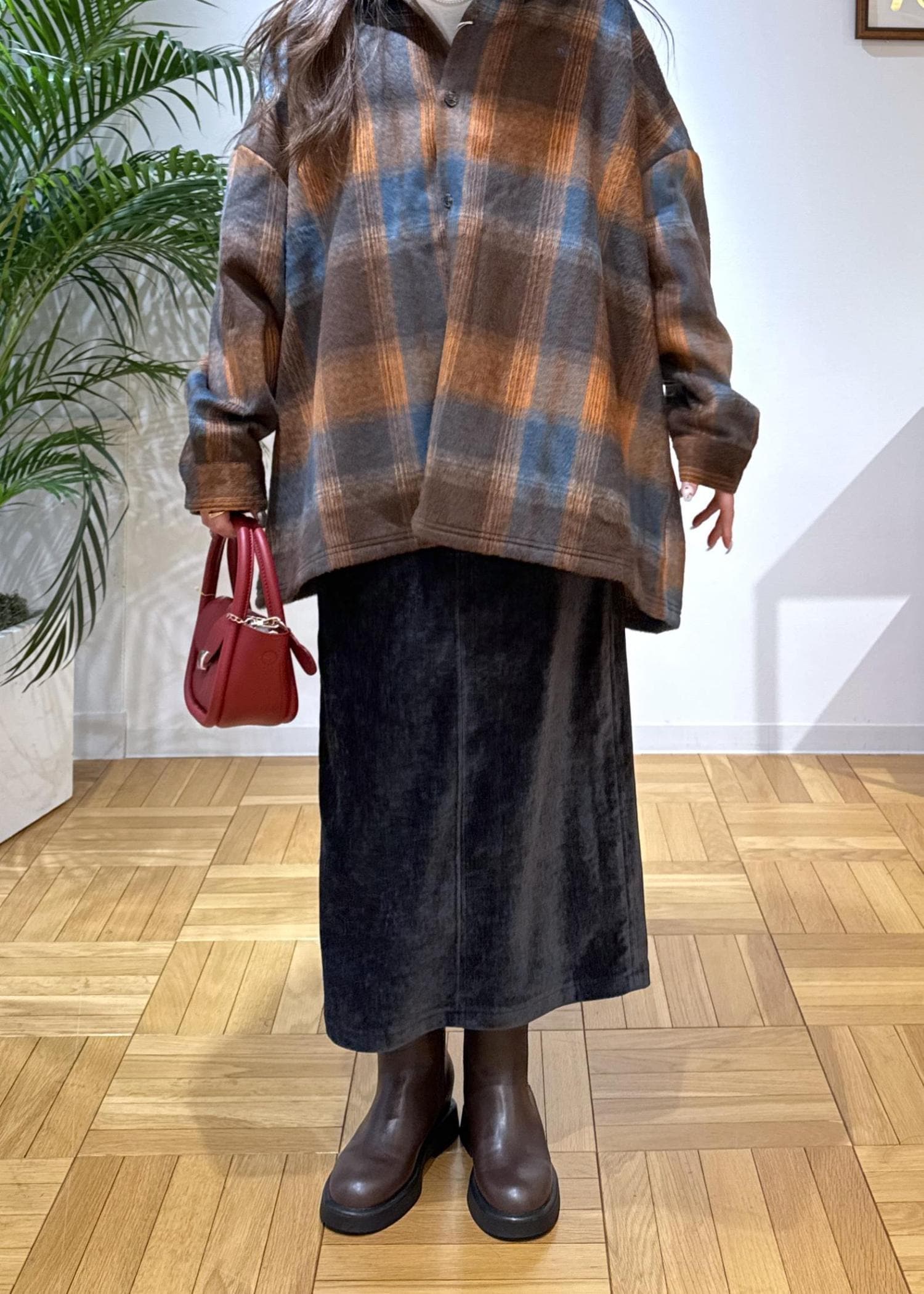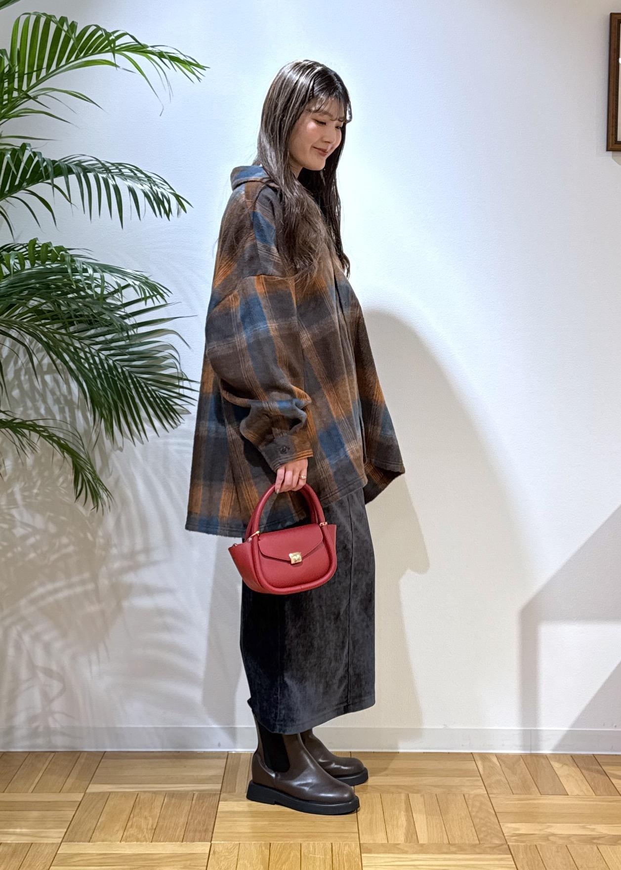 オーバーシルエットのシャツでカジュアルにしつつ、アイラインスカートで女性らしさもプラスしました。