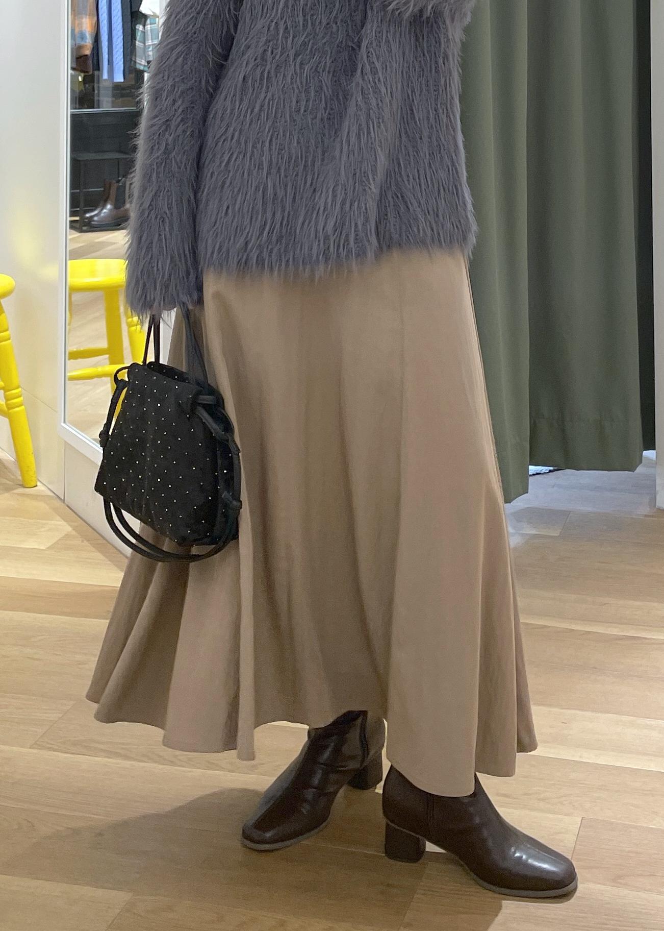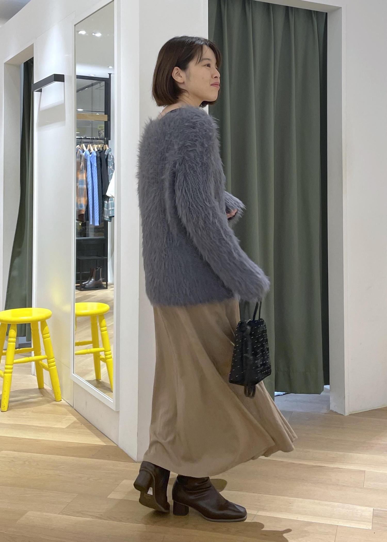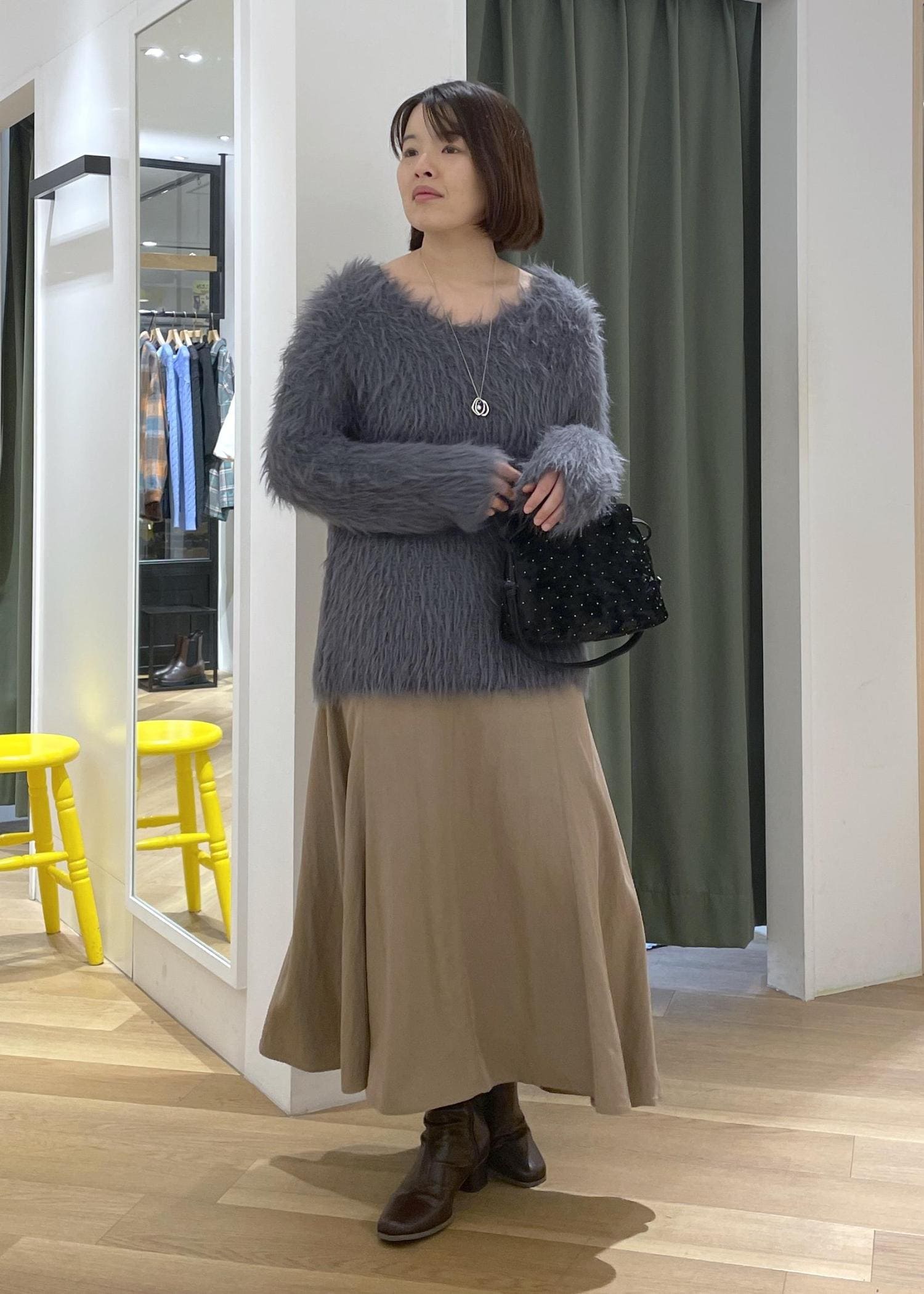 1枚で着映えが叶うフェザーニットに、落ち感のあるロングスカートを合わせて、品良く決まる冬のお出かけコーデに!