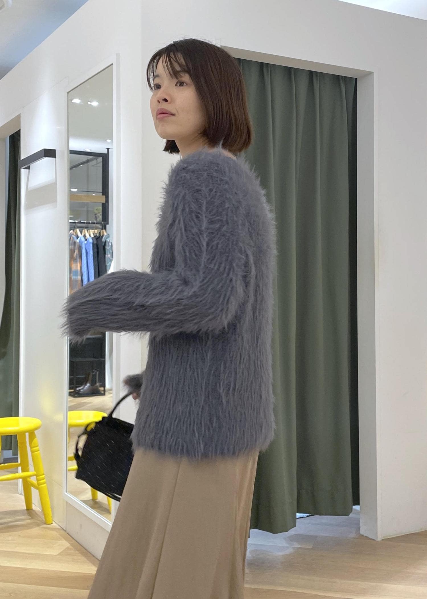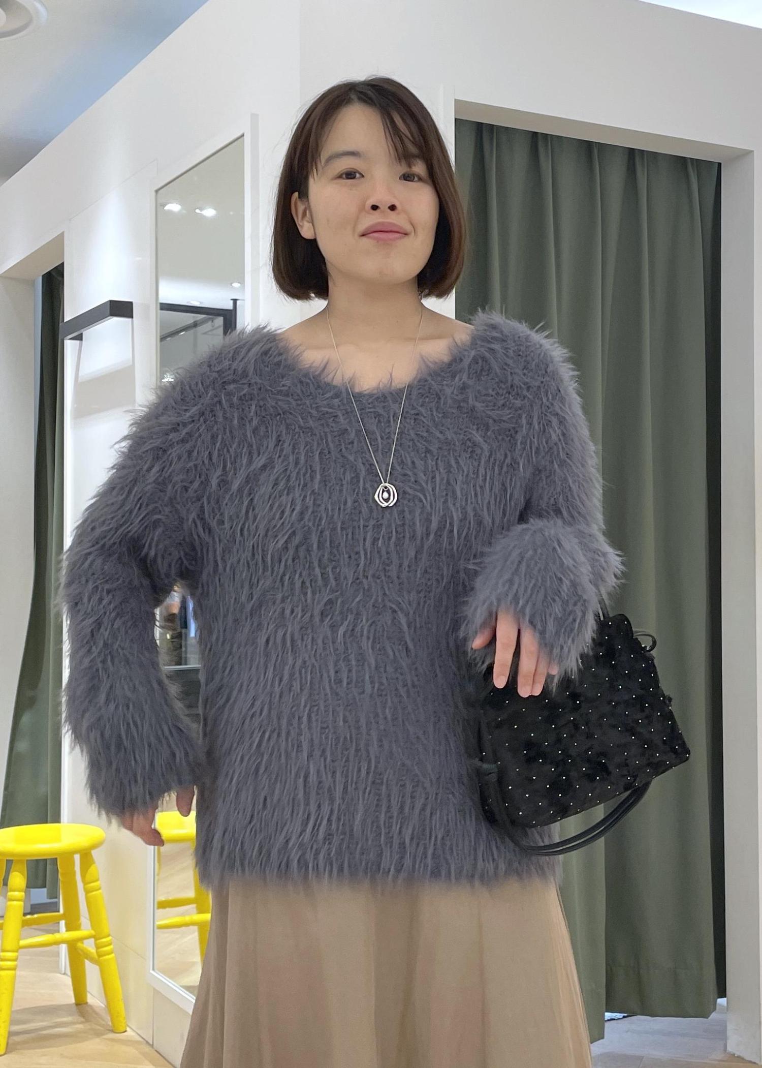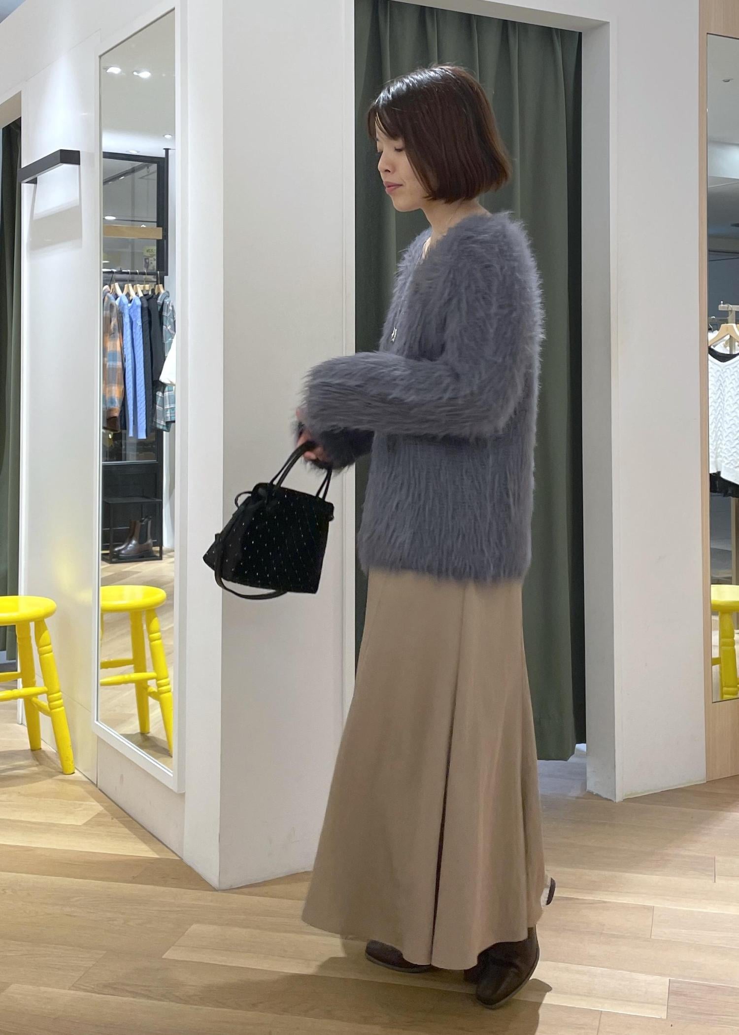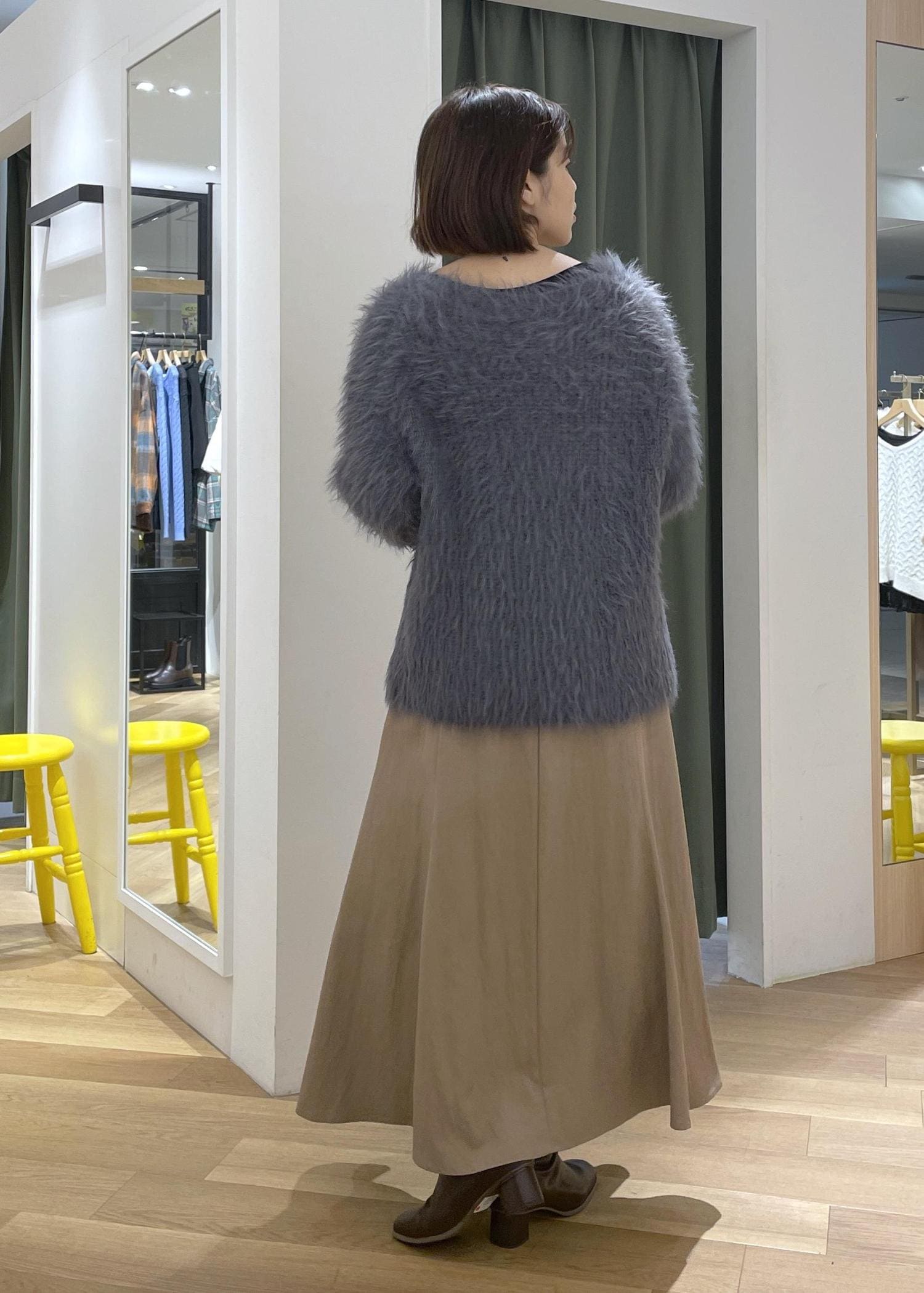 1枚で着映えが叶うフェザーニットに、落ち感のあるロングスカートを合わせて、品良く決まる冬のお出かけコーデに!