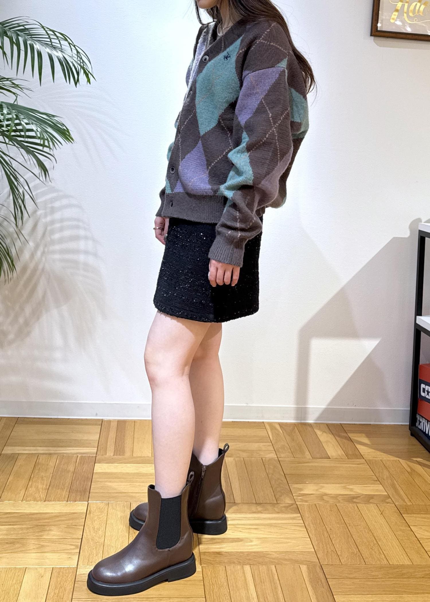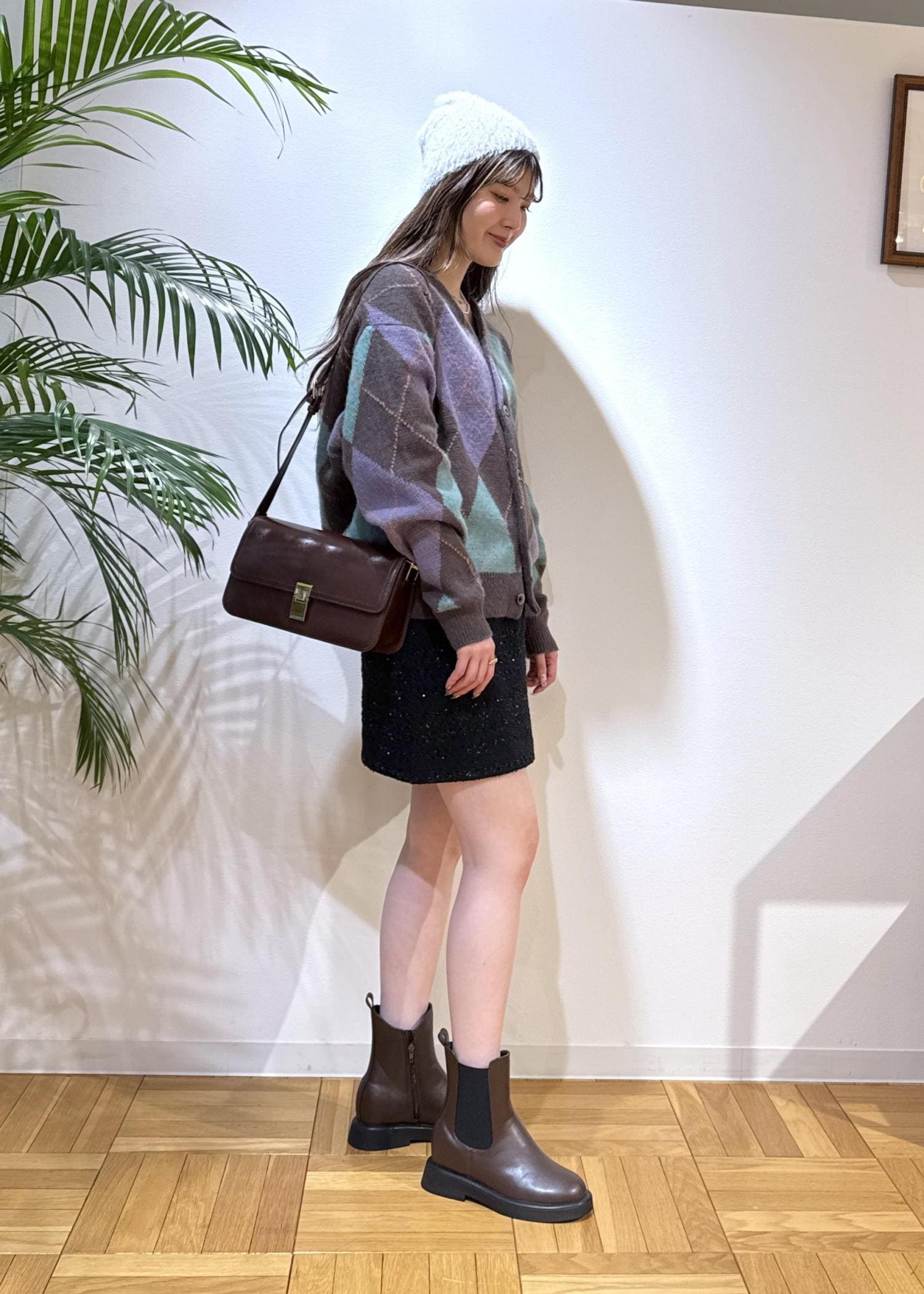 ゆったりシルエットのカーディガンとツイードミニスカートで冬のお出かけコーデ風。