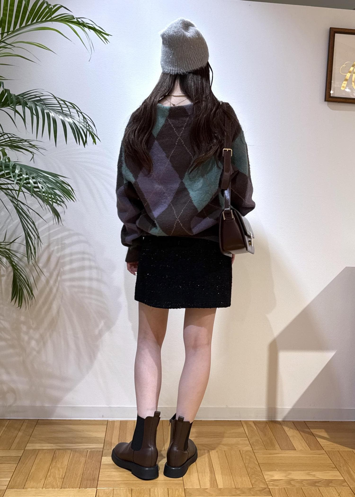キラキラのニット帽とキラキラのツイードスカートが冬っぽくて、お買い物にぴったりなスタイリングです!