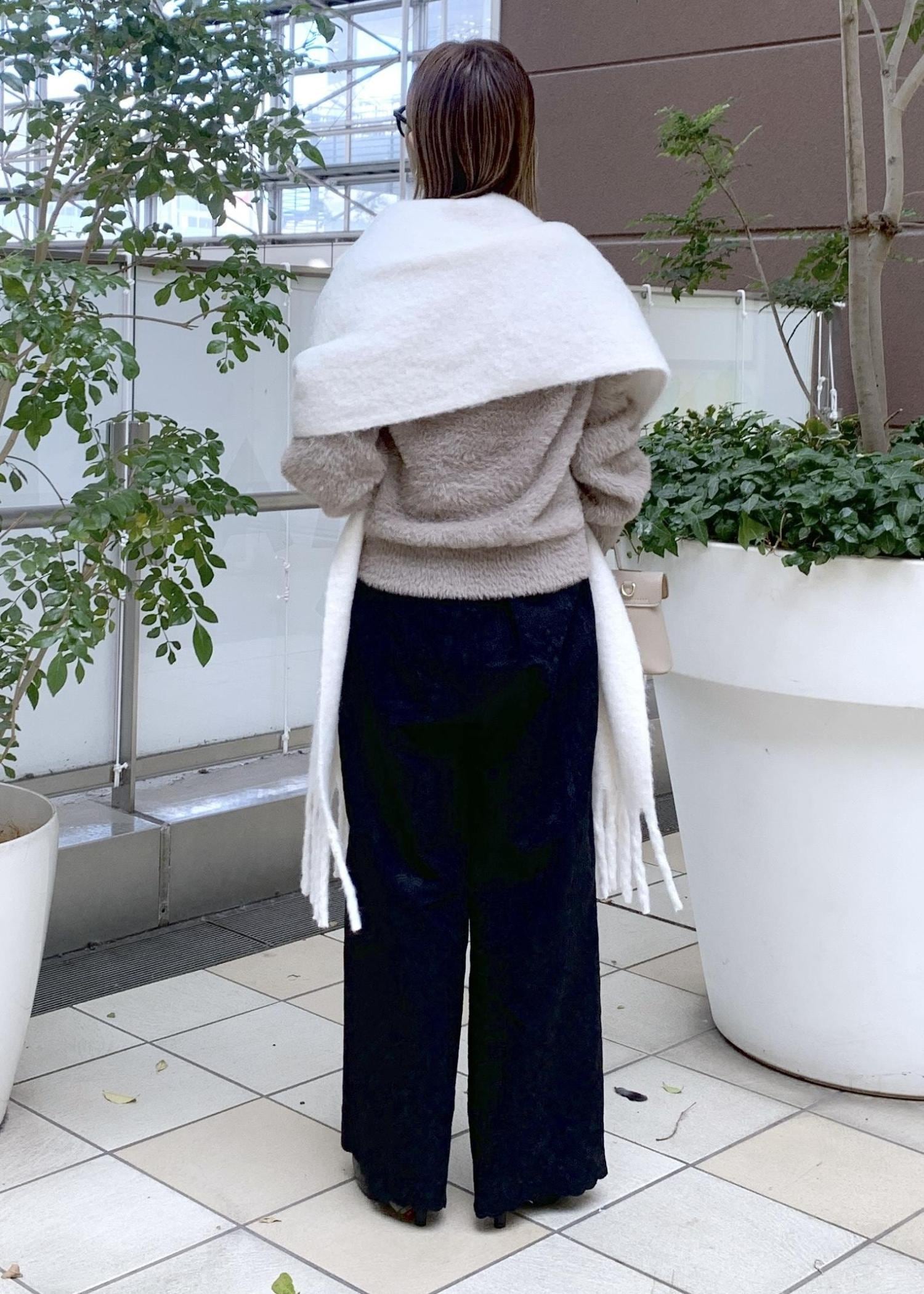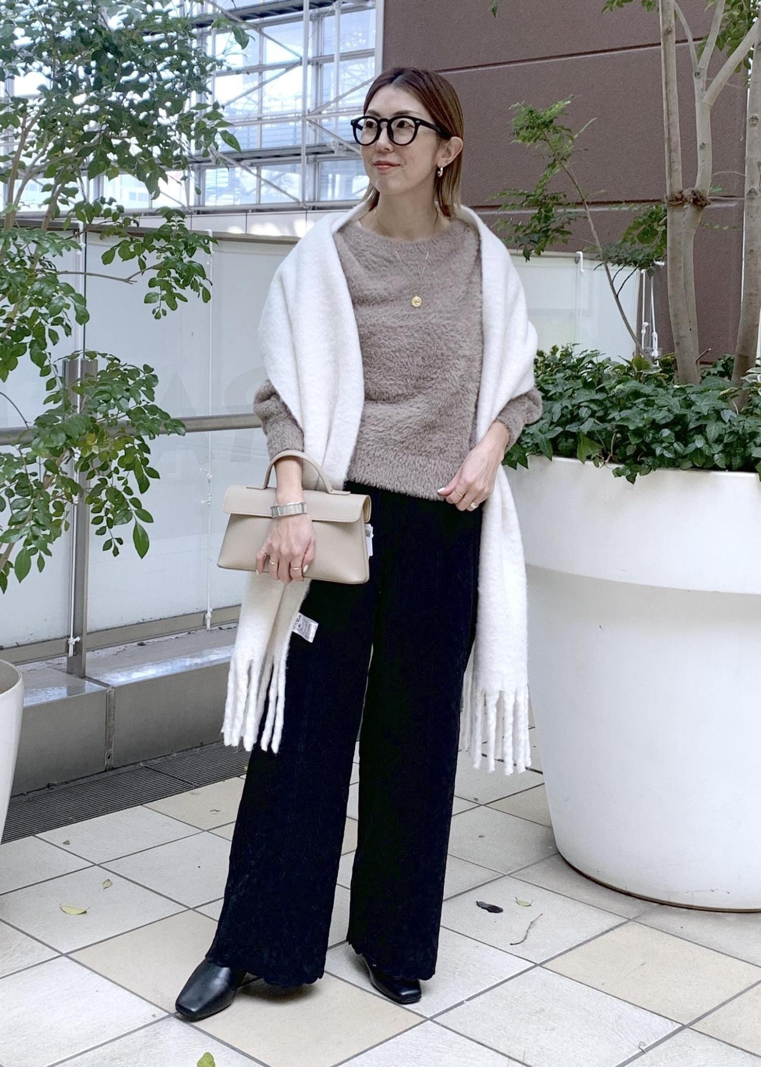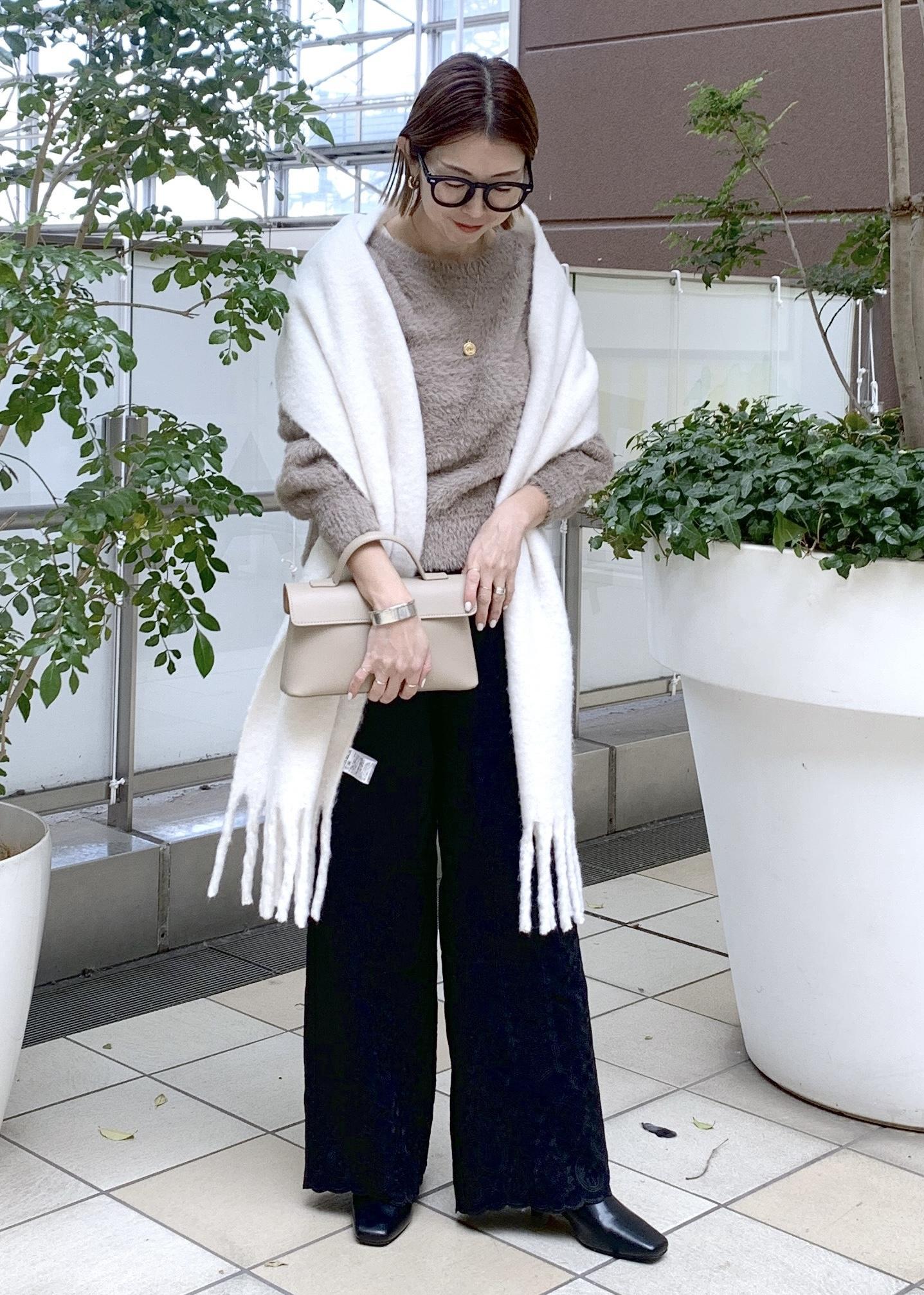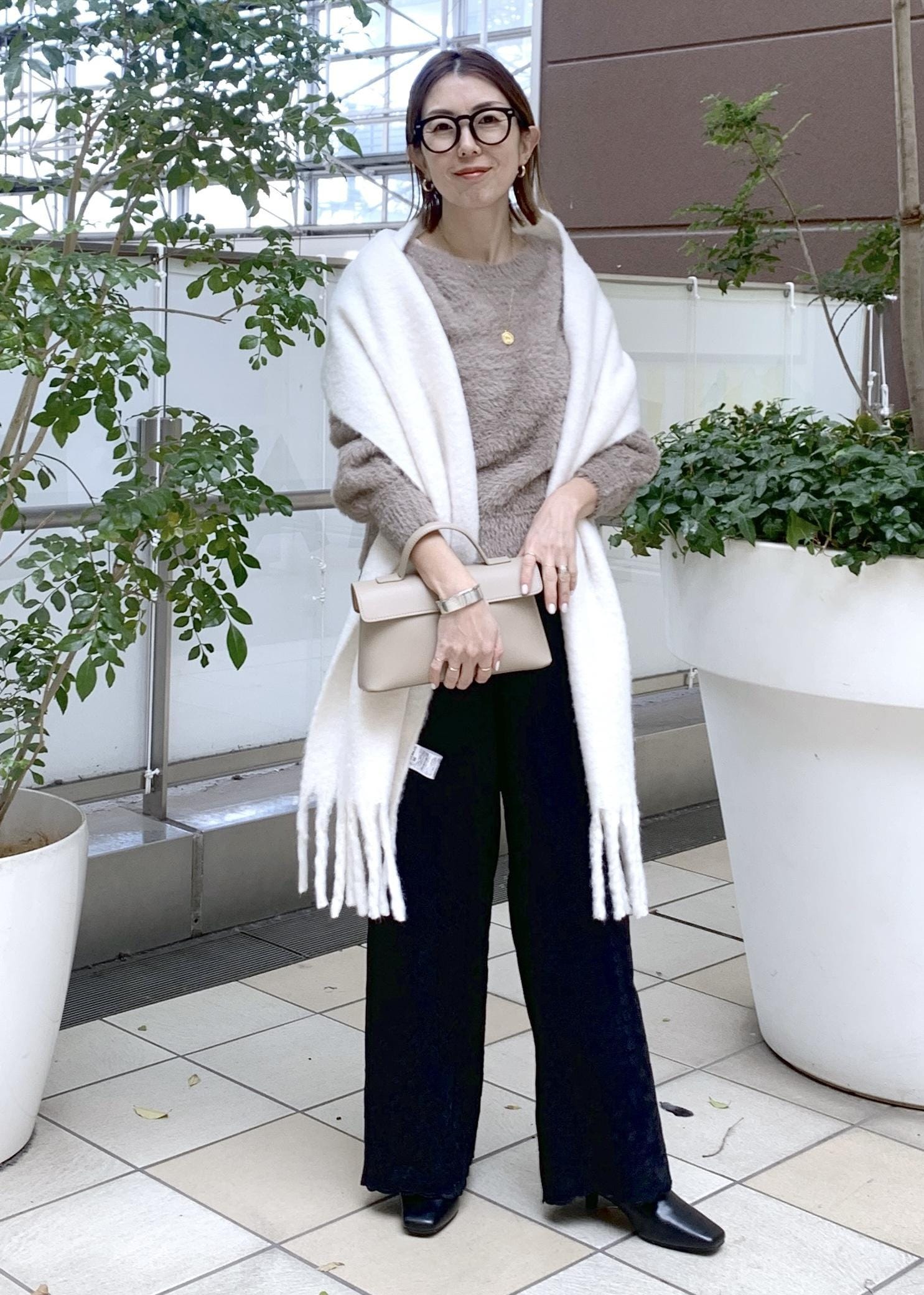 きらっとしたショートフェザーニットプルオーバーのシンプルスタイリング