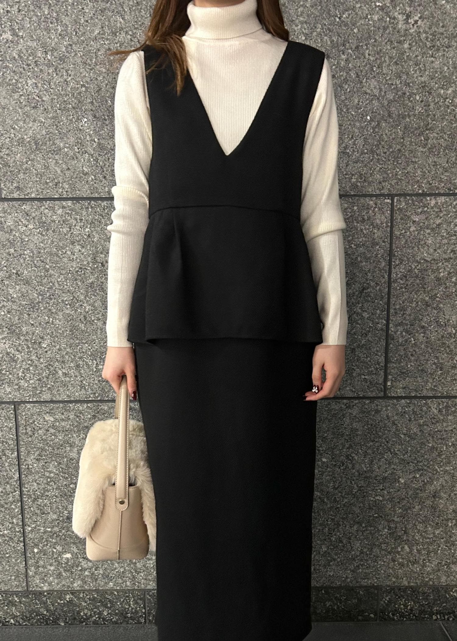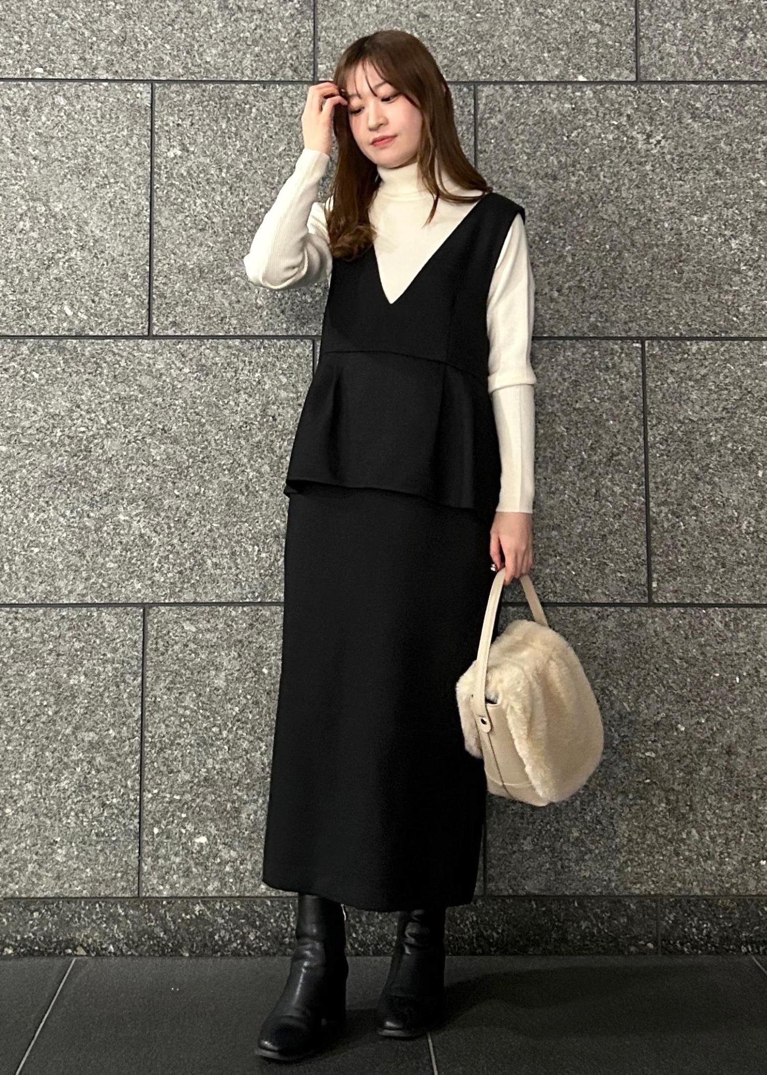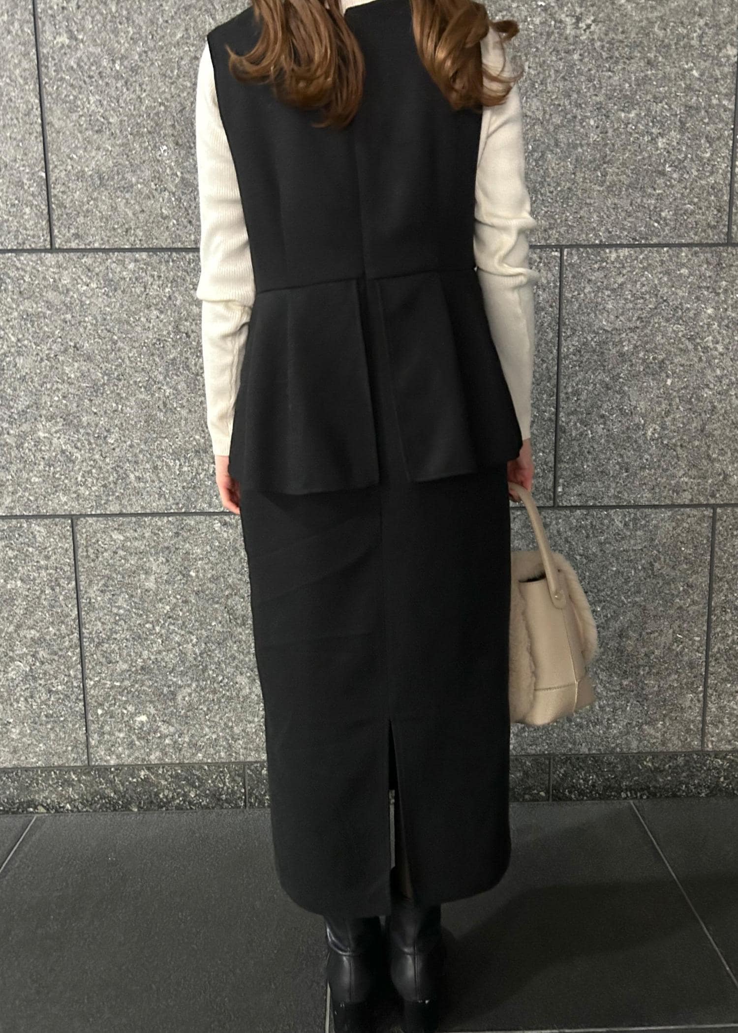 腰回りの広がったペプラムデザインのワンピースが女性らしい大人キレイめコーデに見せてくれます!