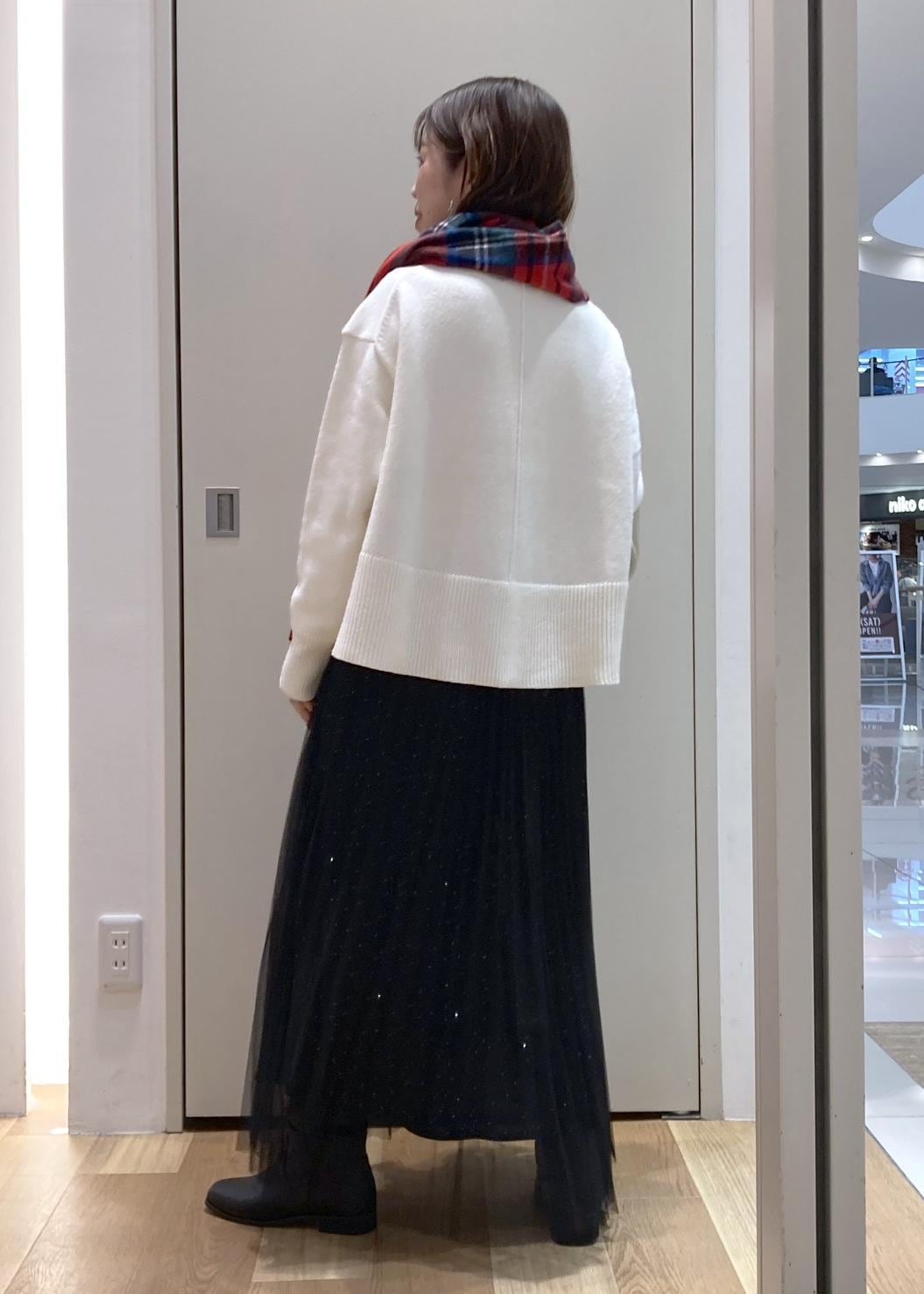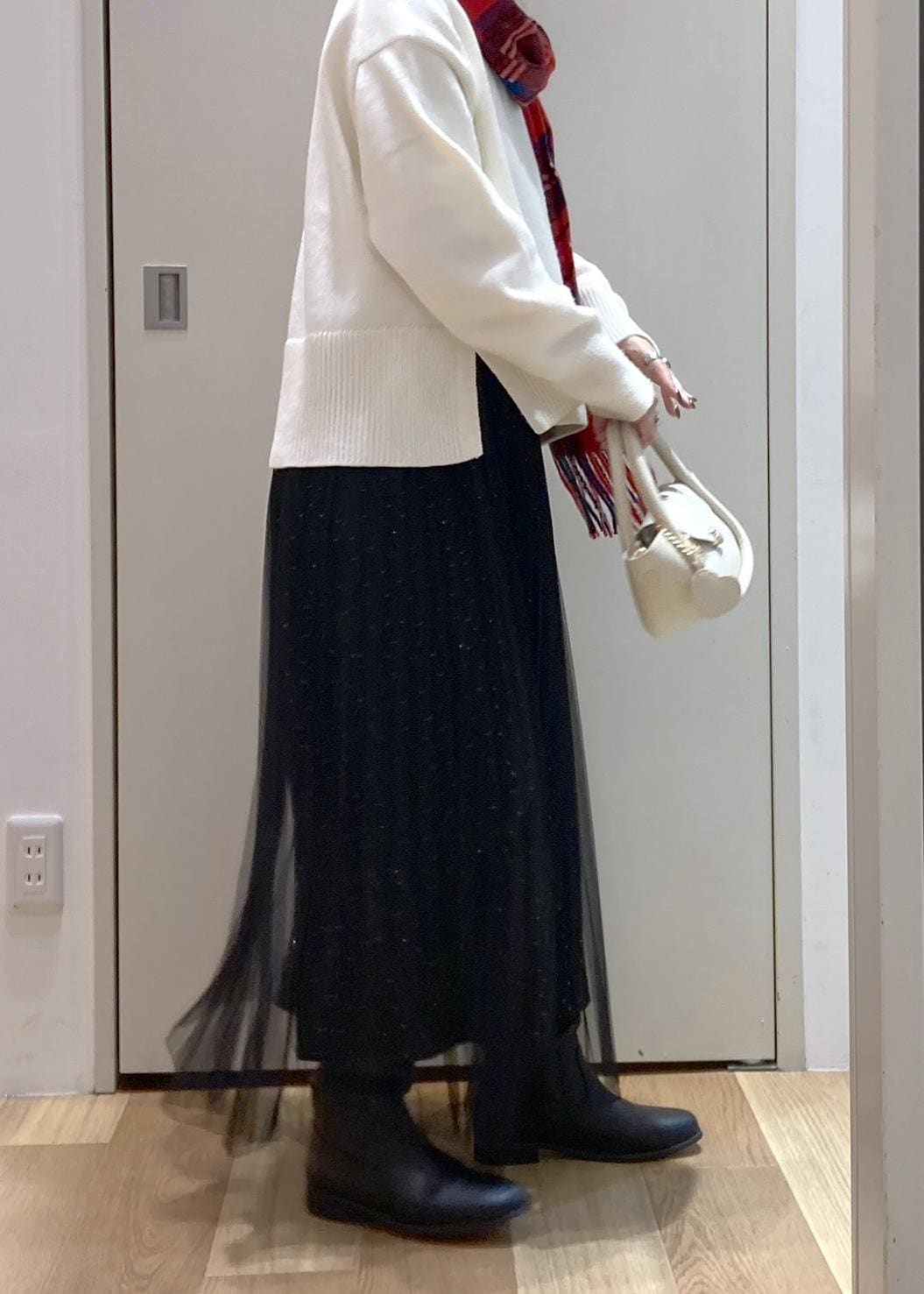キラキラスカートが引き立つよつようにトップスはシンプルなニットを選びました。