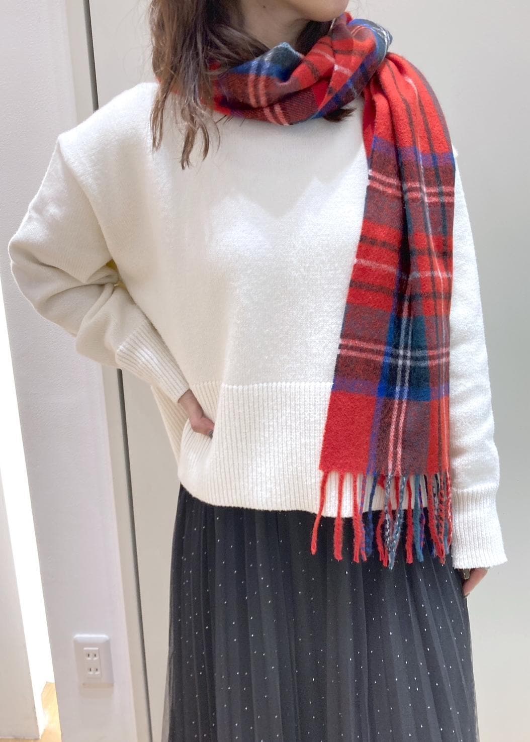 秋冬らしいチェックストールをプラスして、ワンポイントにしてます。