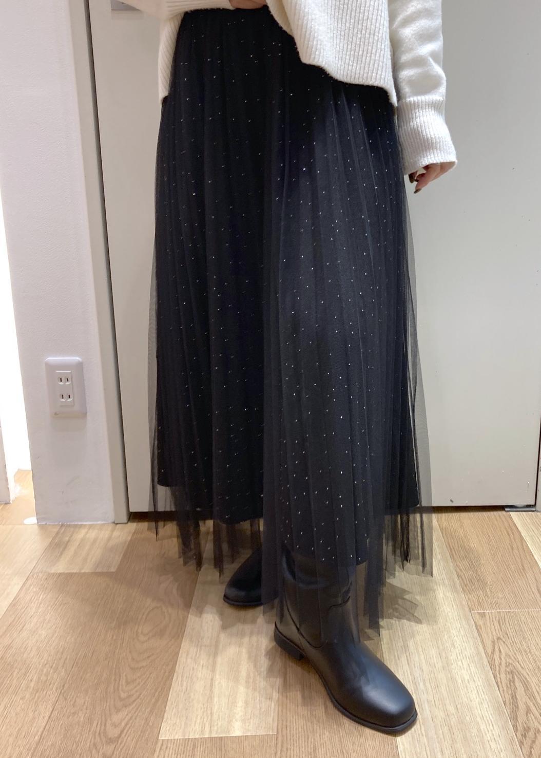 ROPÉ PICNICキラキラチュールプリーツスカート/着丈が選べるブラック / MT¥6,490レビュー157cmでフラットヒールでちょうどいい着丈です。
