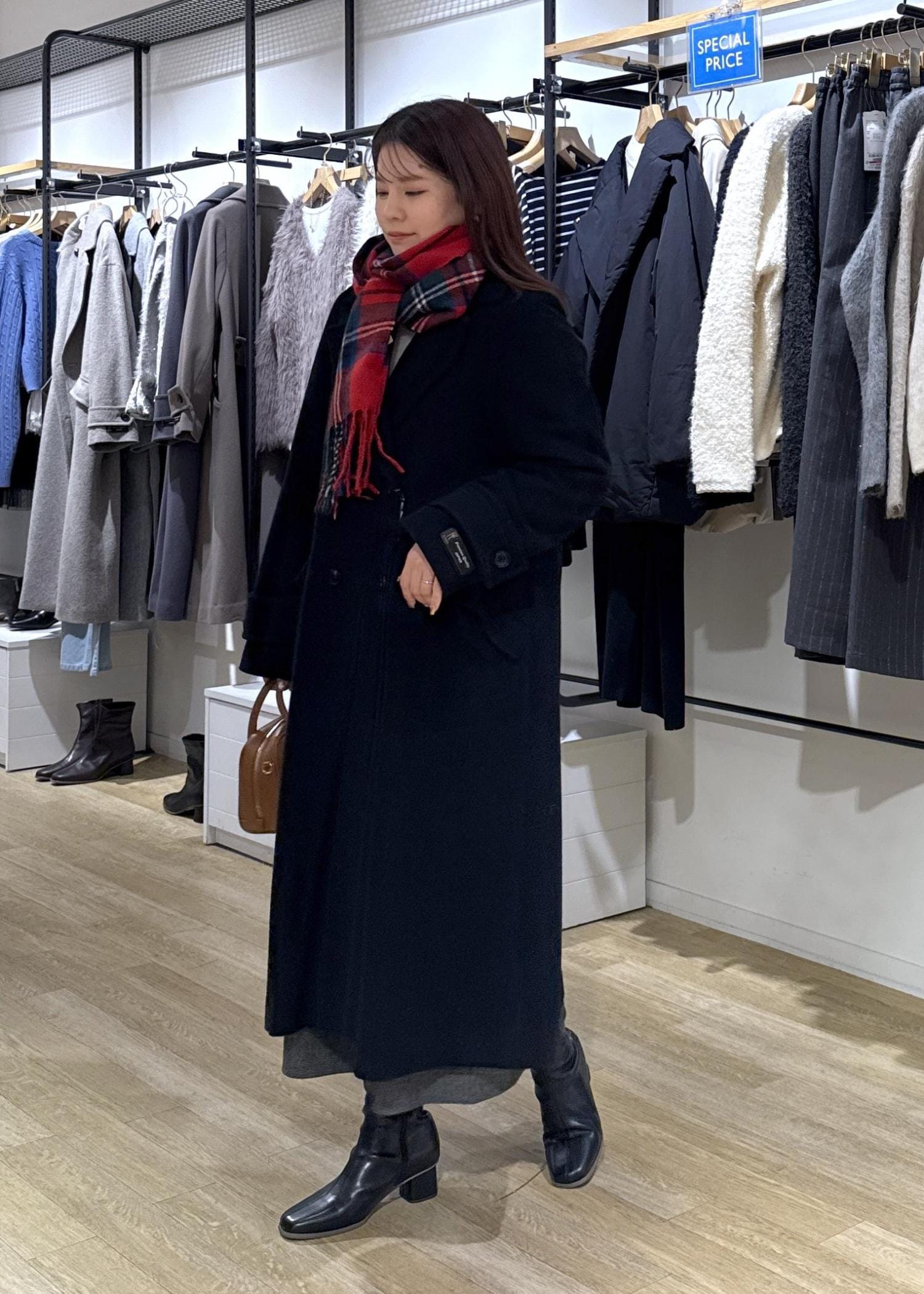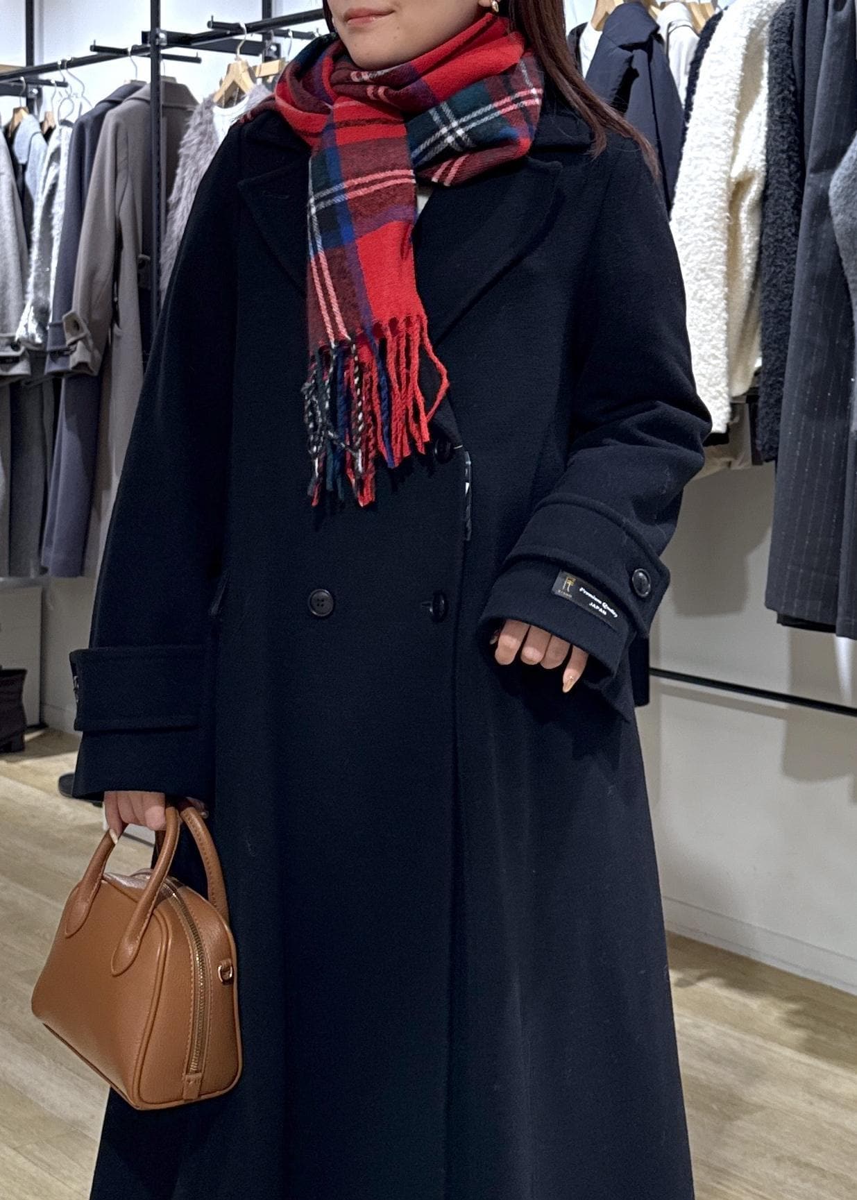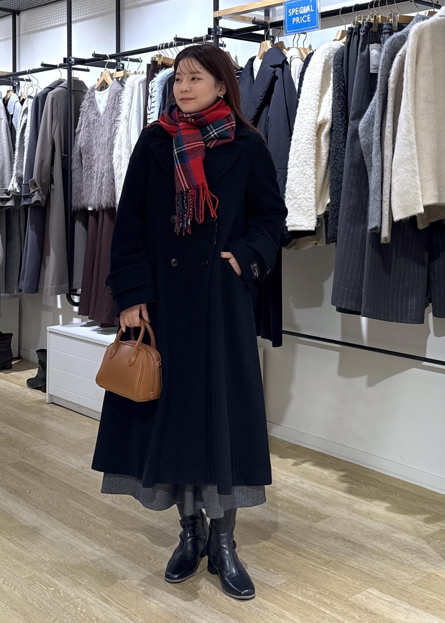 Aラインのきれいなロングコートに王道赤チェックのマフラーをポイントにしてきれいめスカートコーデにしてみました!