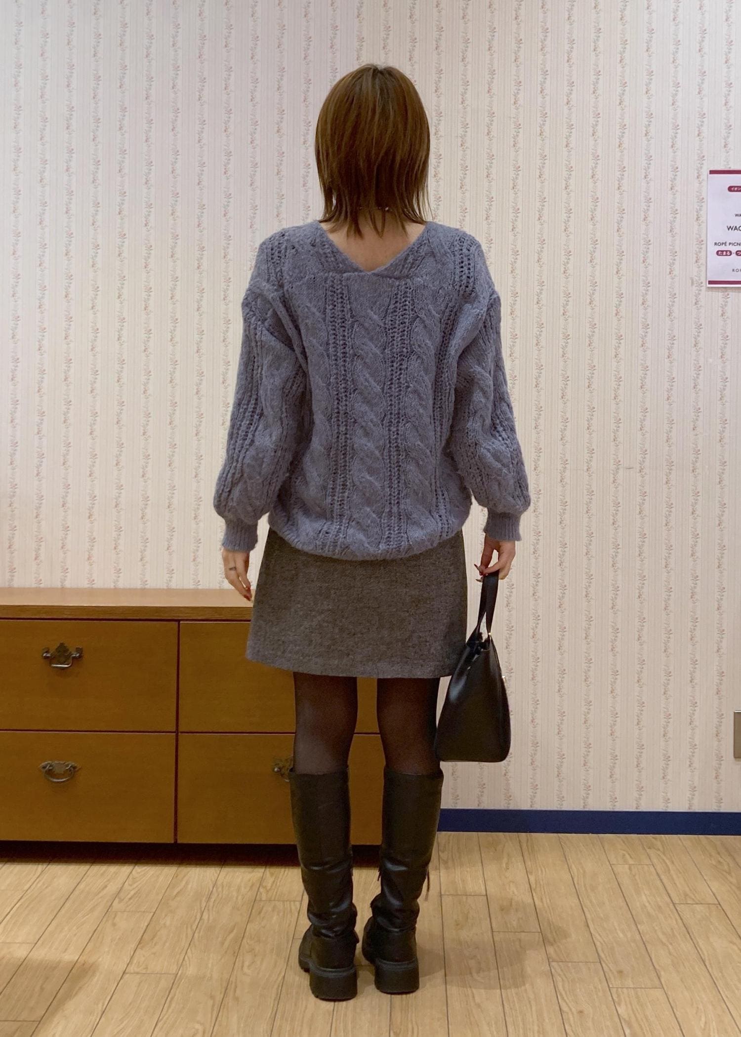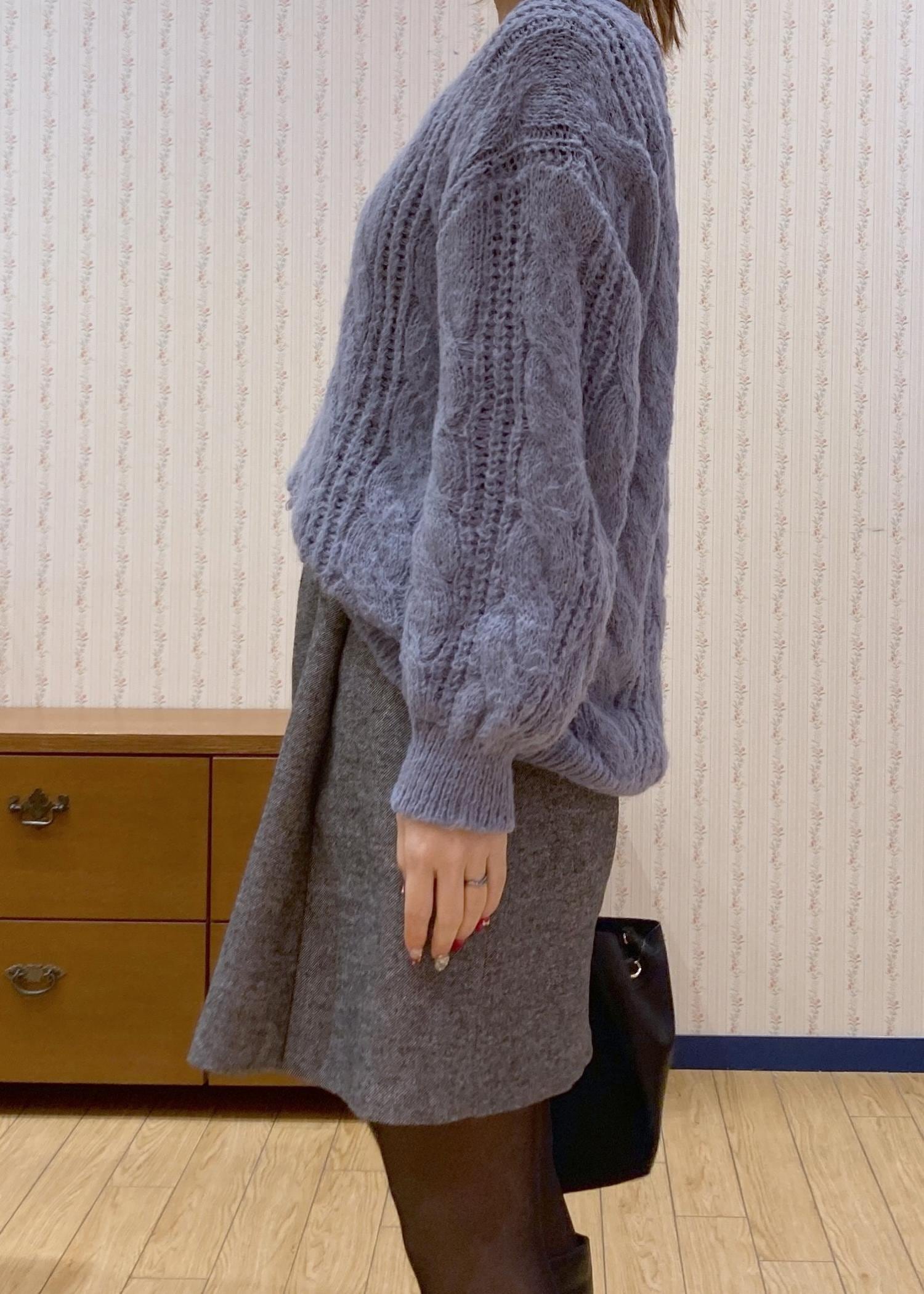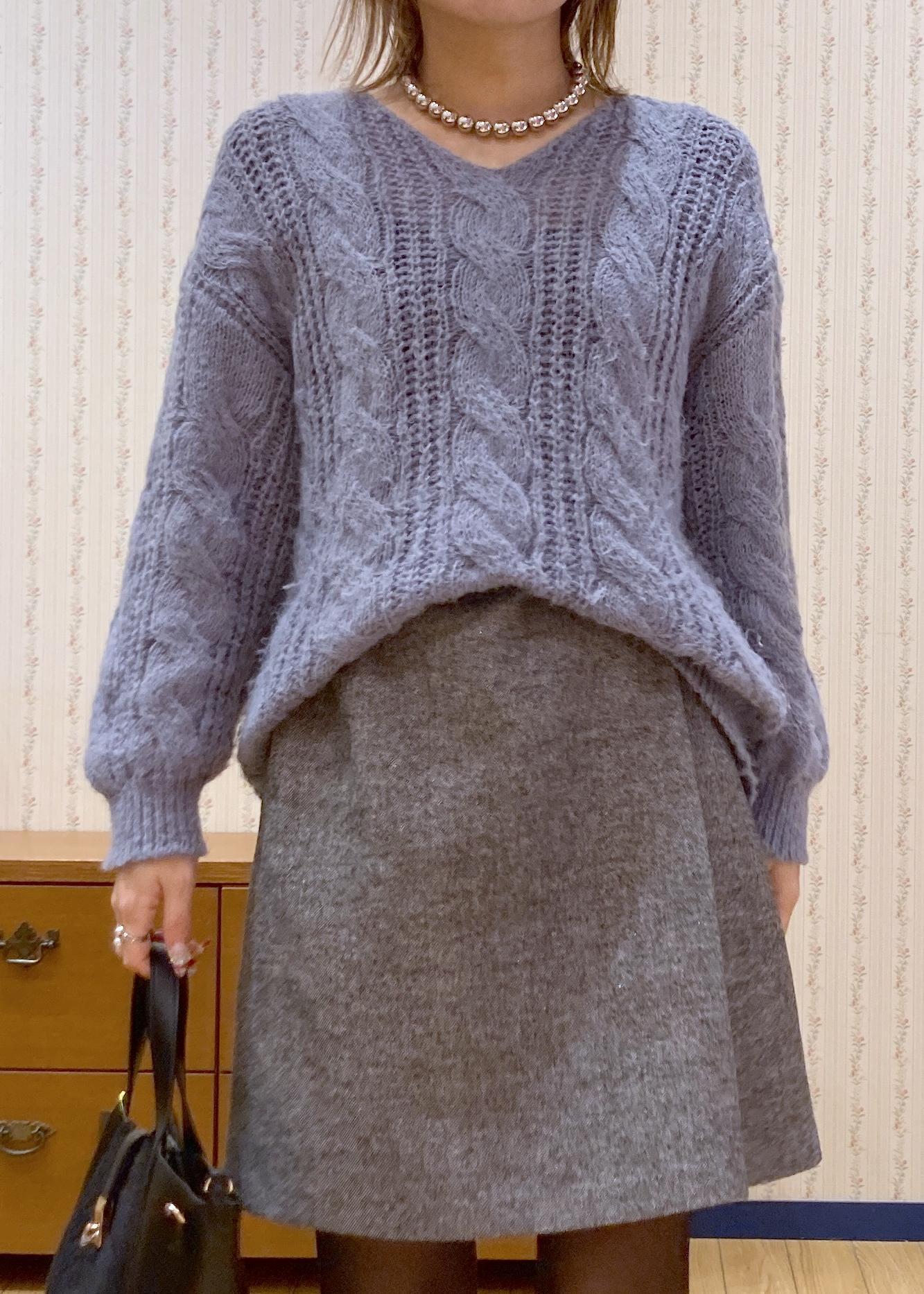 スッキリしたVネックとゆったりとしたシルエットのケーブル編みニットです。