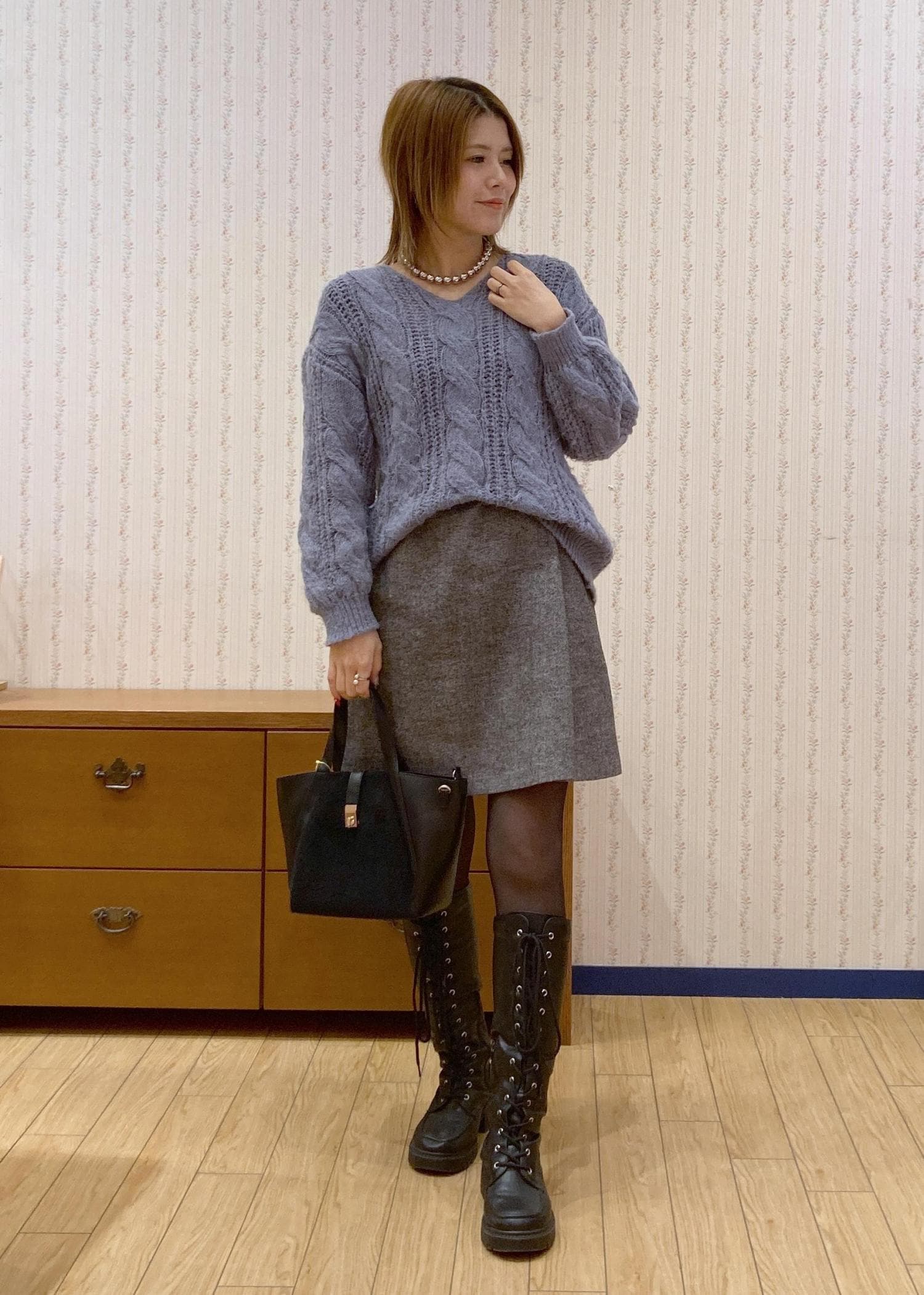 ゆるっとしたブルーのニットにミニスカートをあわせた大人かわいいコーディネートです!